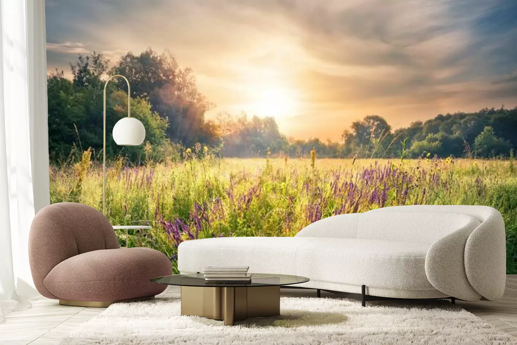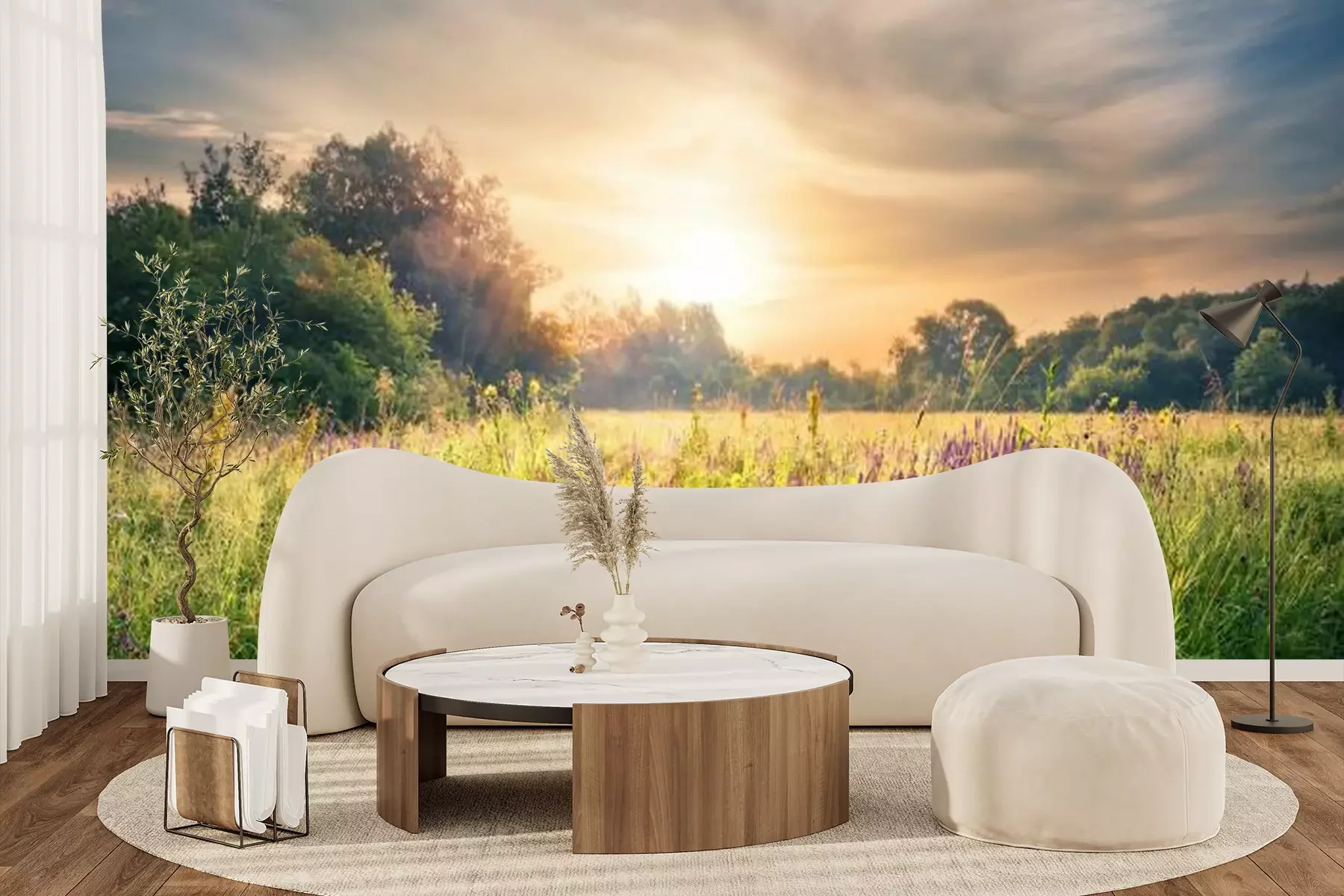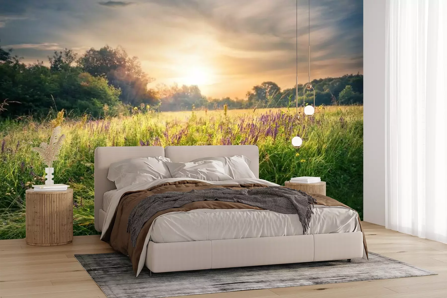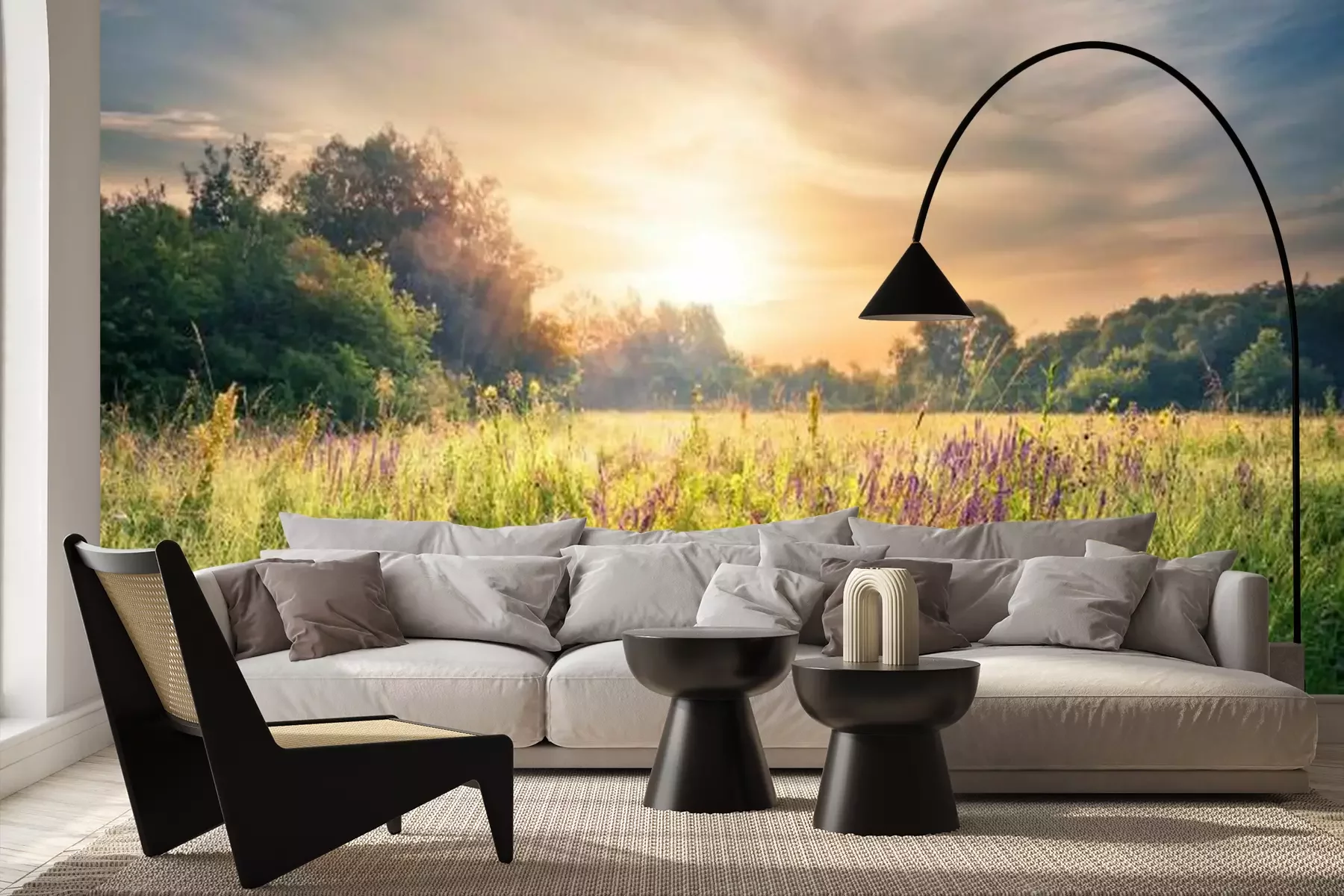 Fotobehang Een bloemenweide in het licht van de ochtendzon