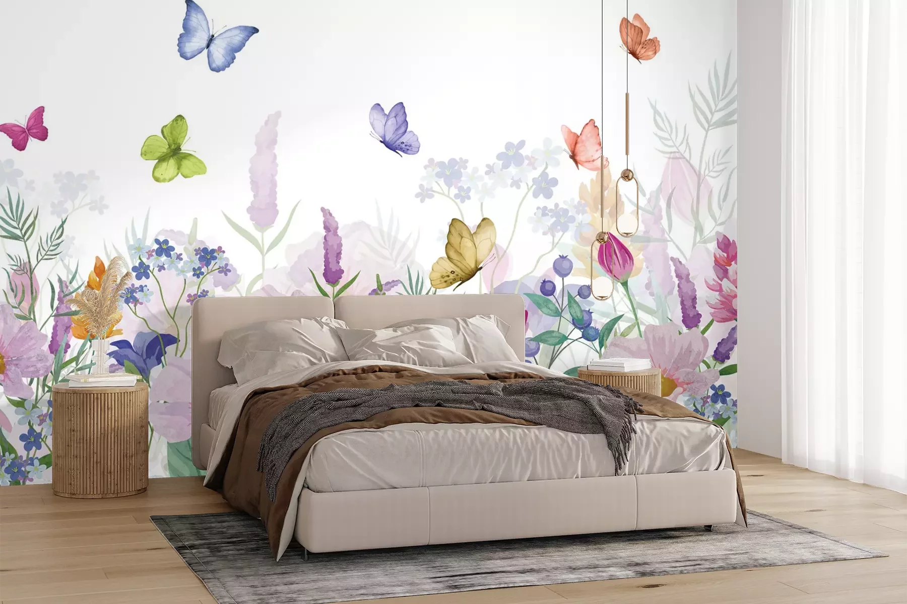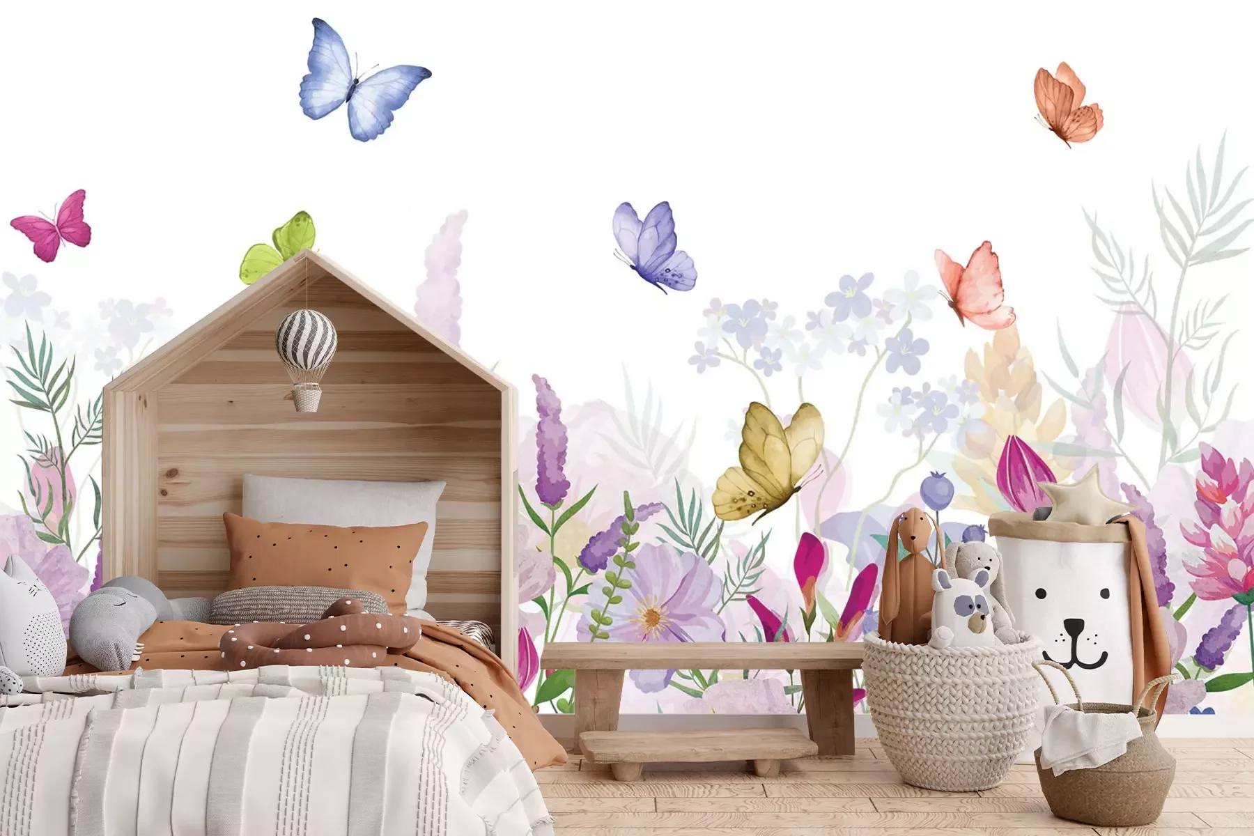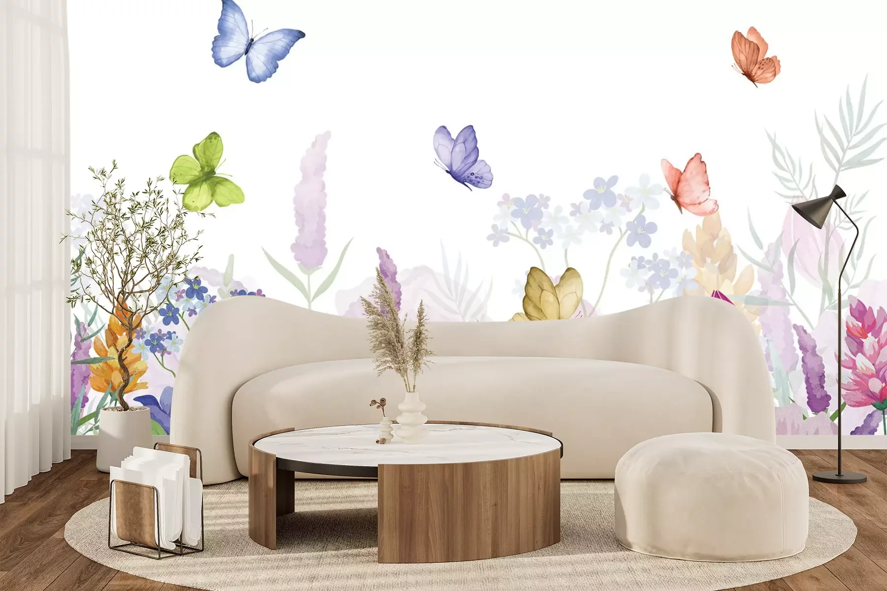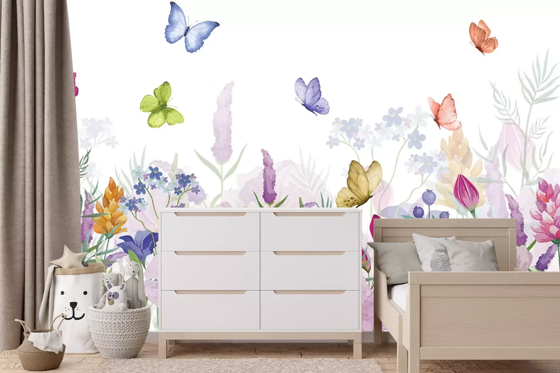 Een bloemenweide met kleurrijke vlinders op een witte achtergrond, een delicaat patroon.