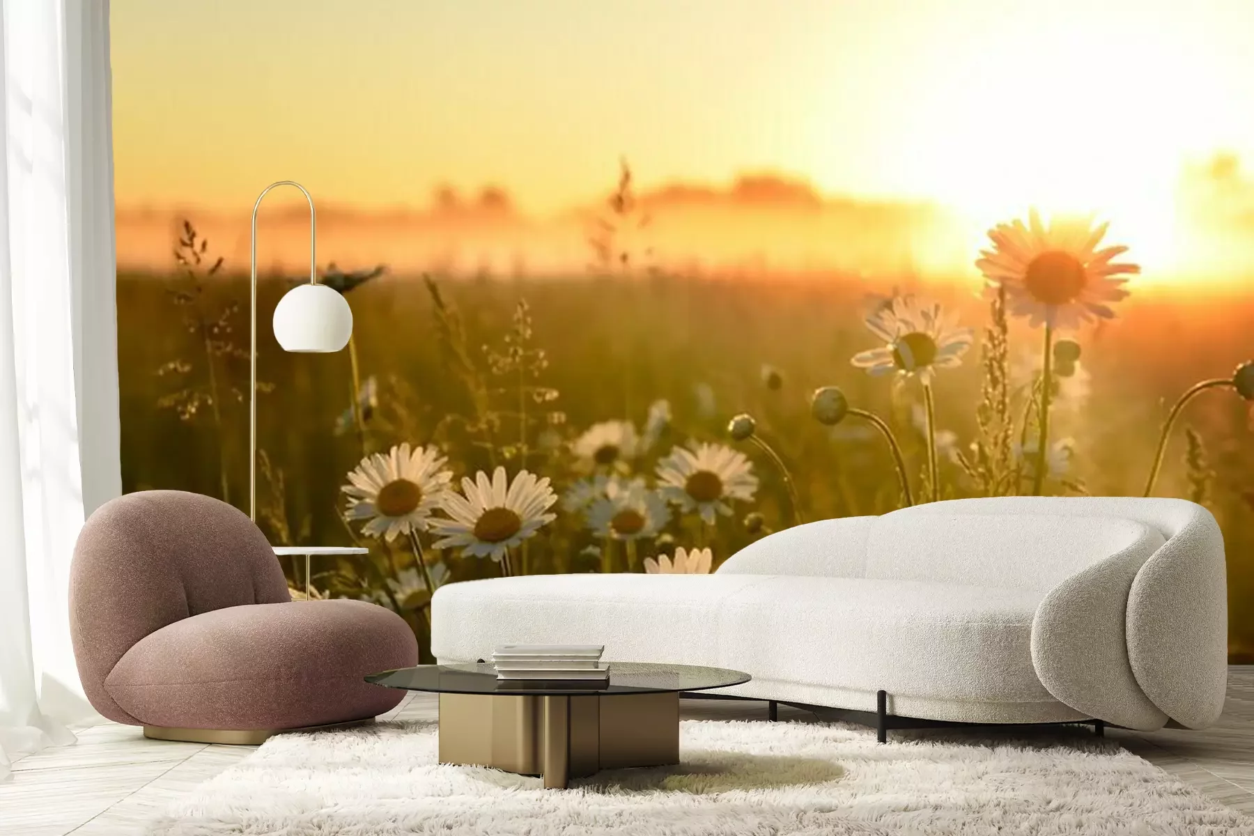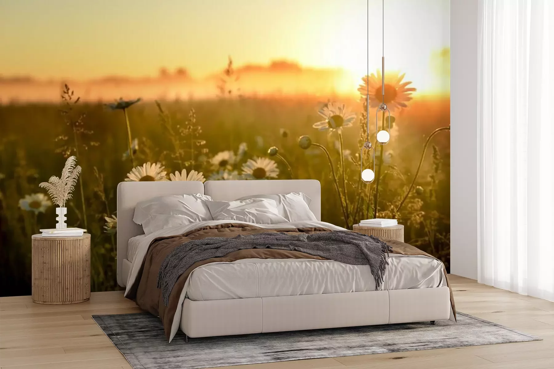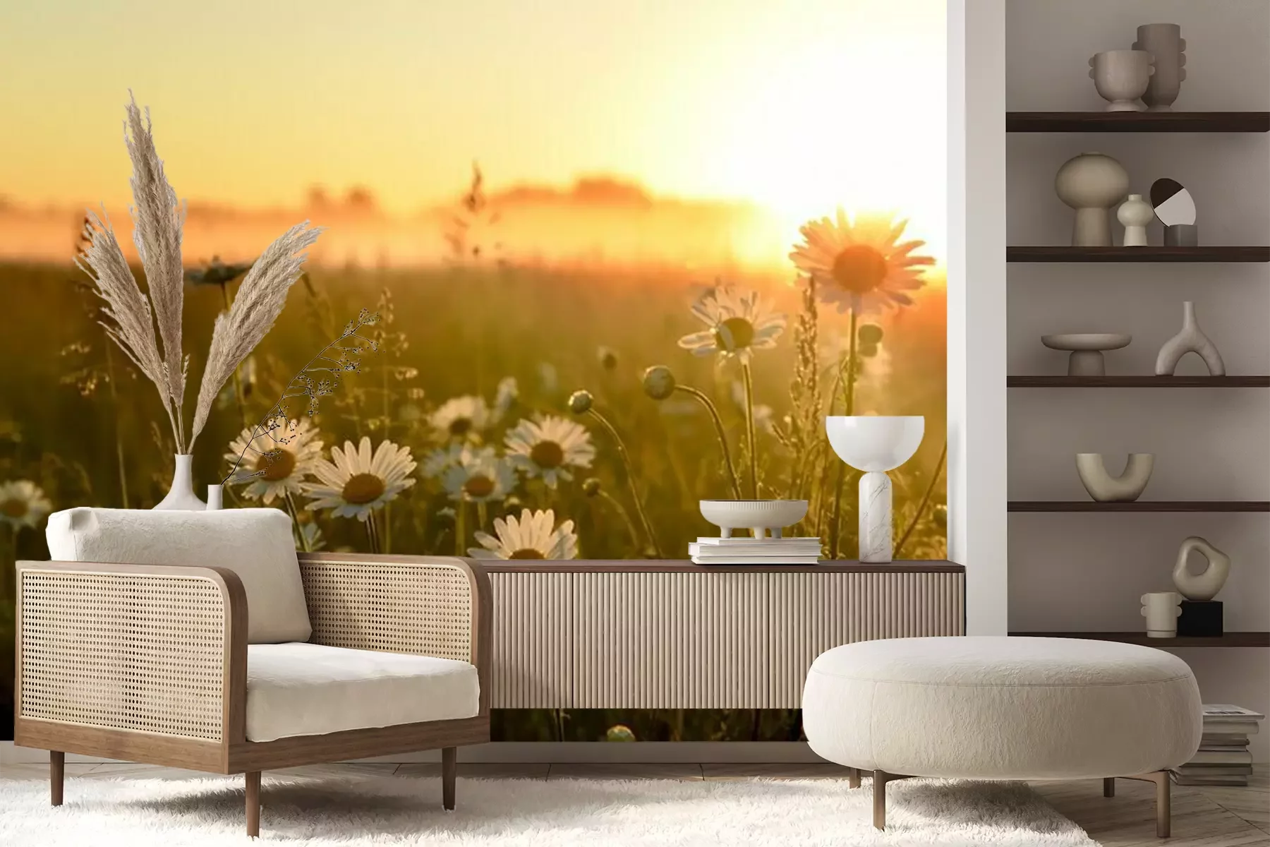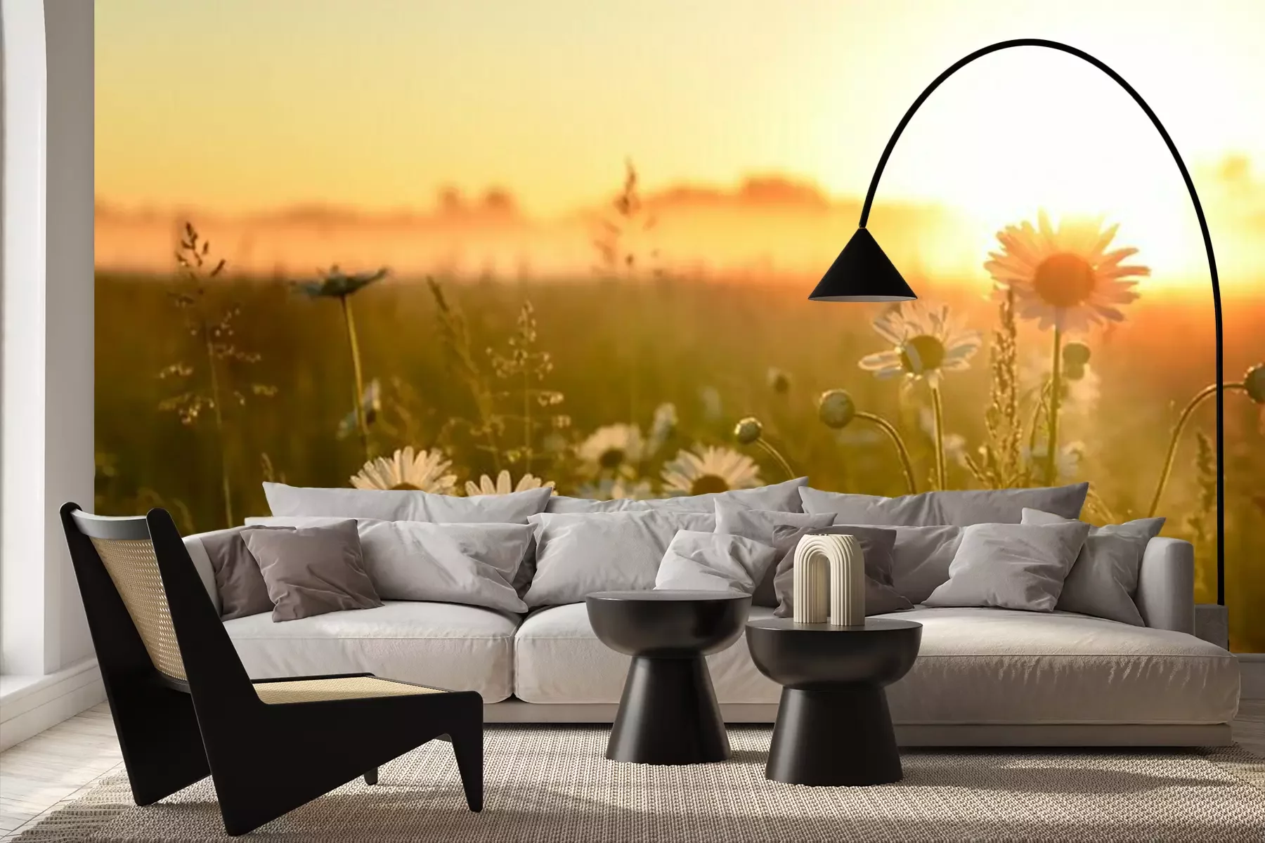 Fotobehang Een bloemrijke weide bij zonsondergang