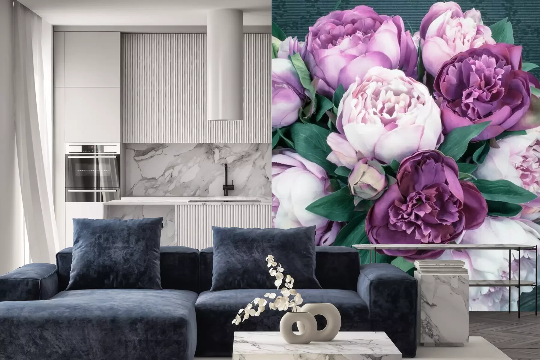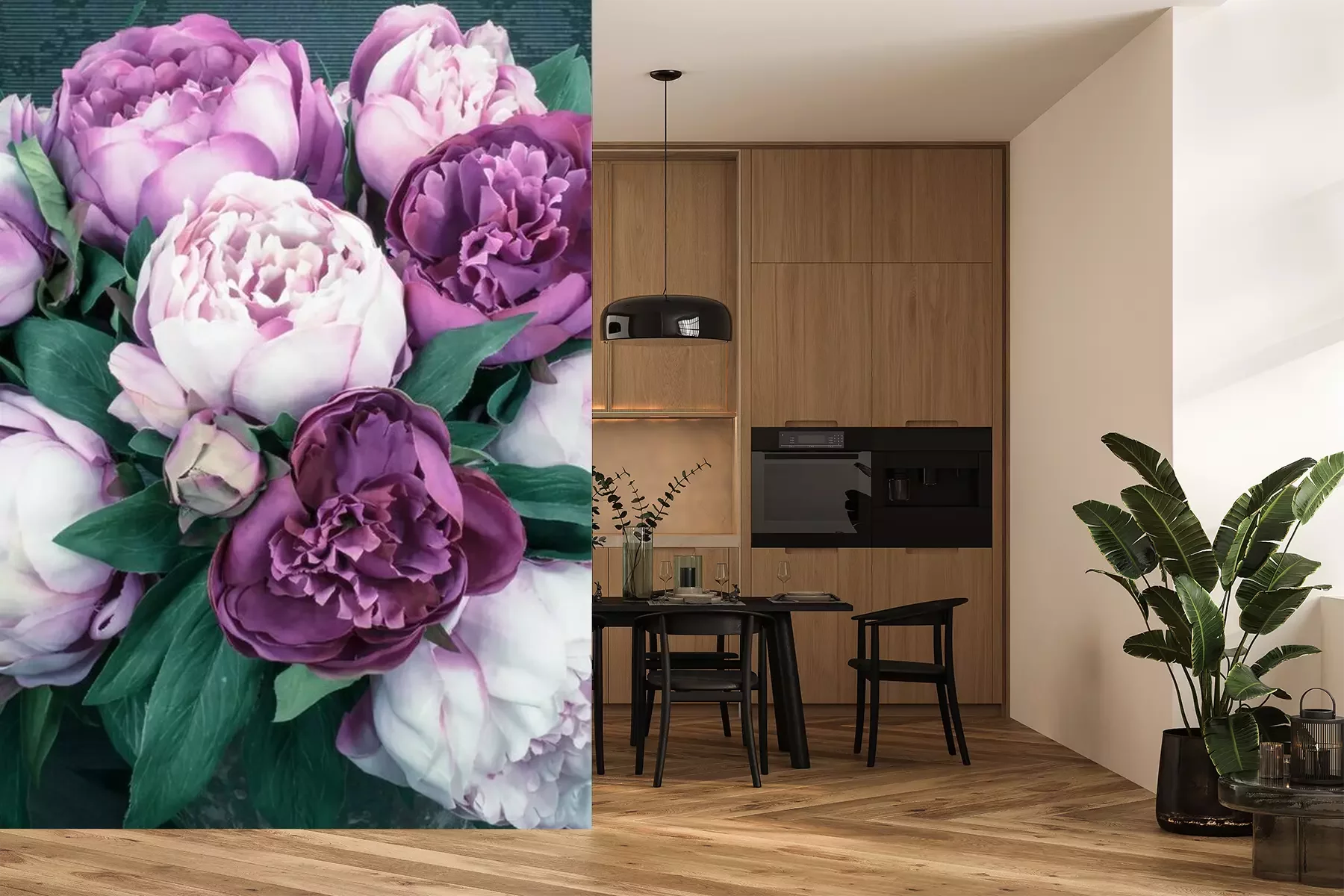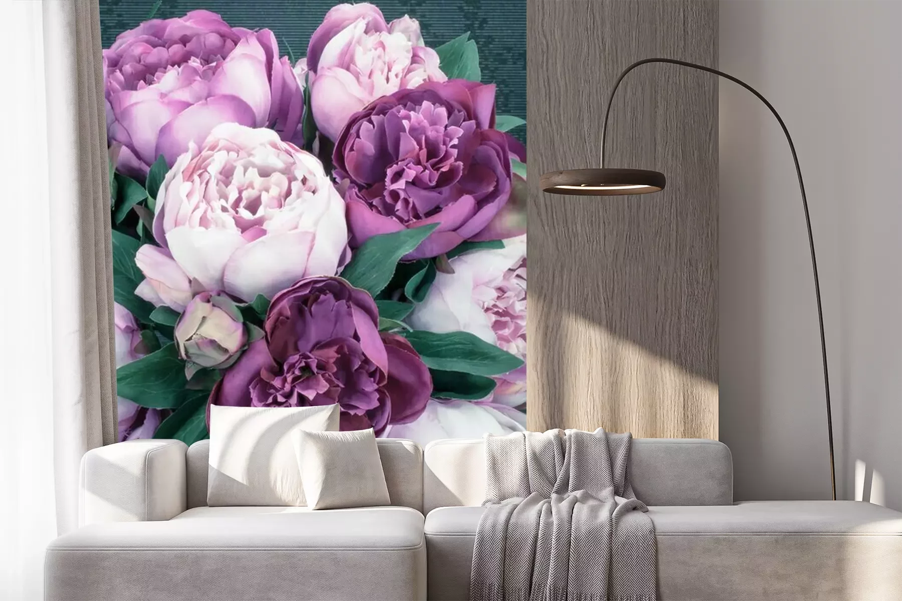 Fotobehang Een boeket weelderige paarse pioenrozen