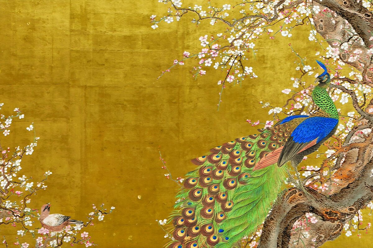 Fotobehang: Een charmante pauw tussen de kersenbloesems