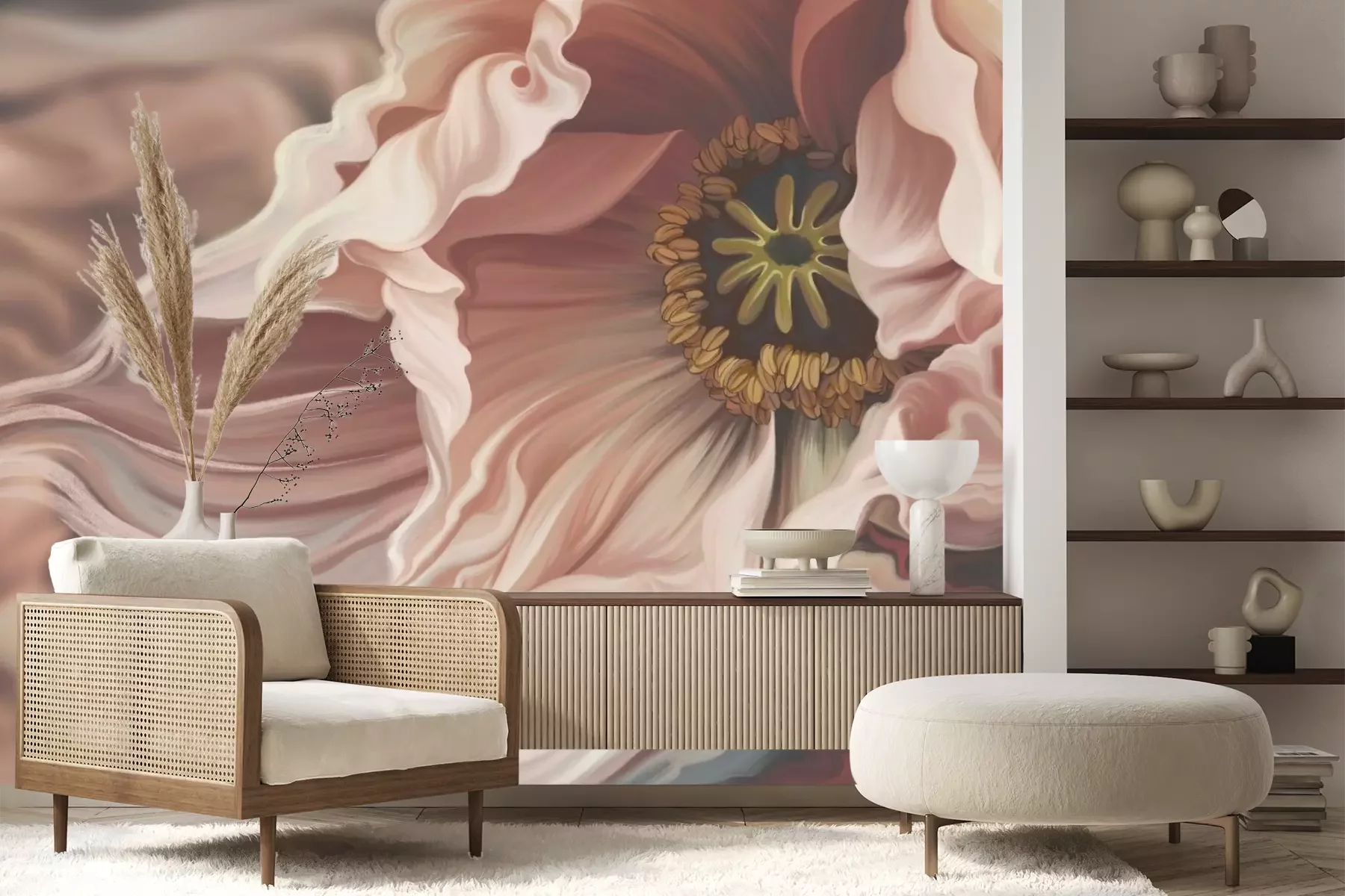 Het materiaal Premium+ is een gestructureerd vinyl op vlies met een gewicht van 255 g/m², dat kleine oneffenheden in de muur effectief camoufleert. De subtiele structuur van fijn zand geeft het oppervlak een exclusieve uitstraling, terwijl de halfmatte afwerking de diepte van de kleuren benadrukt. Het materiaal is dampdoorlatend, waardoor het ook in de keuken en badkamer kan worden gebruikt. De maximale breedte van één baan bedraagt 100 cm – bij grotere afmetingen wordt het fotobehang in meerdere gelijke banen verdeeld. De lijm wordt direct op de muur aangebracht en het behang wordt rand-aan-rand geplakt, wat zorgt voor een esthetisch resultaat zonder zichtbare naden. Het oppervlak kan gemakkelijk worden schoongemaakt door het voorzichtig af te nemen met een vochtige doek.