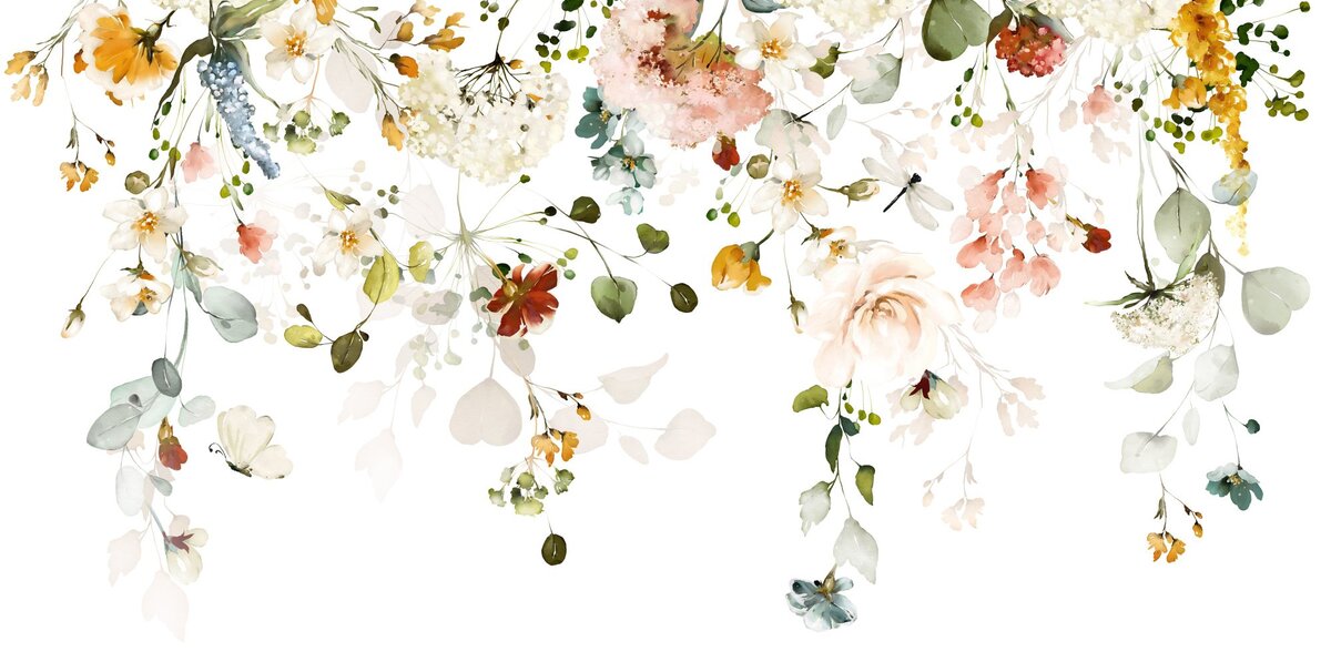 Fotobehang: Een compositie van aquarelbloemen en bladeren