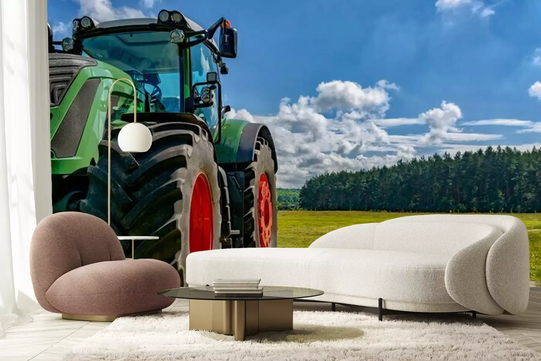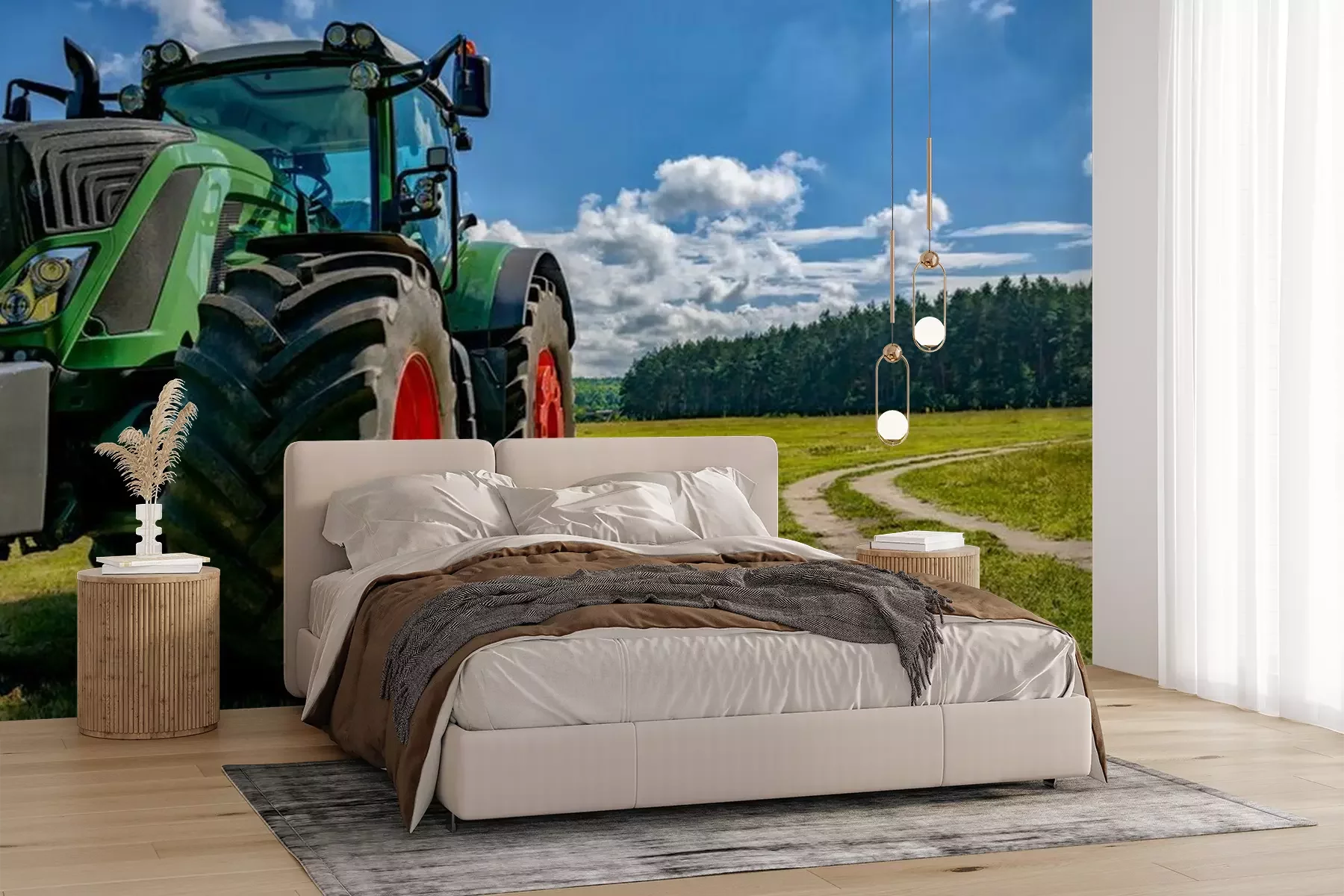 Fotobehang Een deel van de trekker zich op een gebied in de buurt van de weg.