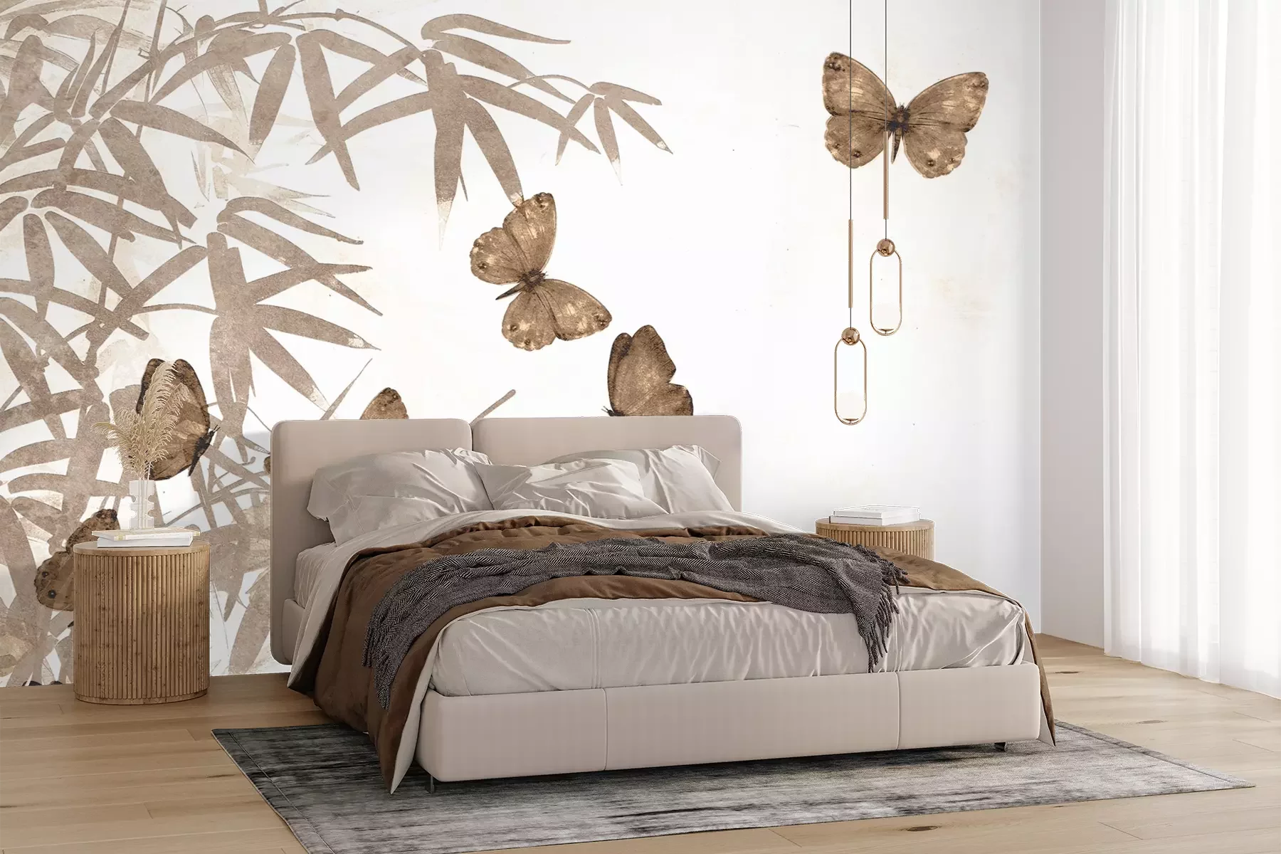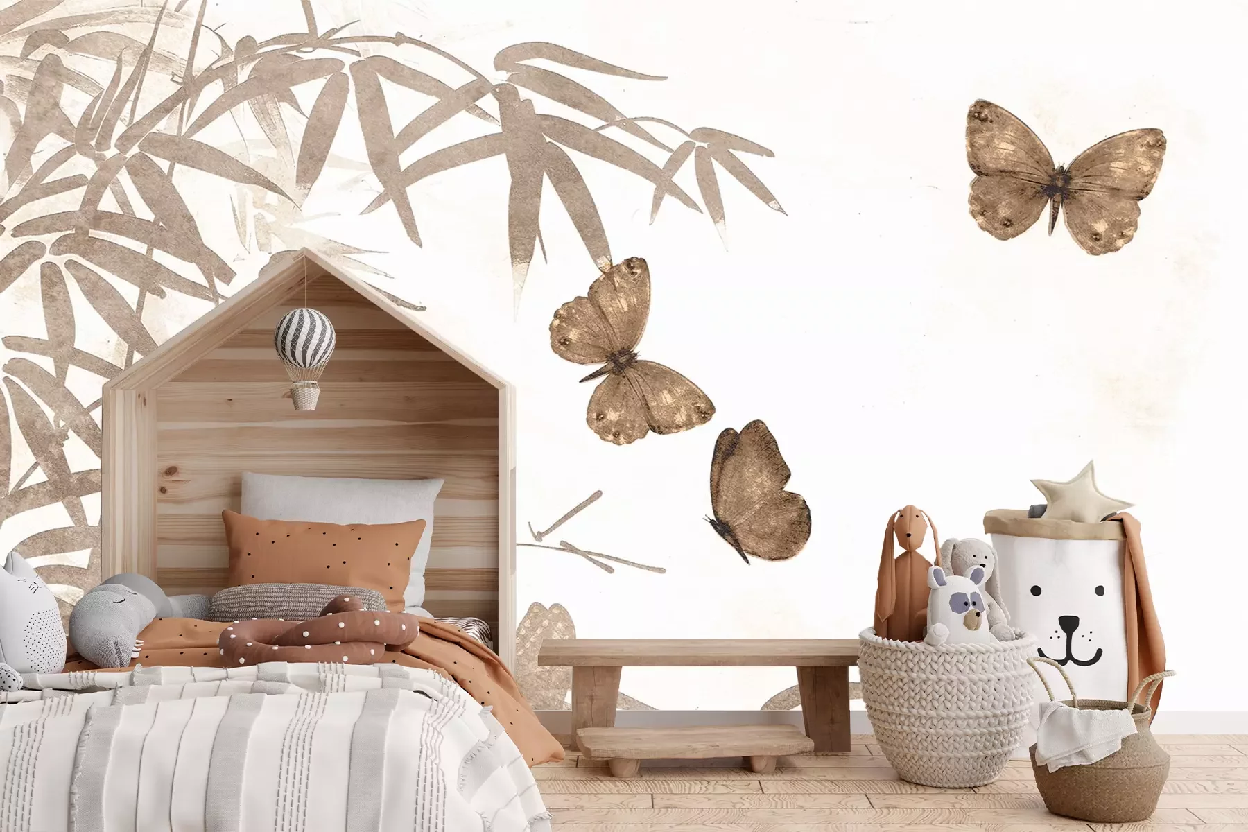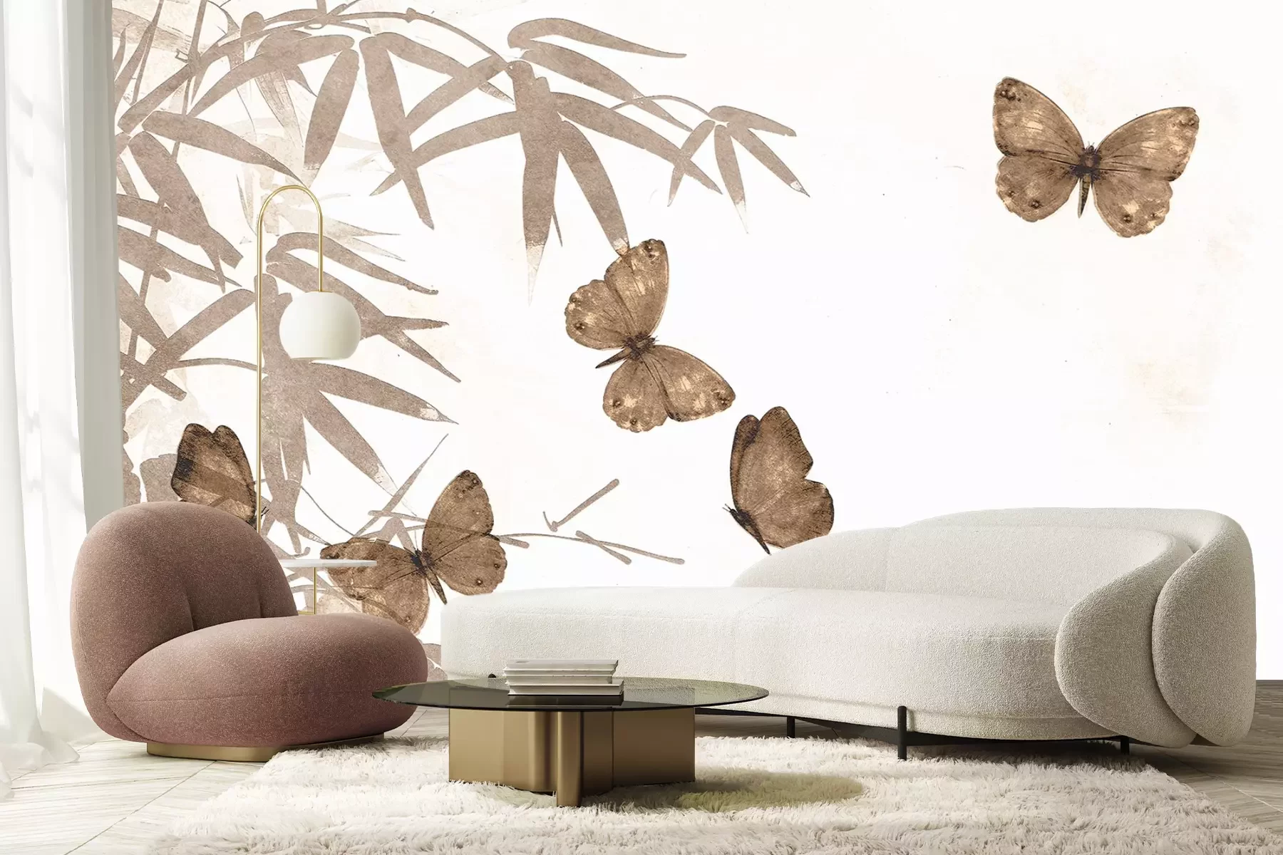 Een delicaat aquarelpatroon van beige vlinders en bamboe op een lichte achtergrond.