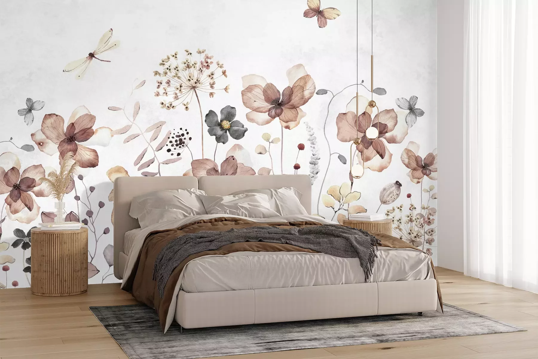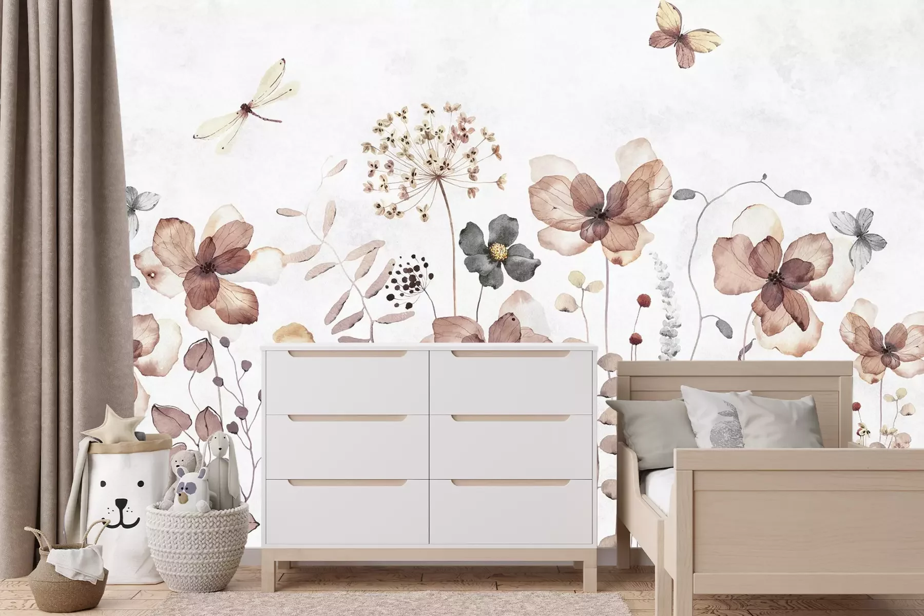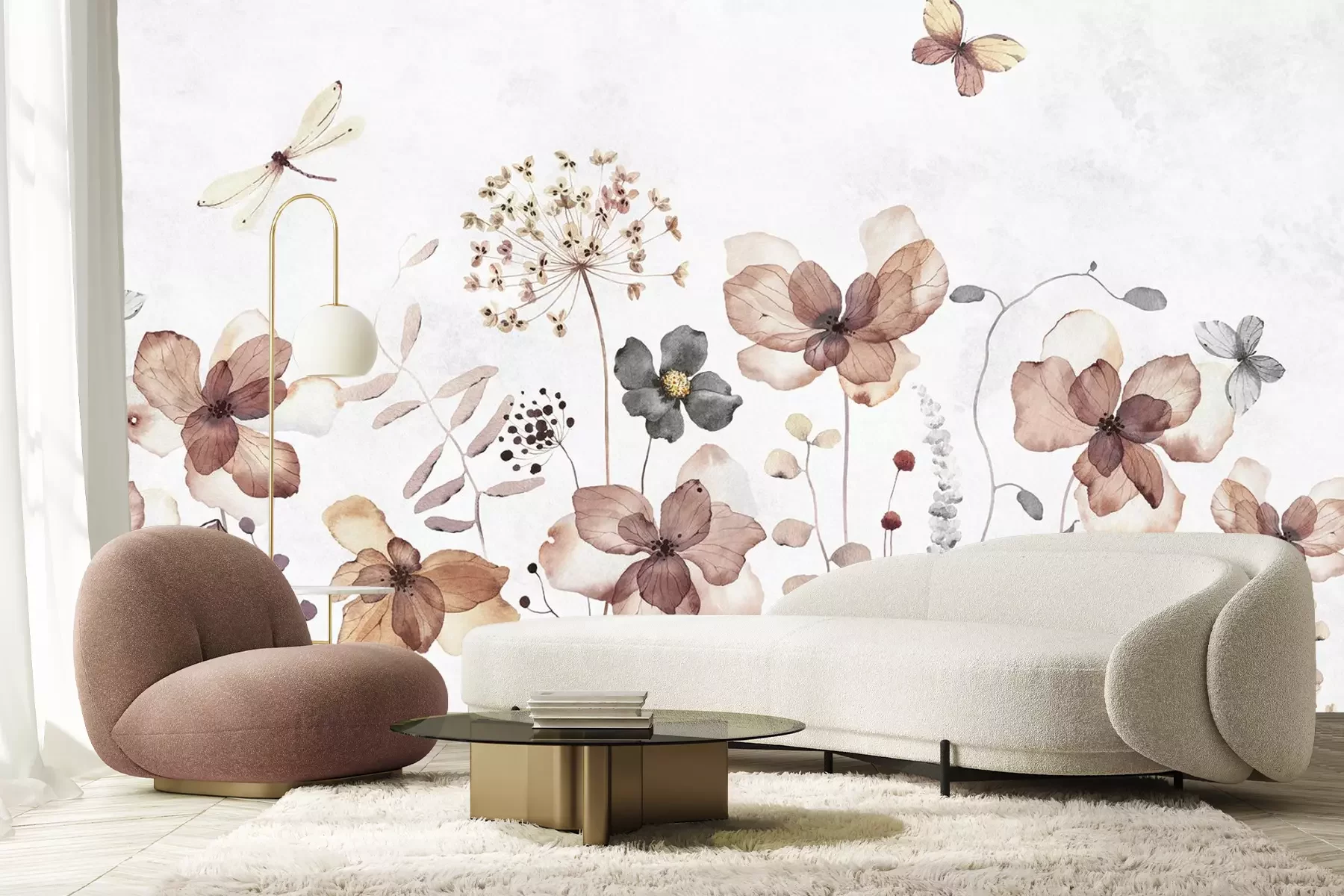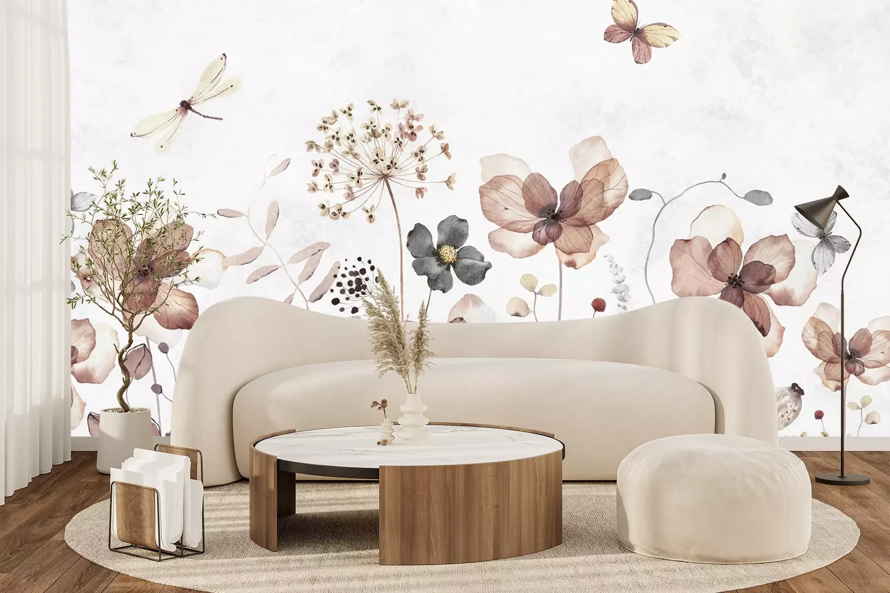 Een delicaat patroon van aquarelwilde bloemen met vlinders en libellen op een lichte achtergrond.