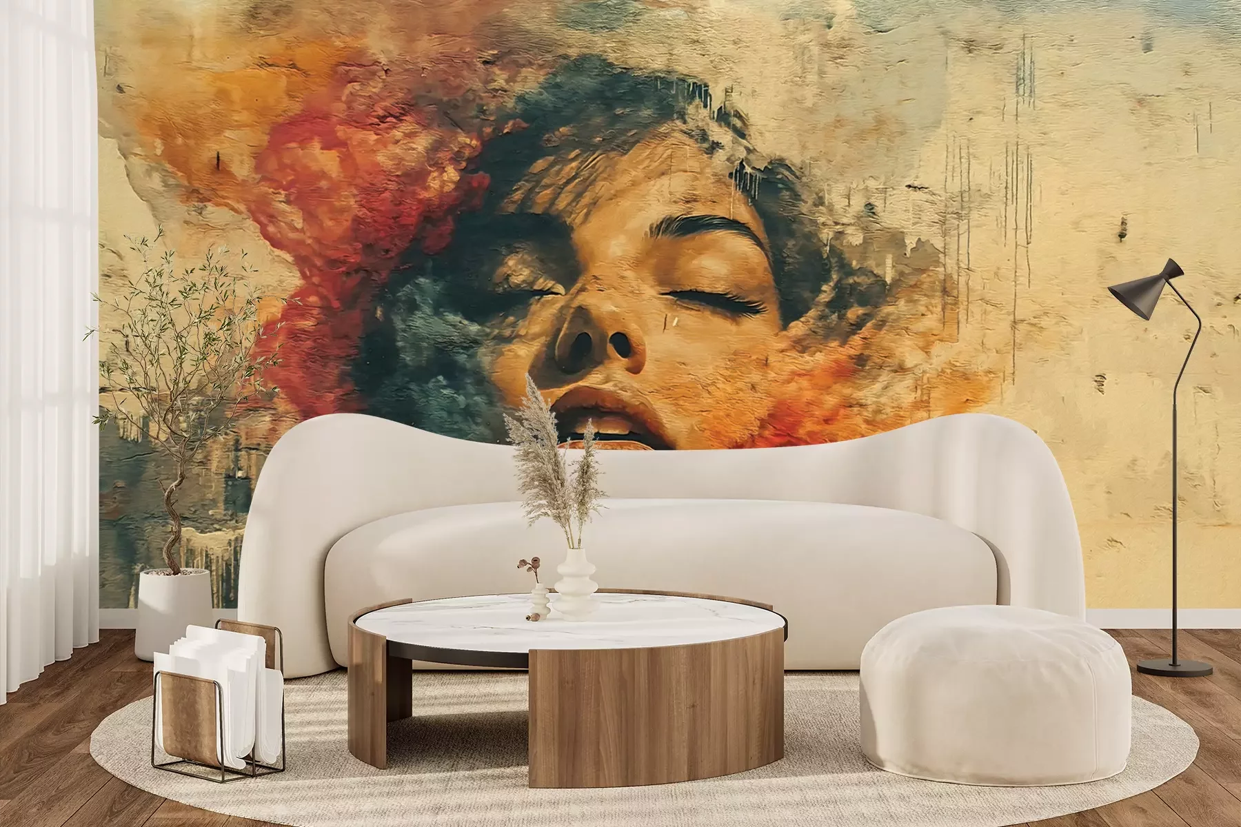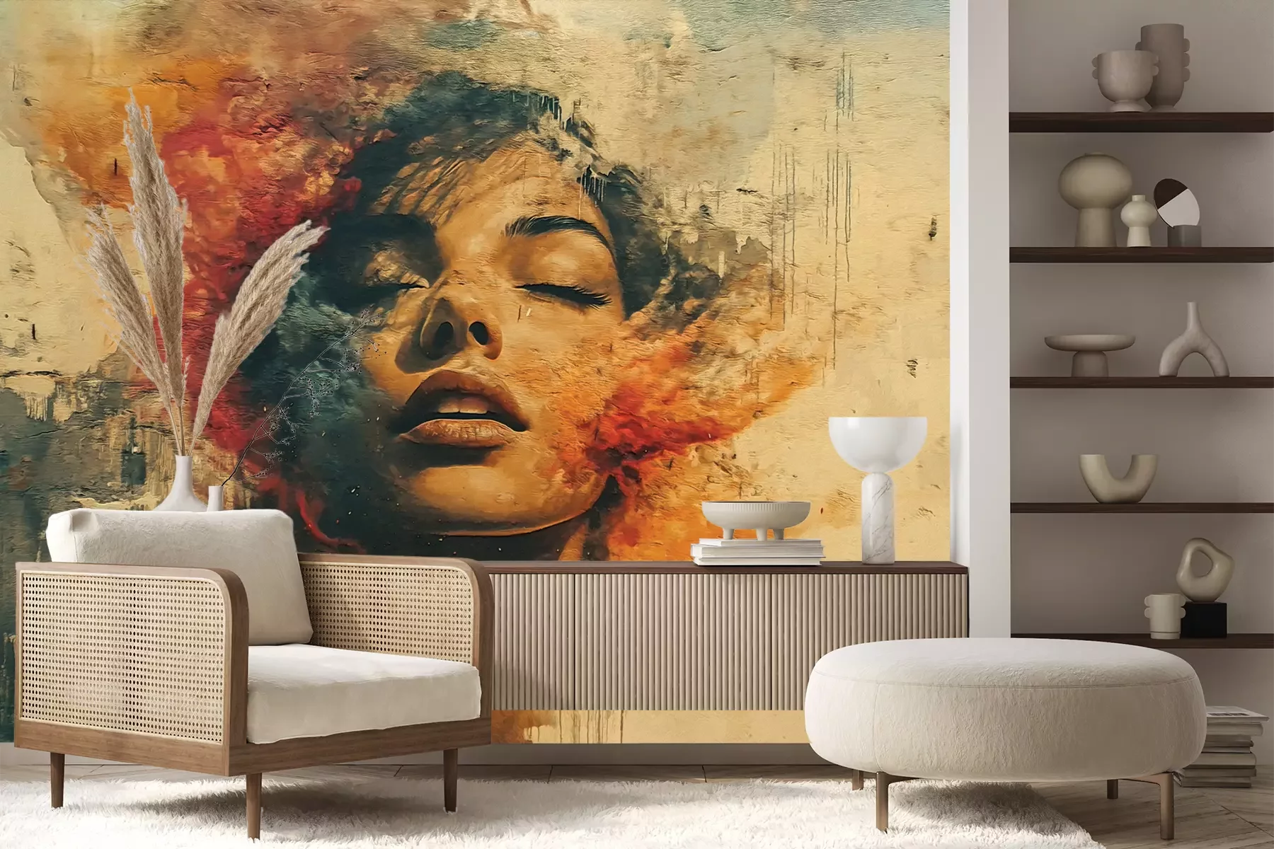 Het materiaal Premium+ is een gestructureerd vinyl op vlies met een gewicht van 255 g/m², dat kleine oneffenheden in de muur effectief camoufleert. De subtiele structuur van fijn zand geeft het oppervlak een exclusieve uitstraling, terwijl de halfmatte afwerking de diepte van de kleuren benadrukt. Het materiaal is dampdoorlatend, waardoor het ook in de keuken en badkamer kan worden gebruikt. De maximale breedte van één baan bedraagt 100 cm – bij grotere afmetingen wordt het fotobehang in meerdere gelijke banen verdeeld. De lijm wordt direct op de muur aangebracht en het behang wordt rand-aan-rand geplakt, wat zorgt voor een esthetisch resultaat zonder zichtbare naden. Het oppervlak kan gemakkelijk worden schoongemaakt door het voorzichtig af te nemen met een vochtige doek.
