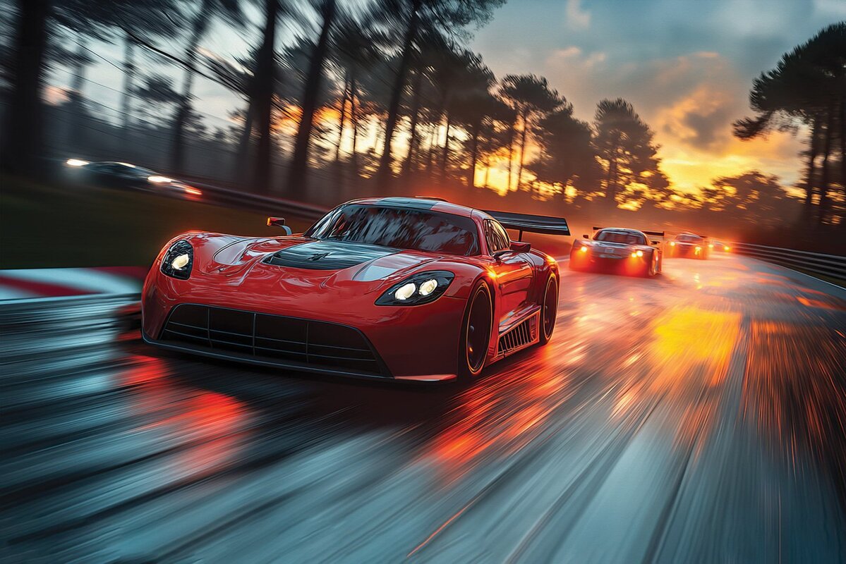 Fotobehang: Een dynamische sportwagenrace bij zonsondergang