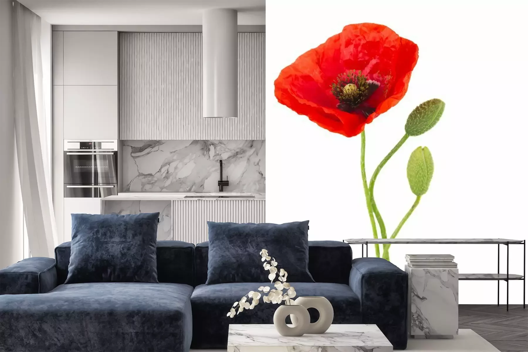 Het materiaal Premium is een glad vinyl op vlies, dat bestand is tegen uitrekken en vervorming. Het is dampdoorlatend – de muren kunnen vrij ademen – waardoor het geschikt is voor gebruik in de keuken en badkamer. Bij vervuiling kan het materiaal worden afgenomen met een vochtige doek. De maximale breedte van één baan bedraagt 95 of 105 cm, afhankelijk van de beschikbaarheid. Montage vindt plaats met de rand-aan-rand methode, wat een esthetisch resultaat zonder zichtbare naden oplevert. Omdat de lijm rechtstreeks op de muur wordt aangebracht, verloopt de installatie van het fotobehang snel en eenvoudig.