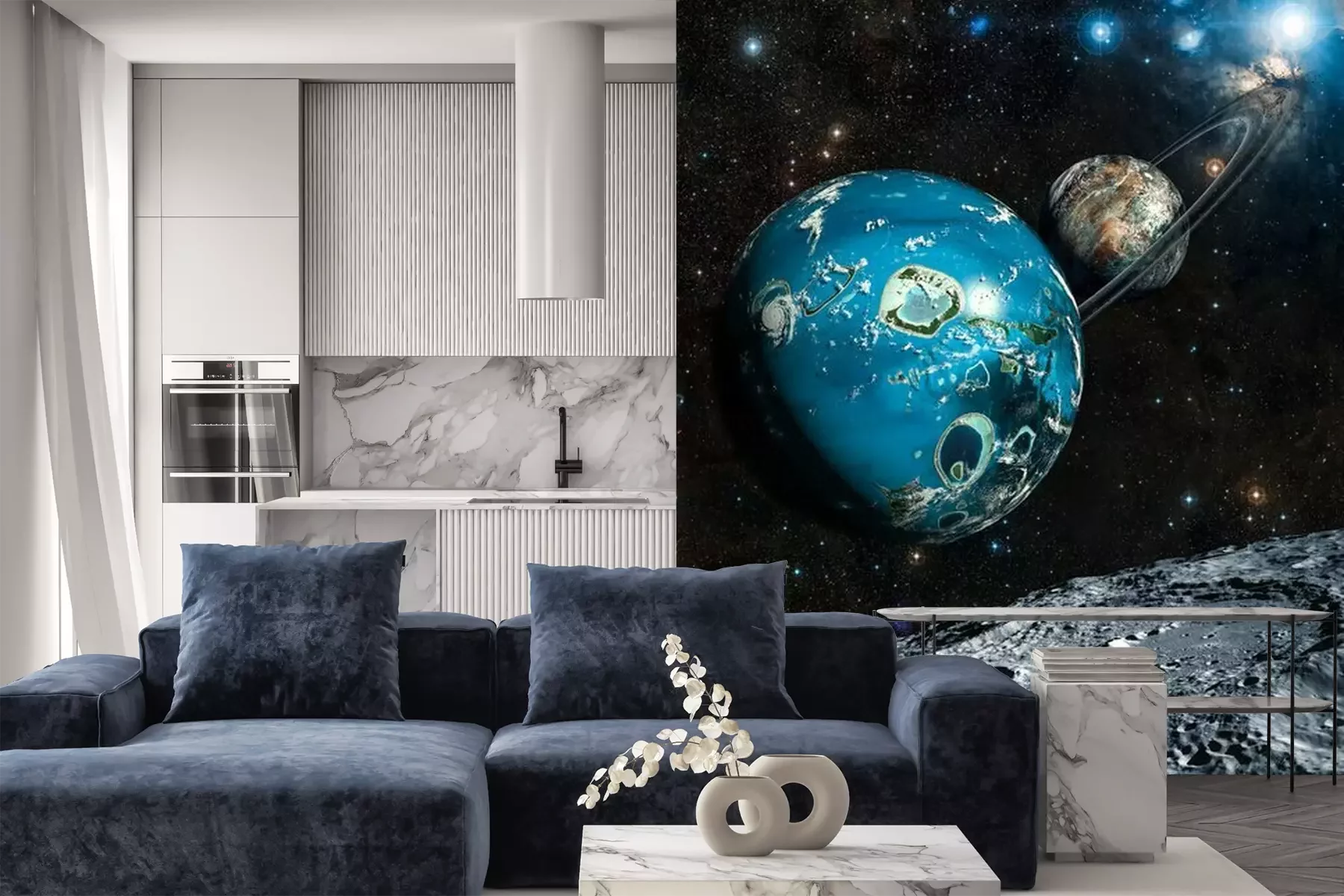 Het materiaal Premium is een glad vinyl op vlies, dat bestand is tegen uitrekken en vervorming. Het is dampdoorlatend – de muren kunnen vrij ademen – waardoor het geschikt is voor gebruik in de keuken en badkamer. Bij vervuiling kan het materiaal worden afgenomen met een vochtige doek. De maximale breedte van één baan bedraagt 95 of 105 cm, afhankelijk van de beschikbaarheid. Montage vindt plaats met de rand-aan-rand methode, wat een esthetisch resultaat zonder zichtbare naden oplevert. Omdat de lijm rechtstreeks op de muur wordt aangebracht, verloopt de installatie van het fotobehang snel en eenvoudig.