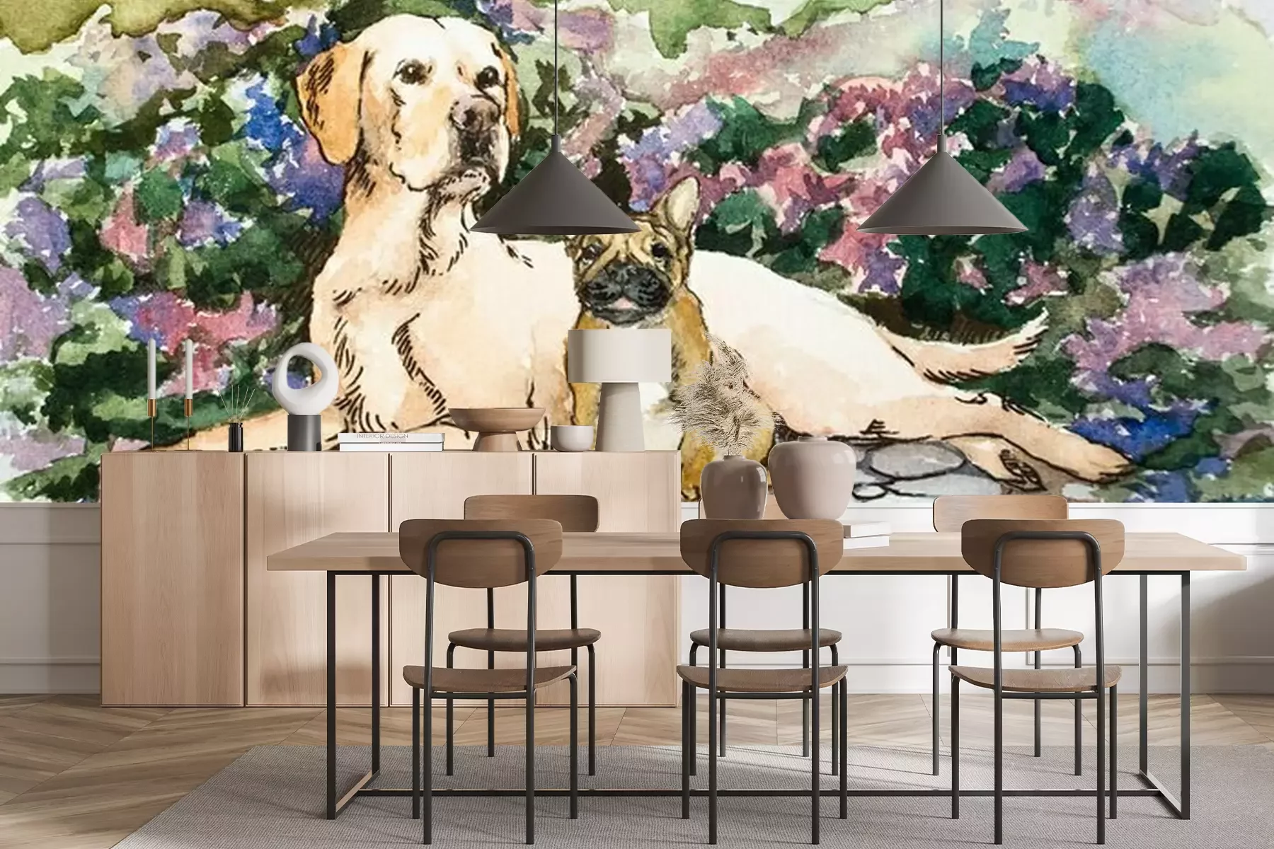 Fotobehang Een gedetailleerde handtekening op papier. Lichte tinten en lichte kleuren. Bloeiende bloemenachtergrond. Waterverf concept. Dierlijk concept