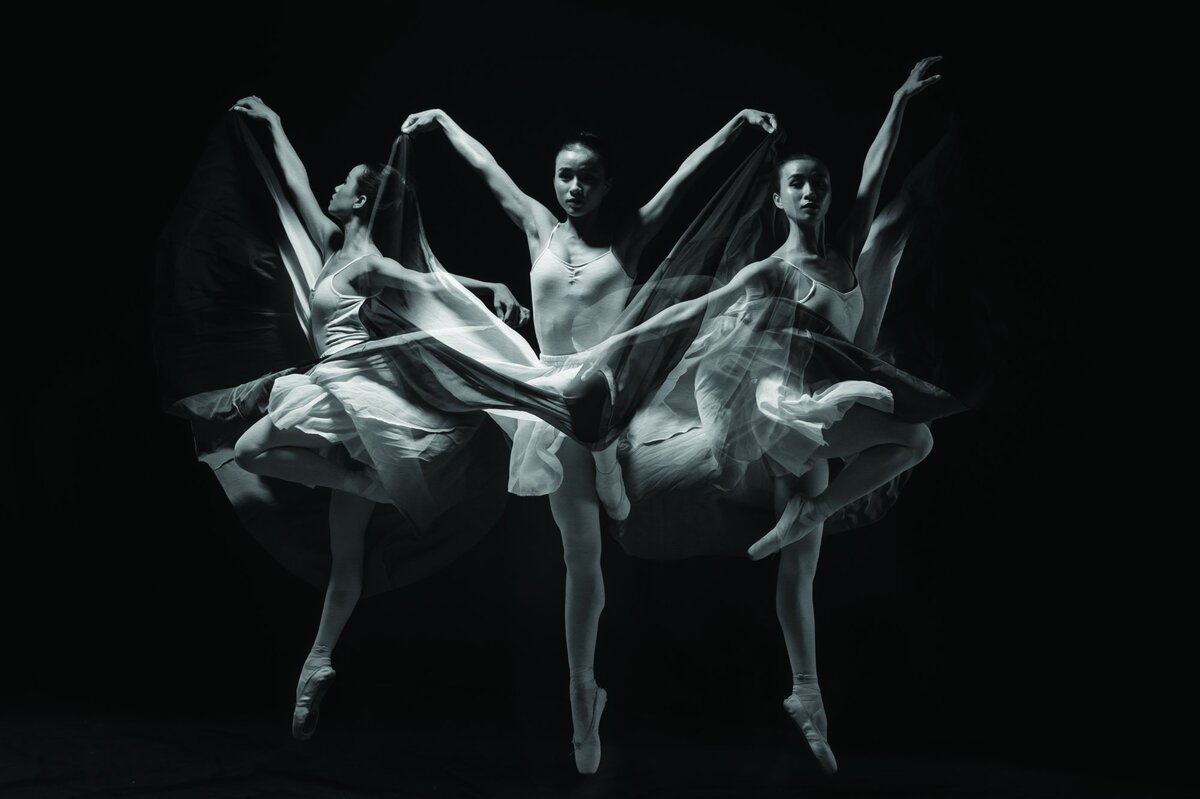 Een groep gymnasten tegen de achtergrond van een zwart podium