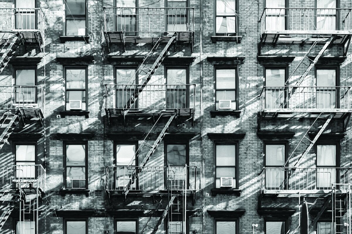 Fotobehang: Een historisch bakstenen huurhuis met een klassieke trap