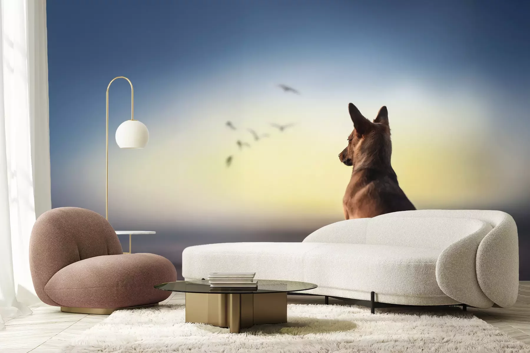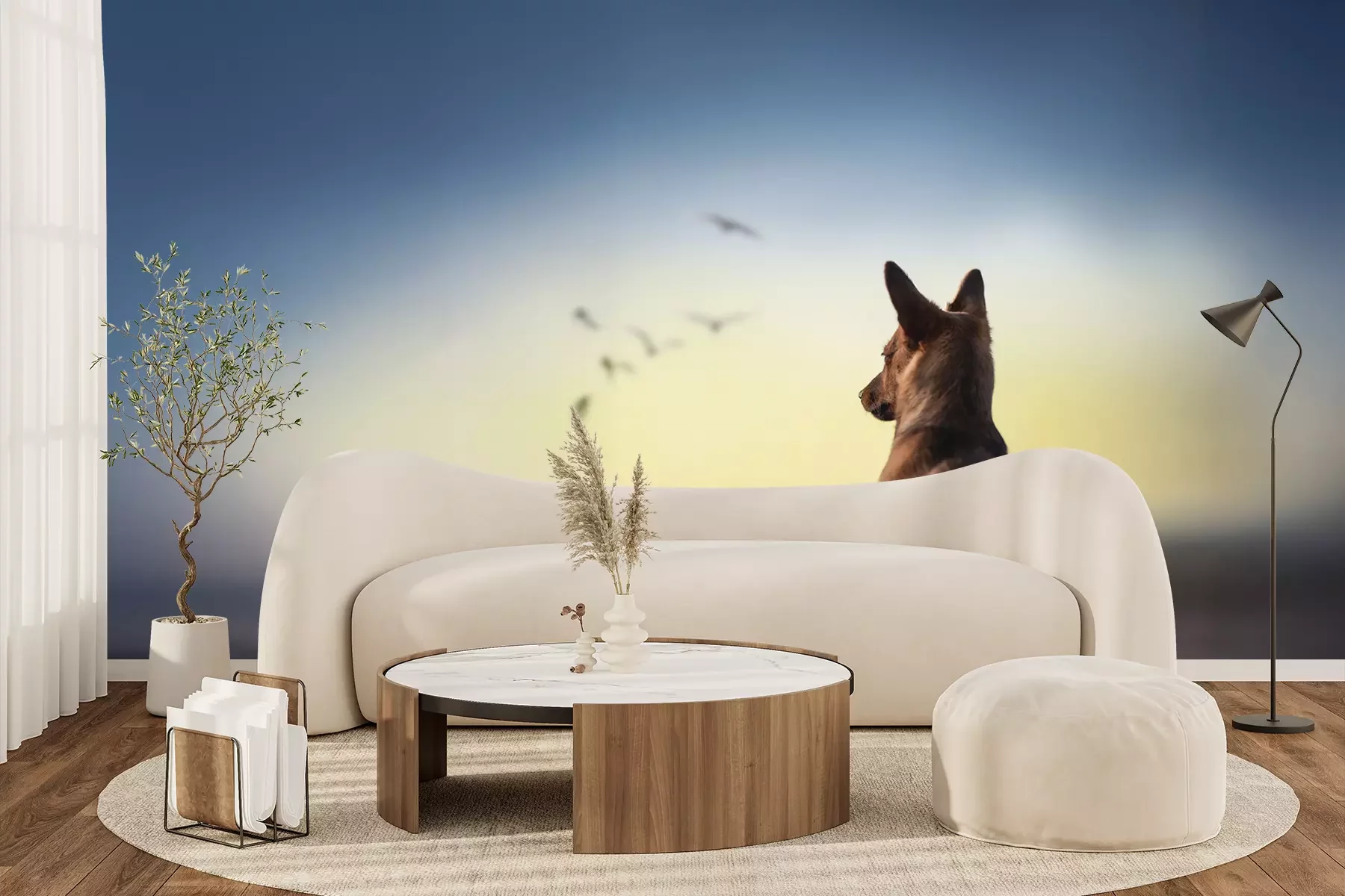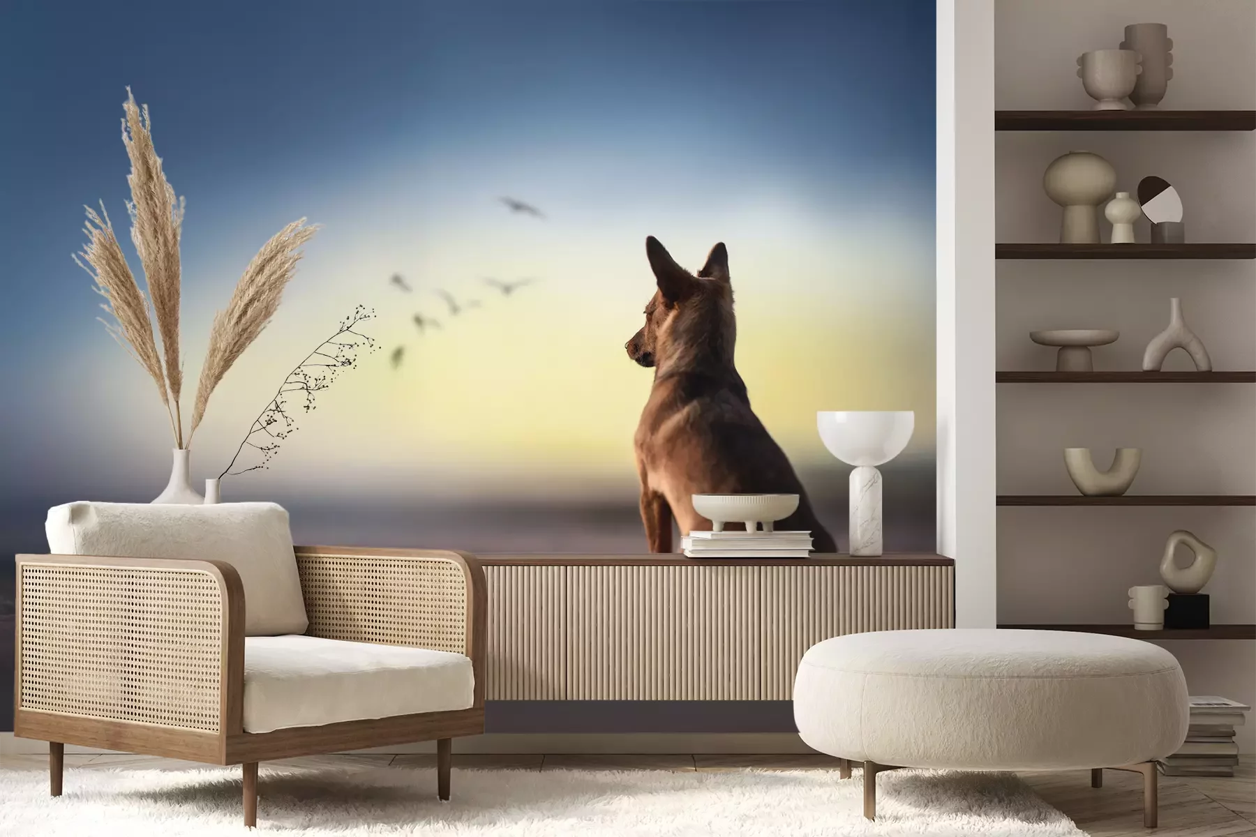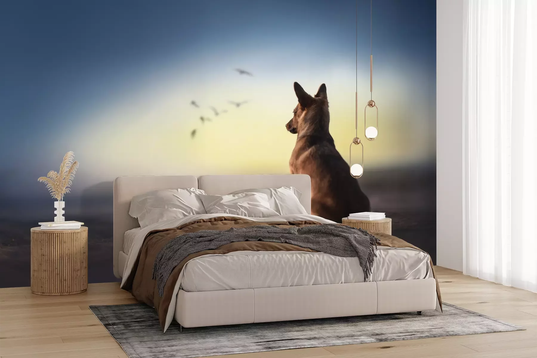 Het materiaal Premium+ is een gestructureerd vinyl op vlies met een gewicht van 255 g/m², dat kleine oneffenheden in de muur effectief camoufleert. De subtiele structuur van fijn zand geeft het oppervlak een exclusieve uitstraling, terwijl de halfmatte afwerking de diepte van de kleuren benadrukt. Het materiaal is dampdoorlatend, waardoor het ook in de keuken en badkamer kan worden gebruikt. De maximale breedte van één baan bedraagt 100 cm – bij grotere afmetingen wordt het fotobehang in meerdere gelijke banen verdeeld. De lijm wordt direct op de muur aangebracht en het behang wordt rand-aan-rand geplakt, wat zorgt voor een esthetisch resultaat zonder zichtbare naden. Het oppervlak kan gemakkelijk worden schoongemaakt door het voorzichtig af te nemen met een vochtige doek.