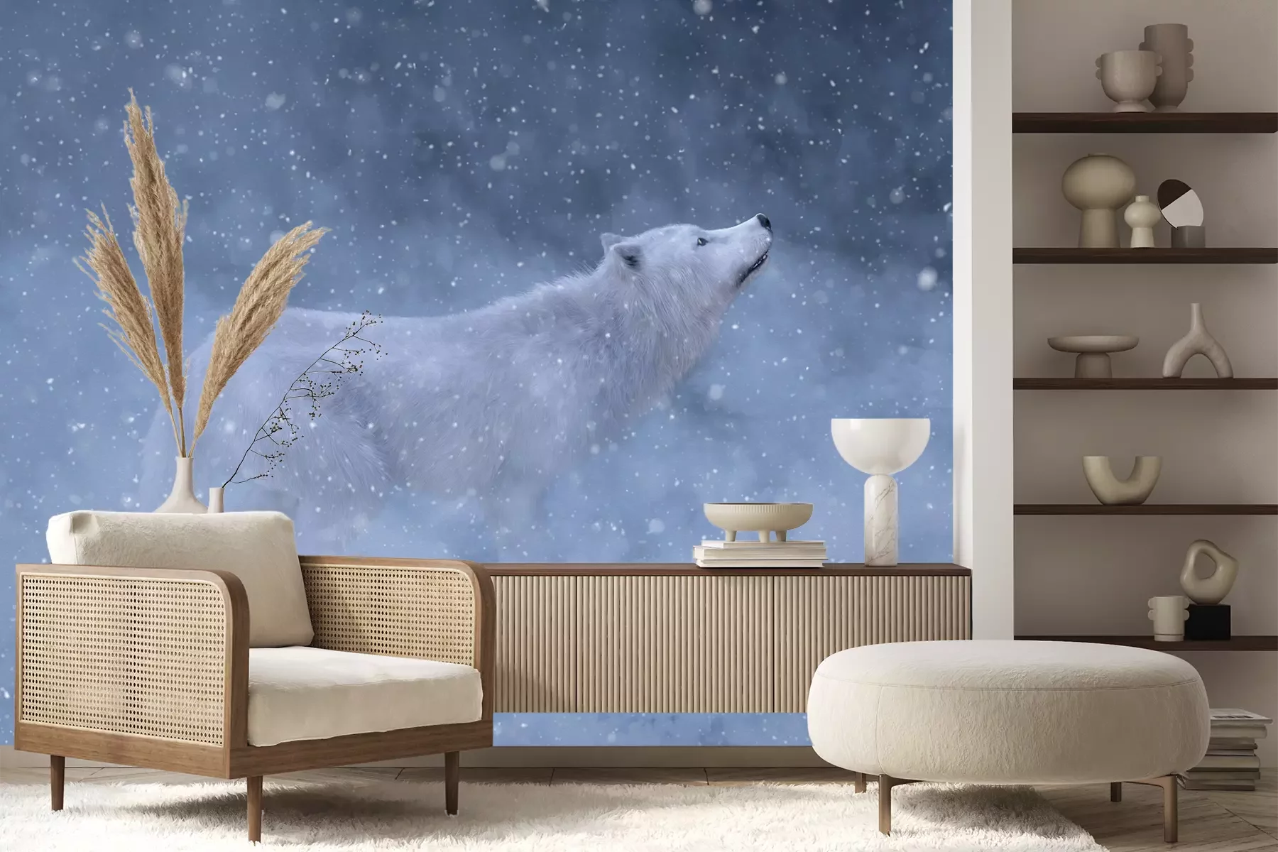 Het materiaal Premium+ is een gestructureerd vinyl op vlies met een gewicht van 255 g/m², dat kleine oneffenheden in de muur effectief camoufleert. De subtiele structuur van fijn zand geeft het oppervlak een exclusieve uitstraling, terwijl de halfmatte afwerking de diepte van de kleuren benadrukt. Het materiaal is dampdoorlatend, waardoor het ook in de keuken en badkamer kan worden gebruikt. De maximale breedte van één baan bedraagt 100 cm – bij grotere afmetingen wordt het fotobehang in meerdere gelijke banen verdeeld. De lijm wordt direct op de muur aangebracht en het behang wordt rand-aan-rand geplakt, wat zorgt voor een esthetisch resultaat zonder zichtbare naden. Het oppervlak kan gemakkelijk worden schoongemaakt door het voorzichtig af te nemen met een vochtige doek.