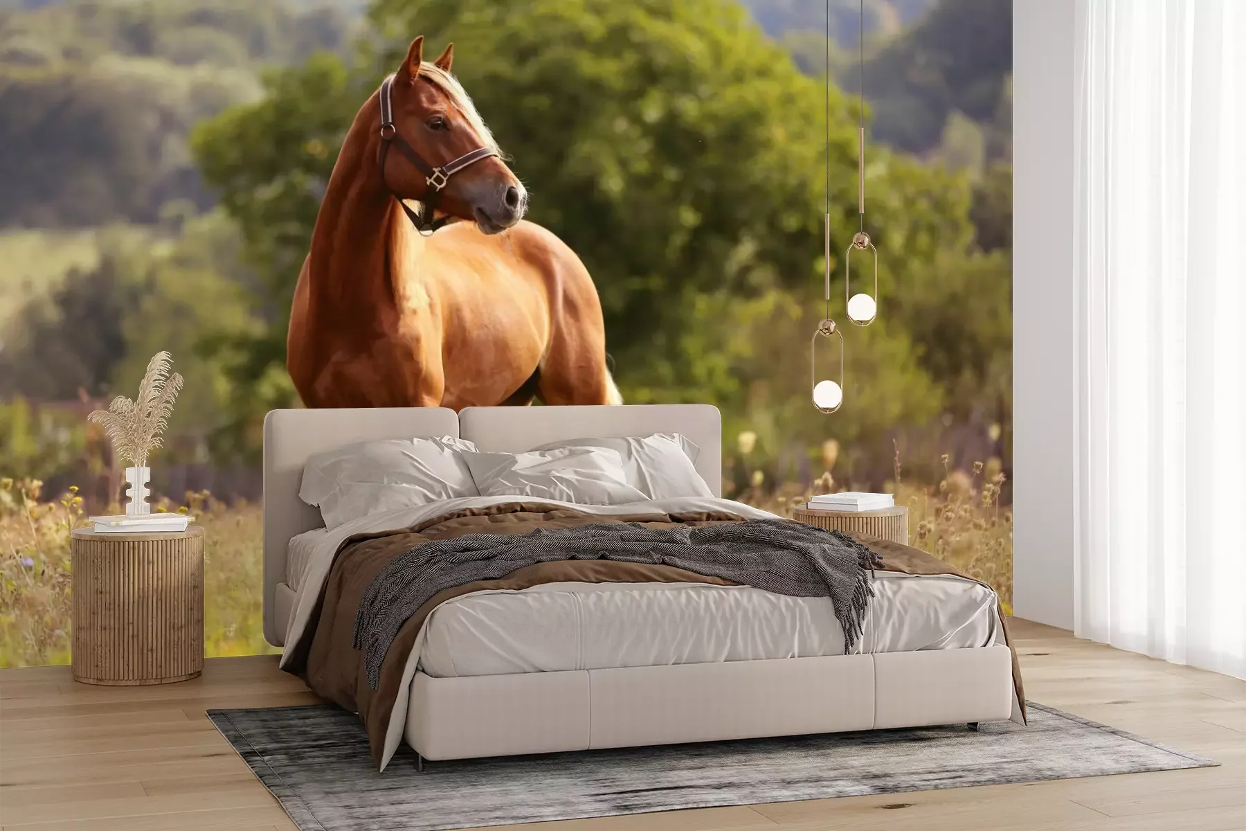 Het materiaal Premium+ is een gestructureerd vinyl op vlies met een gewicht van 255 g/m², dat kleine oneffenheden in de muur effectief camoufleert. De subtiele structuur van fijn zand geeft het oppervlak een exclusieve uitstraling, terwijl de halfmatte afwerking de diepte van de kleuren benadrukt. Het materiaal is dampdoorlatend, waardoor het ook in de keuken en badkamer kan worden gebruikt. De maximale breedte van één baan bedraagt 100 cm – bij grotere afmetingen wordt het fotobehang in meerdere gelijke banen verdeeld. De lijm wordt direct op de muur aangebracht en het behang wordt rand-aan-rand geplakt, wat zorgt voor een esthetisch resultaat zonder zichtbare naden. Het oppervlak kan gemakkelijk worden schoongemaakt door het voorzichtig af te nemen met een vochtige doek.