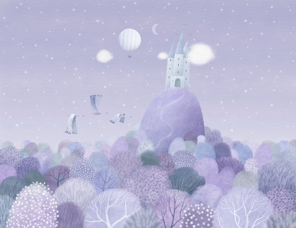 Fotobehang: Een kasteel op een heuvel tussen de bomen, een sprookjesachtig landschap