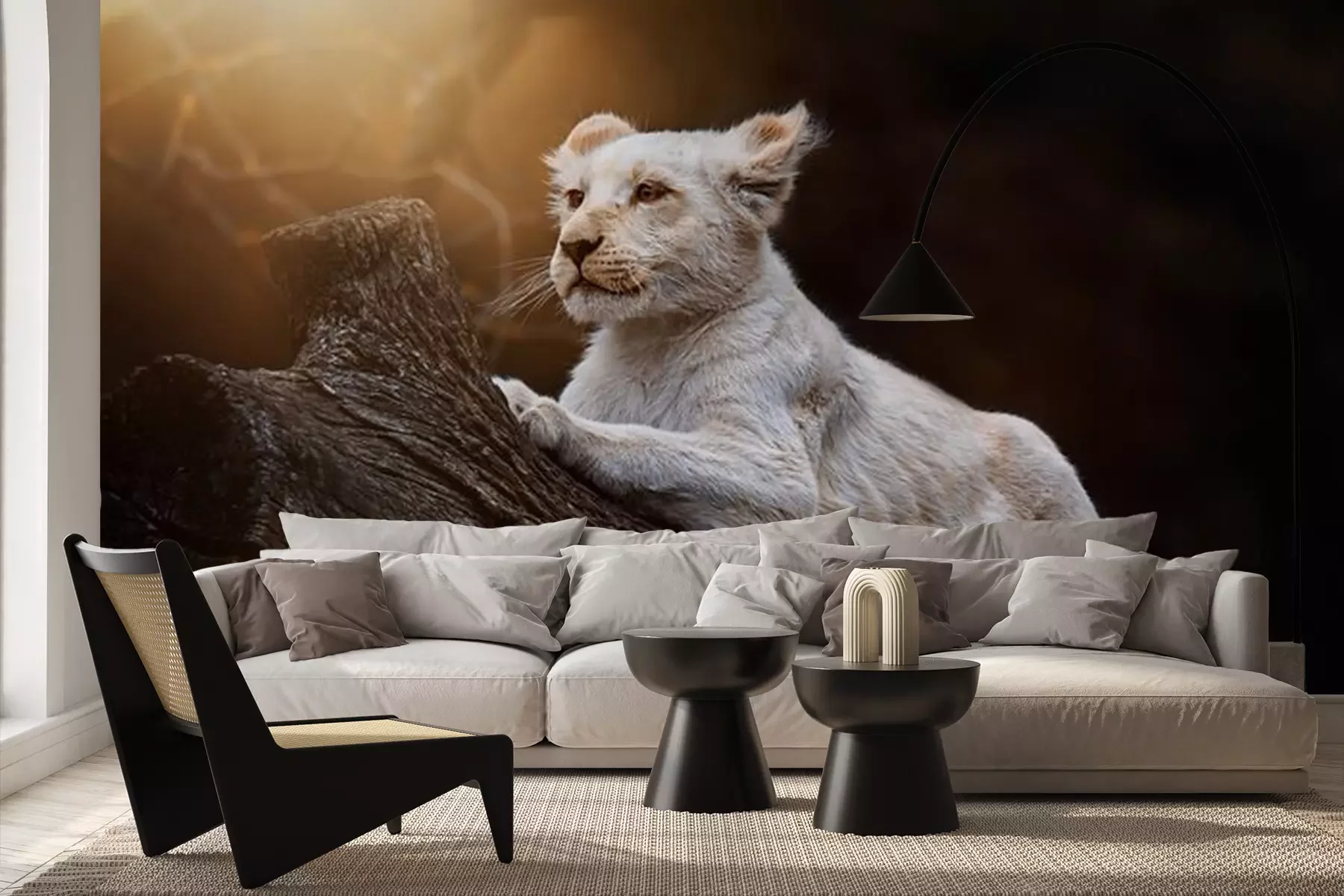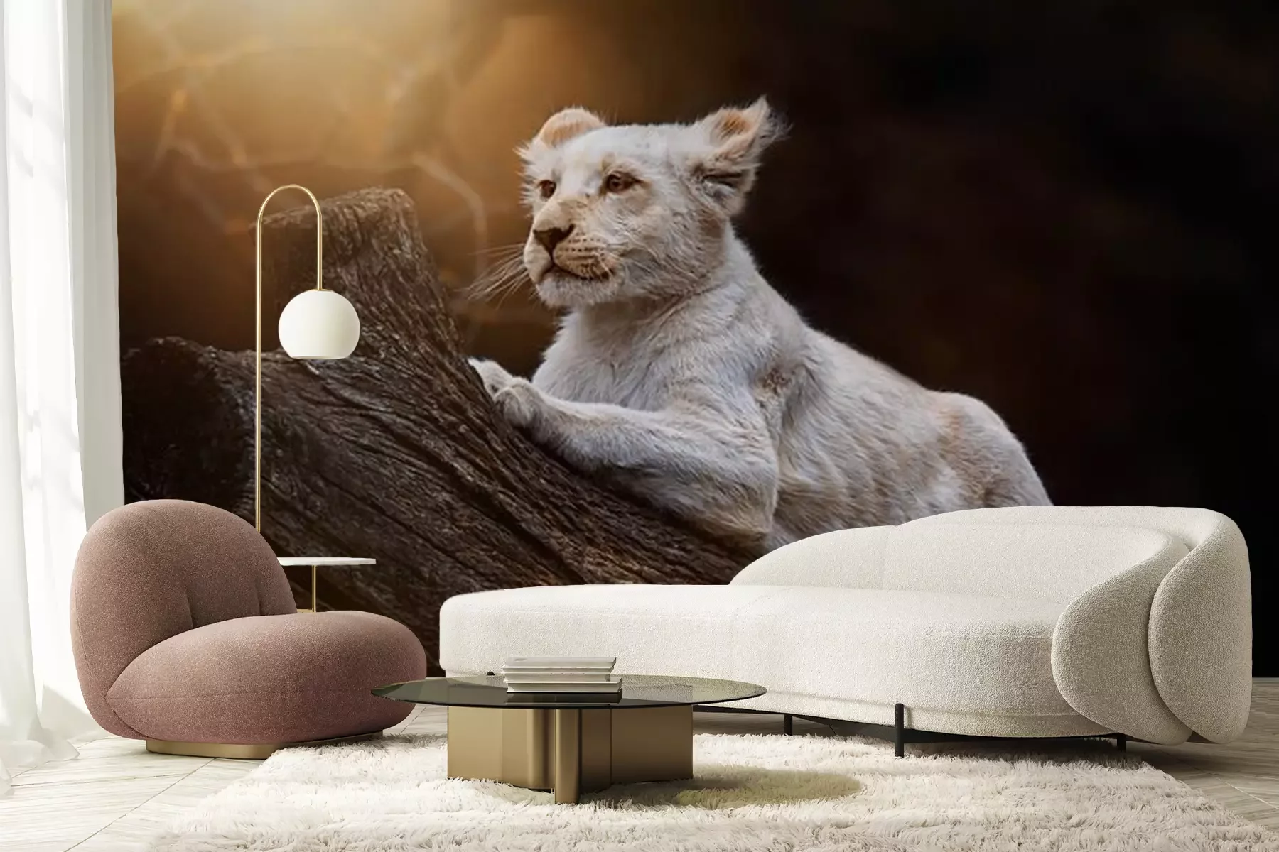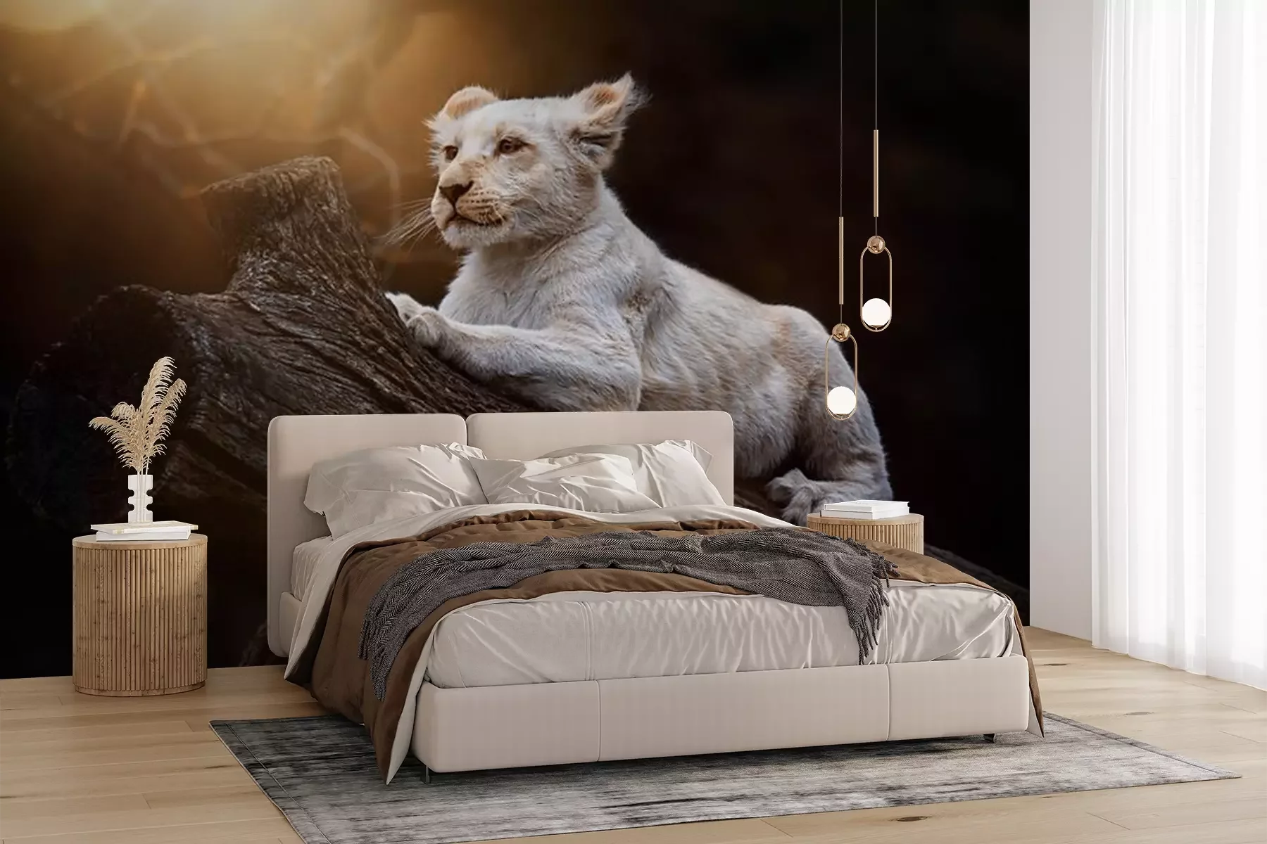 Fotobehang Een kleine Zuid-Afrikaanse leeuw op een boomstam