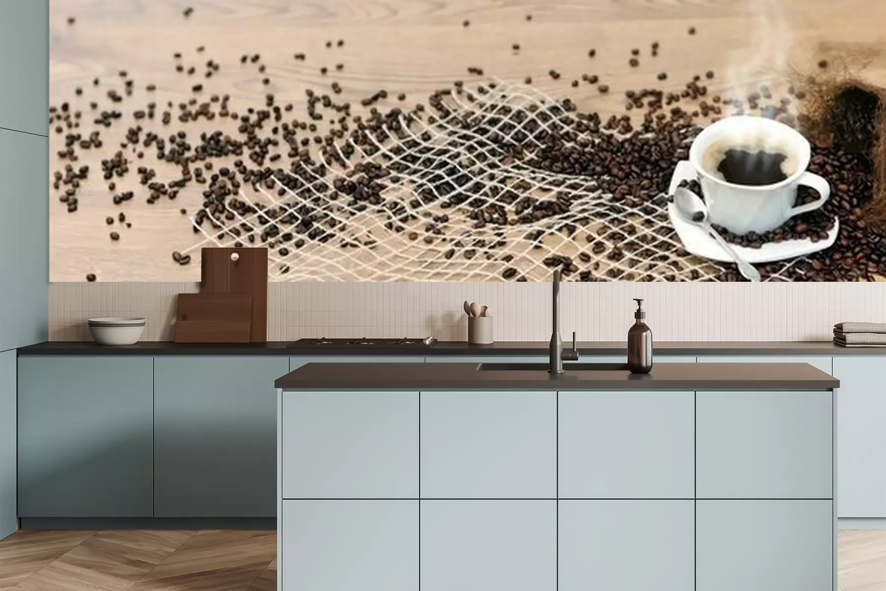 Het materiaal Premium is een glad vinyl op vlies, dat bestand is tegen uitrekken en vervorming. Het is dampdoorlatend – de muren kunnen vrij ademen – waardoor het geschikt is voor gebruik in de keuken en badkamer. Bij vervuiling kan het materiaal worden afgenomen met een vochtige doek. De maximale breedte van één baan bedraagt 95 of 105 cm, afhankelijk van de beschikbaarheid. Montage vindt plaats met de rand-aan-rand methode, wat een esthetisch resultaat zonder zichtbare naden oplevert. Omdat de lijm rechtstreeks op de muur wordt aangebracht, verloopt de installatie van het fotobehang snel en eenvoudig.