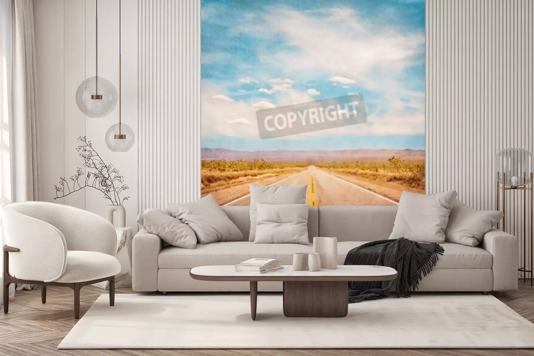 Fotobehang Een lege woestijn weg met een geweven achtergrond en een subtiele vignet.