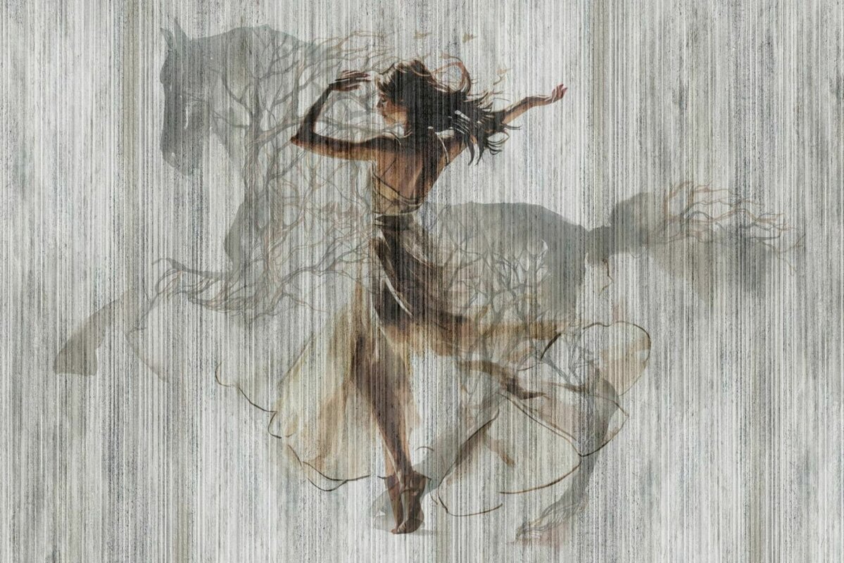 Een moderne compositie van een dansende vrouw en een galopperend paard