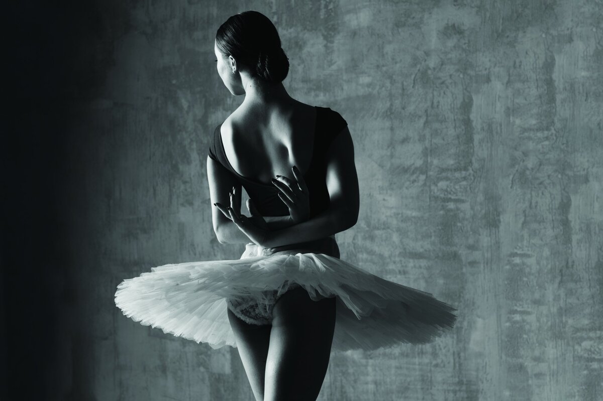 Fotobehang: Een monochrome afbeelding van een ballerina in beweging