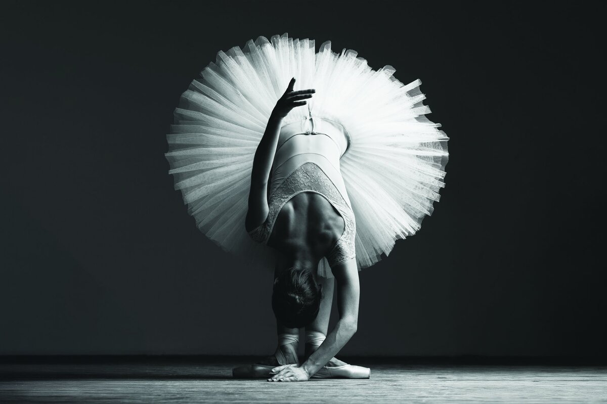 Een monochrome foto van een slanke, jonge ballerina.