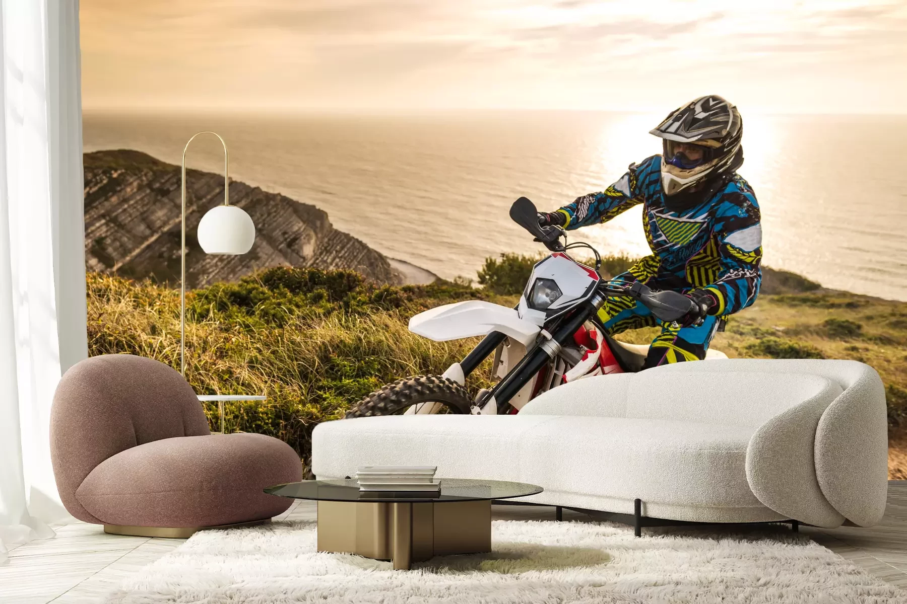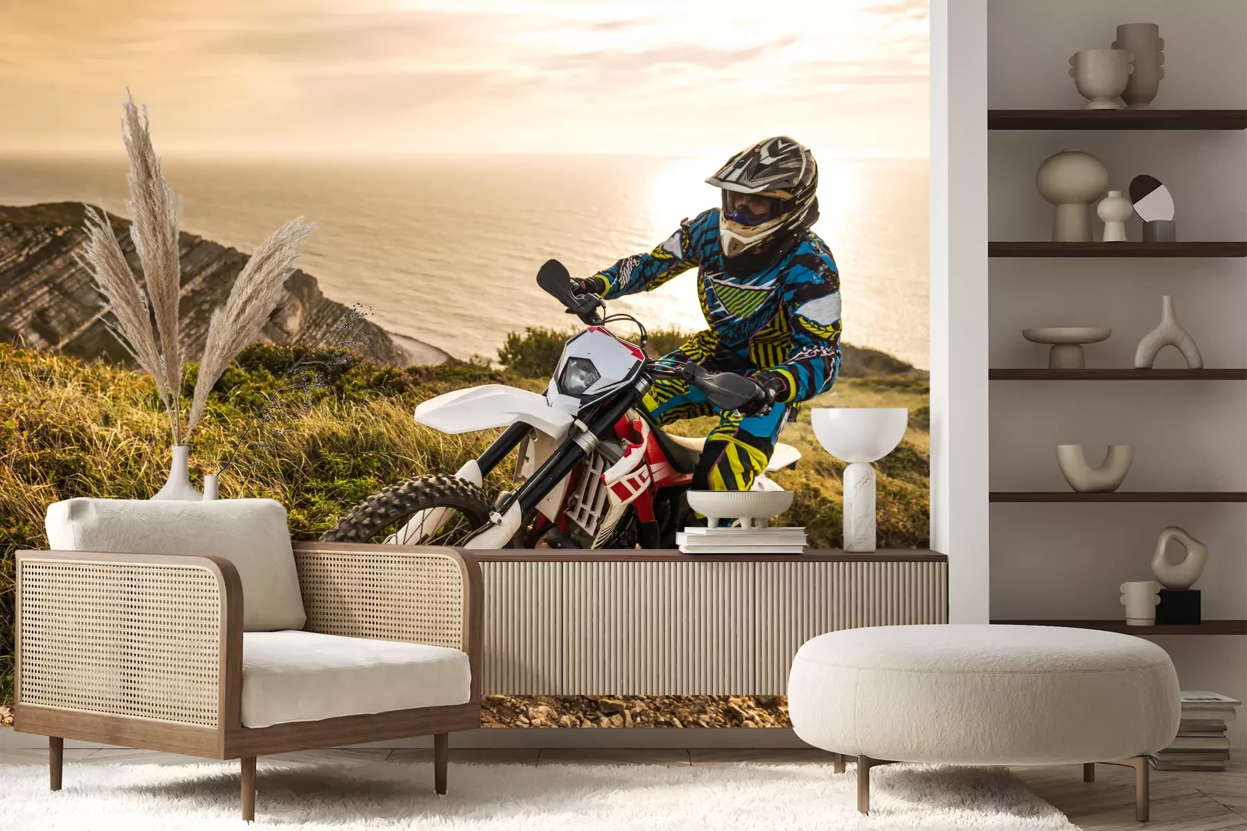 Het materiaal Premium+ is een gestructureerd vinyl op vlies met een gewicht van 255 g/m², dat kleine oneffenheden in de muur effectief camoufleert. De subtiele structuur van fijn zand geeft het oppervlak een exclusieve uitstraling, terwijl de halfmatte afwerking de diepte van de kleuren benadrukt. Het materiaal is dampdoorlatend, waardoor het ook in de keuken en badkamer kan worden gebruikt. De maximale breedte van één baan bedraagt 100 cm – bij grotere afmetingen wordt het fotobehang in meerdere gelijke banen verdeeld. De lijm wordt direct op de muur aangebracht en het behang wordt rand-aan-rand geplakt, wat zorgt voor een esthetisch resultaat zonder zichtbare naden. Het oppervlak kan gemakkelijk worden schoongemaakt door het voorzichtig af te nemen met een vochtige doek.
