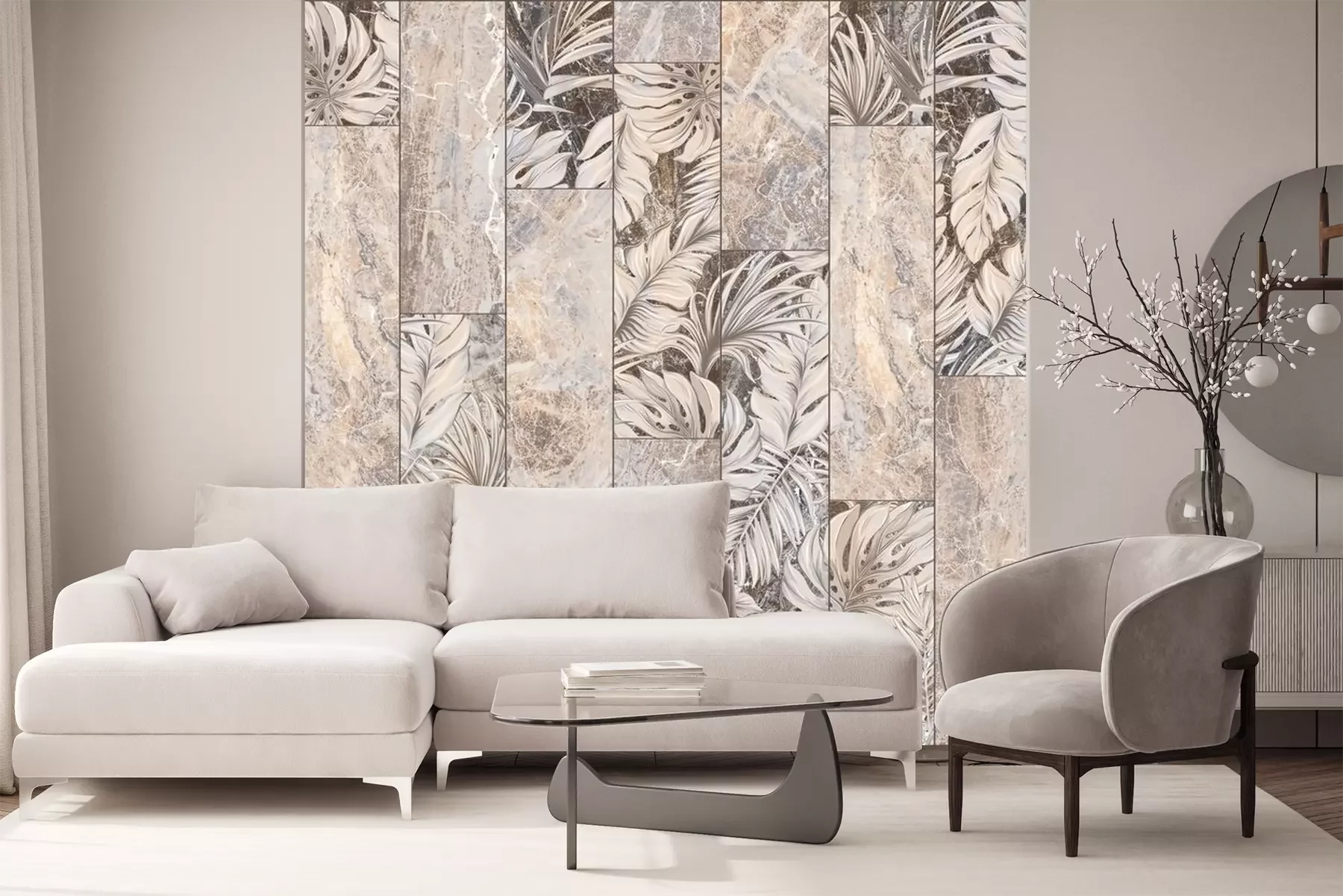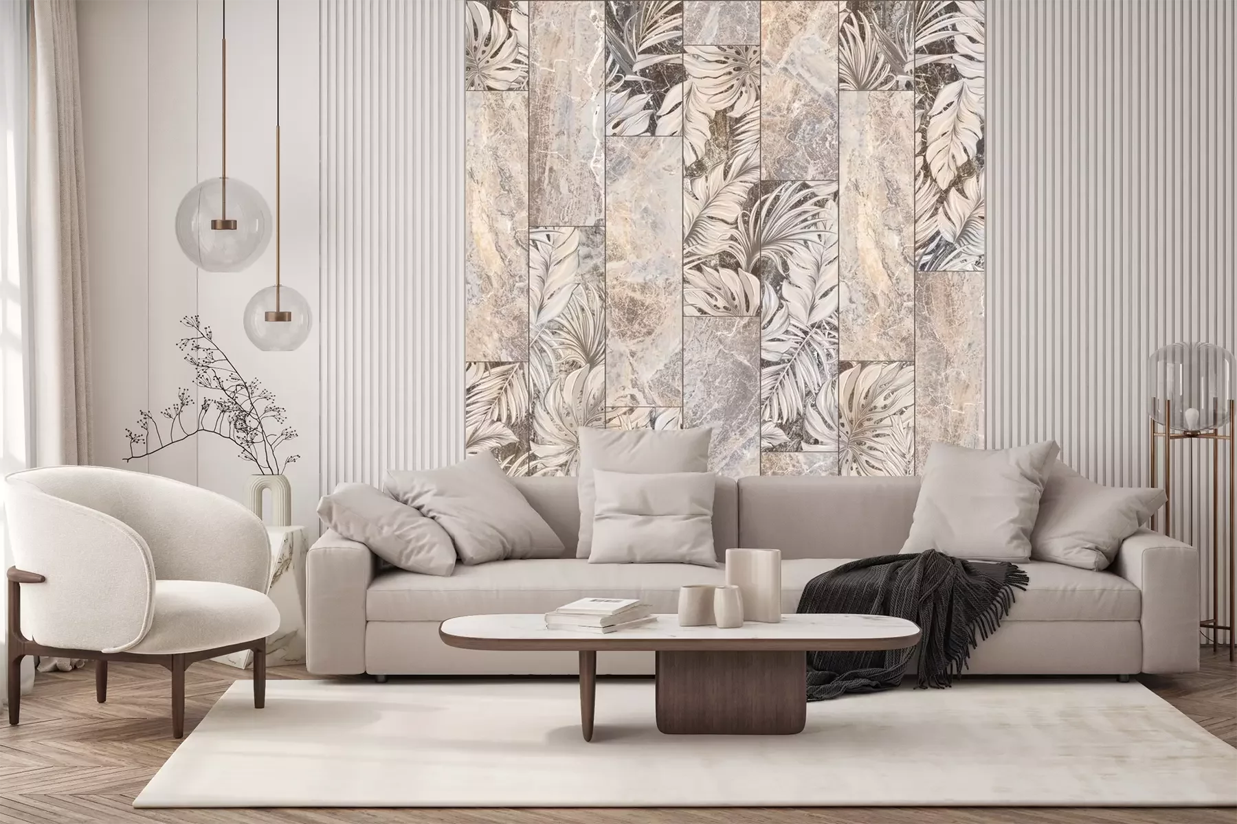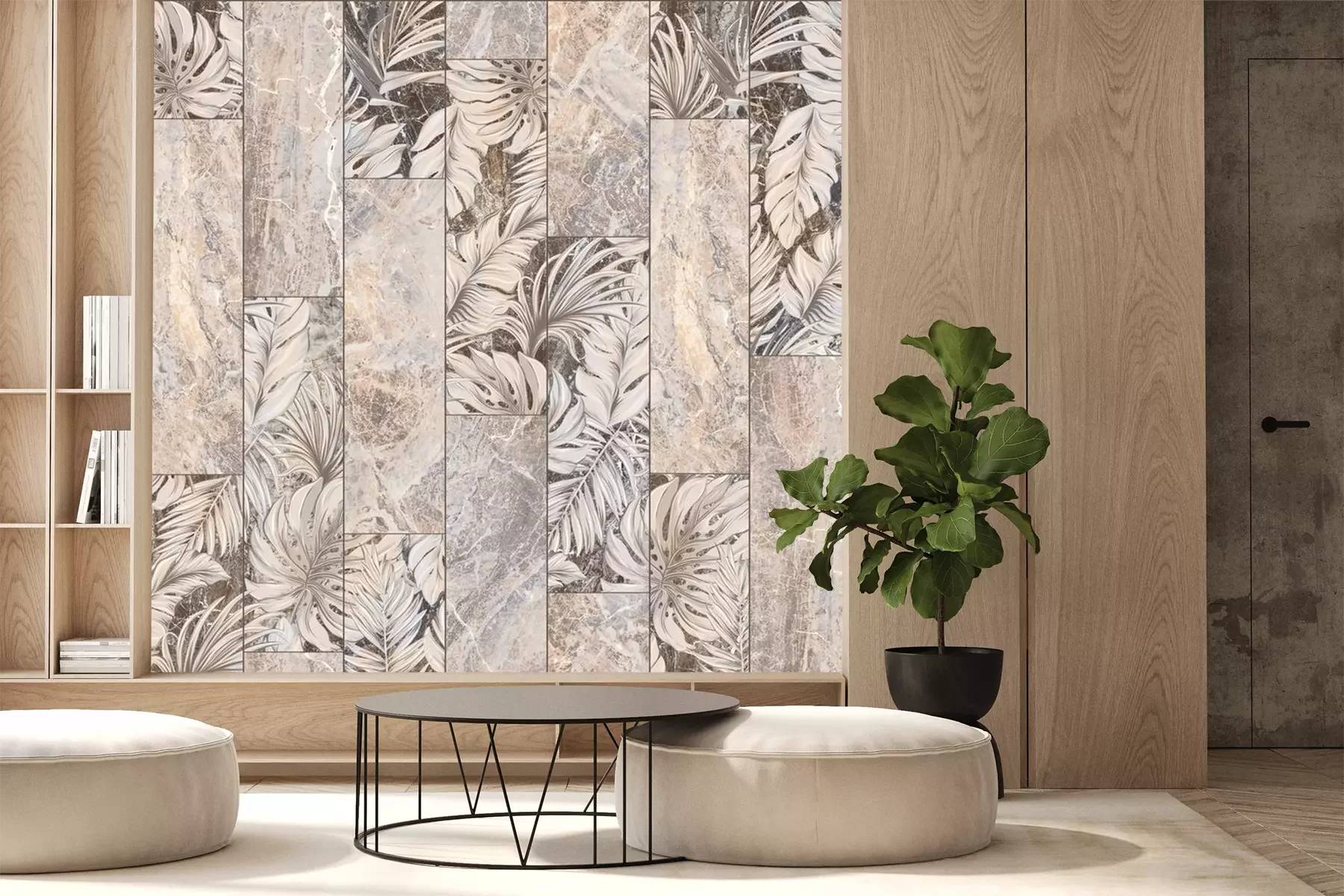 Fotobehang Een mozaïek van rechthoekige tegels met een patroon van bladeren