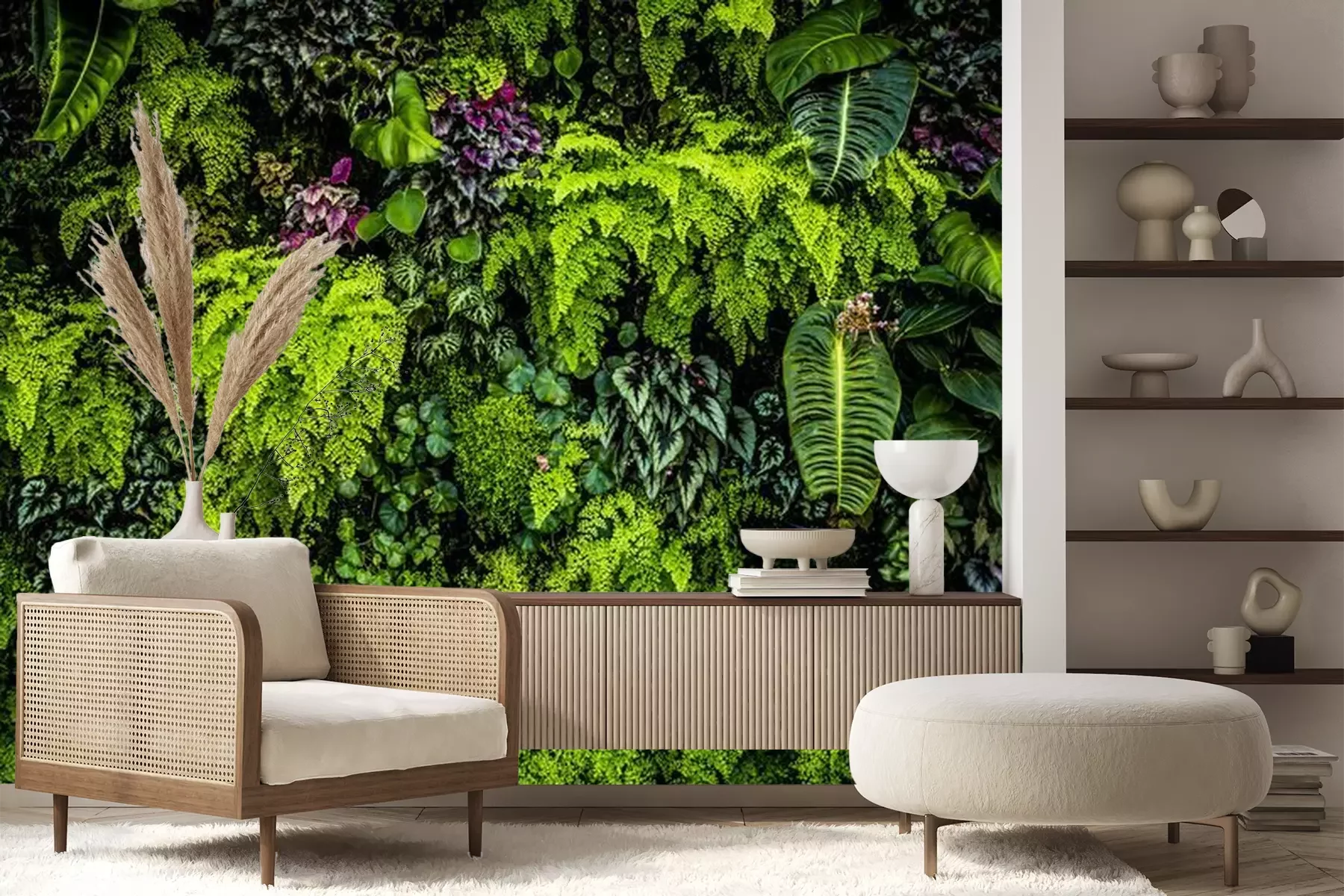 Het materiaal Premium+ is een gestructureerd vinyl op vlies met een gewicht van 255 g/m², dat kleine oneffenheden in de muur effectief camoufleert. De subtiele structuur van fijn zand geeft het oppervlak een exclusieve uitstraling, terwijl de halfmatte afwerking de diepte van de kleuren benadrukt. Het materiaal is dampdoorlatend, waardoor het ook in de keuken en badkamer kan worden gebruikt. De maximale breedte van één baan bedraagt 100 cm – bij grotere afmetingen wordt het fotobehang in meerdere gelijke banen verdeeld. De lijm wordt direct op de muur aangebracht en het behang wordt rand-aan-rand geplakt, wat zorgt voor een esthetisch resultaat zonder zichtbare naden. Het oppervlak kan gemakkelijk worden schoongemaakt door het voorzichtig af te nemen met een vochtige doek.