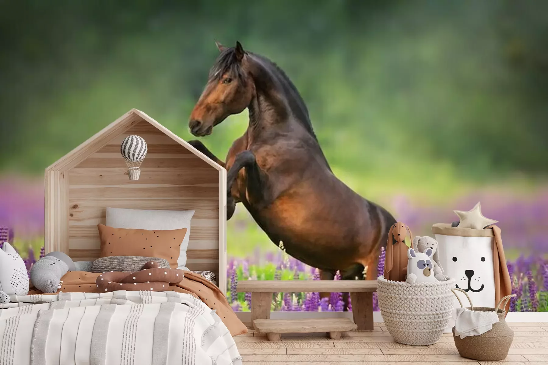 Bay stallion portrait on spring blossom treeProbleemloze bezorging verzorgd door vertrouwde vervoerders