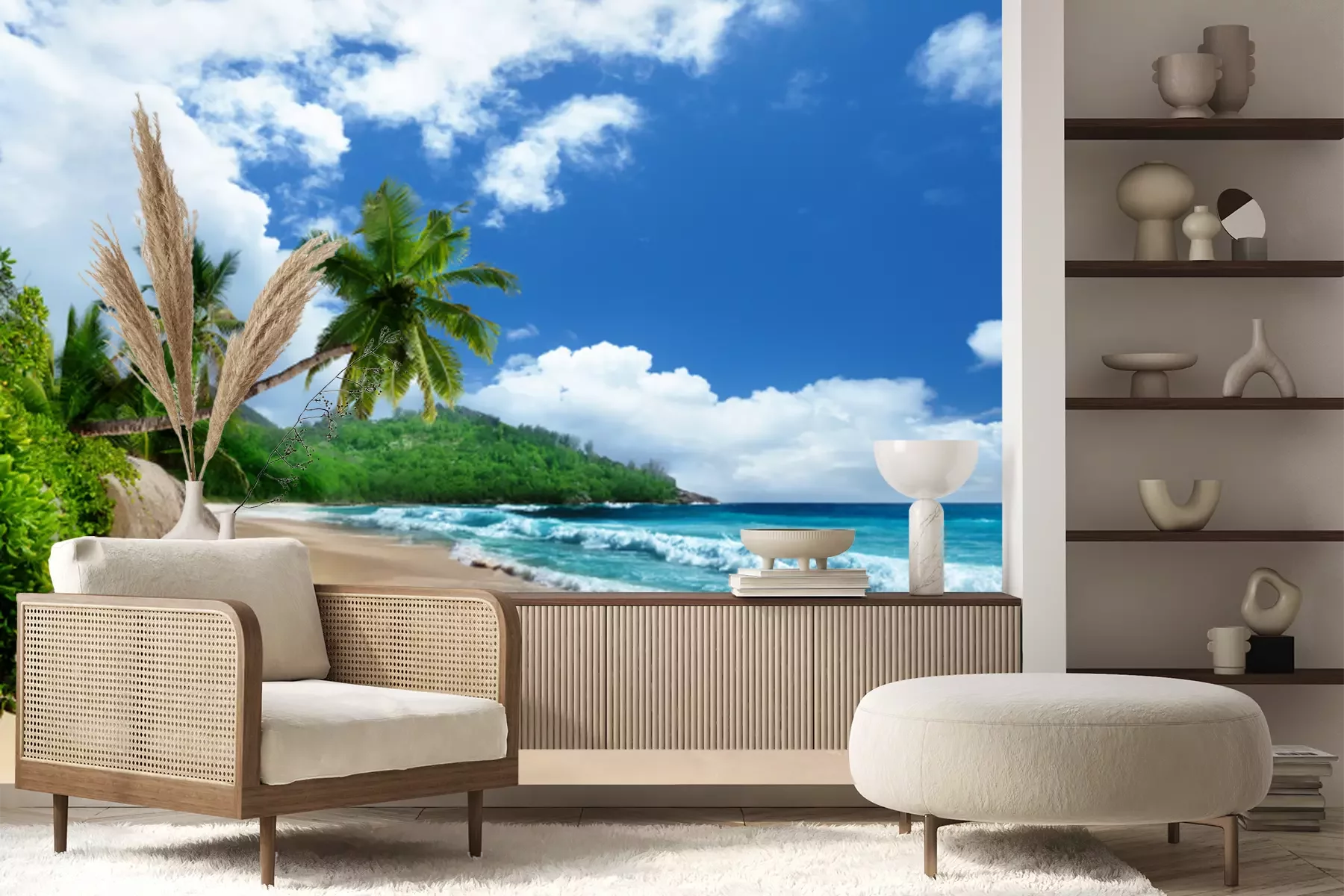 Het materiaal Premium+ is een gestructureerd vinyl op vlies met een gewicht van 255 g/m², dat kleine oneffenheden in de muur effectief camoufleert. De subtiele structuur van fijn zand geeft het oppervlak een exclusieve uitstraling, terwijl de halfmatte afwerking de diepte van de kleuren benadrukt. Het materiaal is dampdoorlatend, waardoor het ook in de keuken en badkamer kan worden gebruikt. De maximale breedte van één baan bedraagt 100 cm – bij grotere afmetingen wordt het fotobehang in meerdere gelijke banen verdeeld. De lijm wordt direct op de muur aangebracht en het behang wordt rand-aan-rand geplakt, wat zorgt voor een esthetisch resultaat zonder zichtbare naden. Het oppervlak kan gemakkelijk worden schoongemaakt door het voorzichtig af te nemen met een vochtige doek.