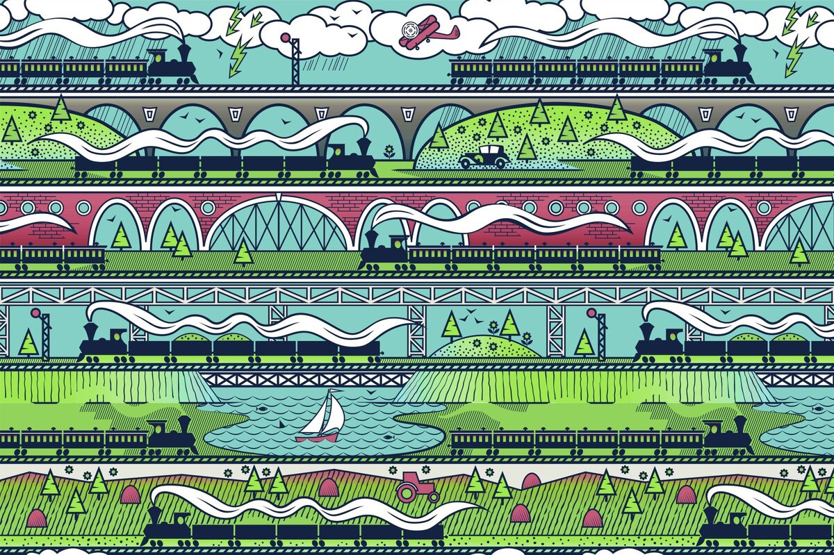 Fotobehang: Een pittoresk treinstation met bruggen en weelderig groen