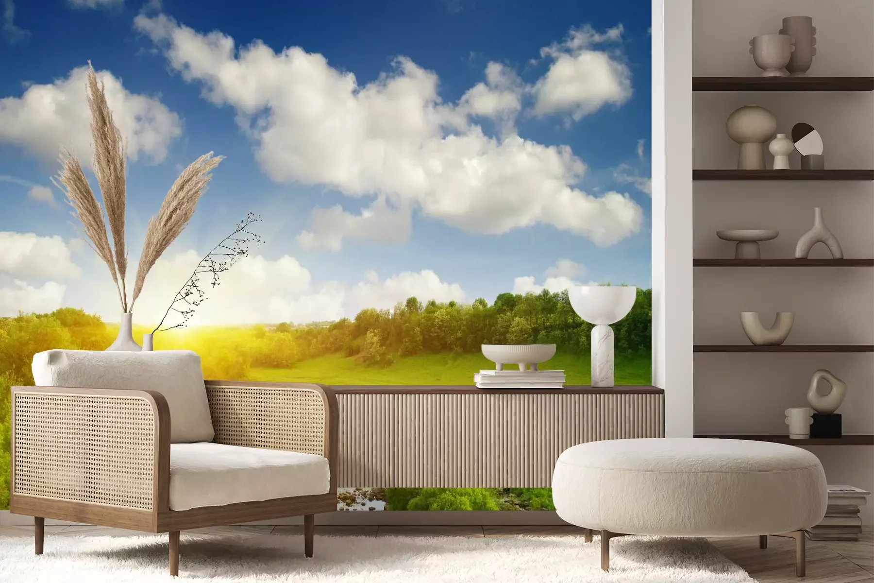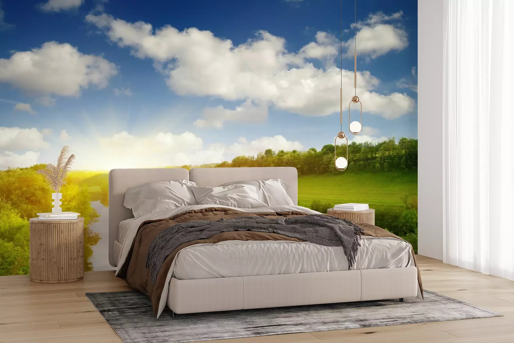 Het materiaal Premium+ is een gestructureerd vinyl op vlies met een gewicht van 255 g/m², dat kleine oneffenheden in de muur effectief camoufleert. De subtiele structuur van fijn zand geeft het oppervlak een exclusieve uitstraling, terwijl de halfmatte afwerking de diepte van de kleuren benadrukt. Het materiaal is dampdoorlatend, waardoor het ook in de keuken en badkamer kan worden gebruikt. De maximale breedte van één baan bedraagt 100 cm – bij grotere afmetingen wordt het fotobehang in meerdere gelijke banen verdeeld. De lijm wordt direct op de muur aangebracht en het behang wordt rand-aan-rand geplakt, wat zorgt voor een esthetisch resultaat zonder zichtbare naden. Het oppervlak kan gemakkelijk worden schoongemaakt door het voorzichtig af te nemen met een vochtige doek.