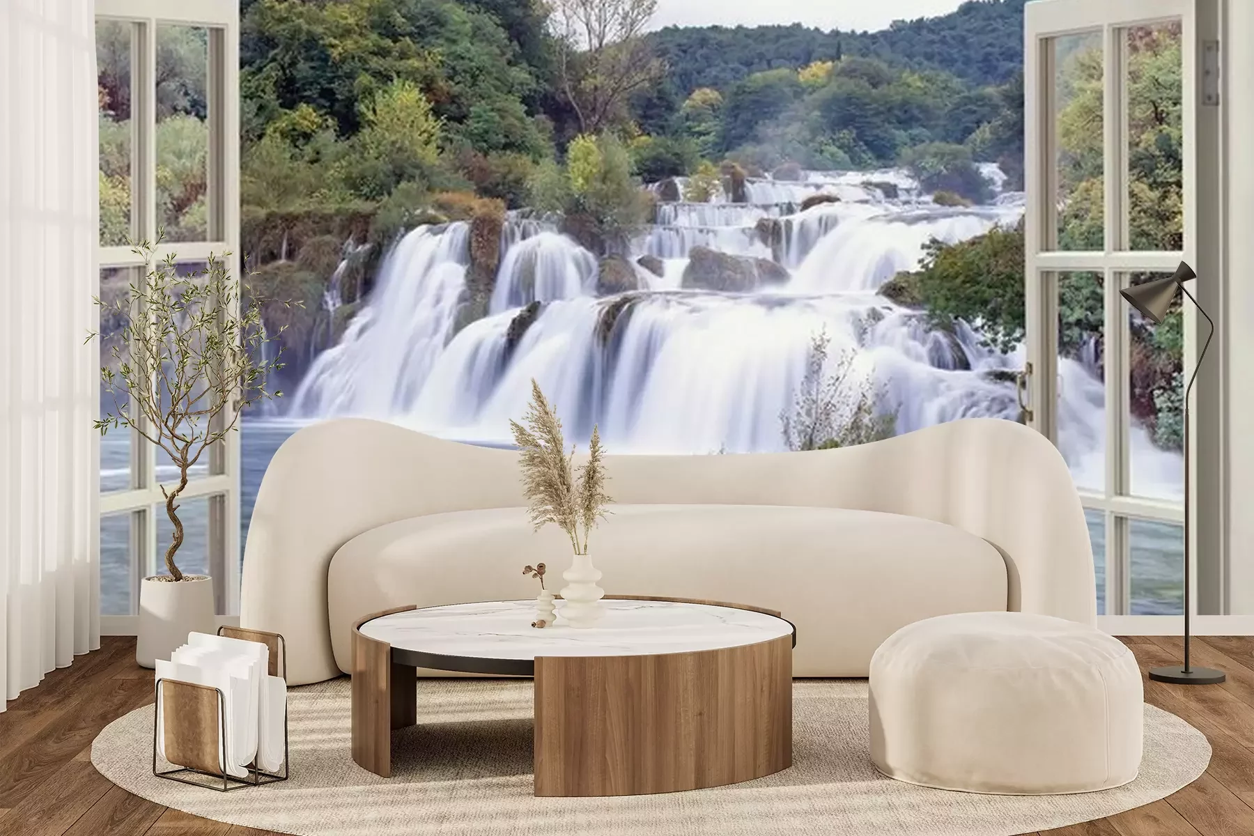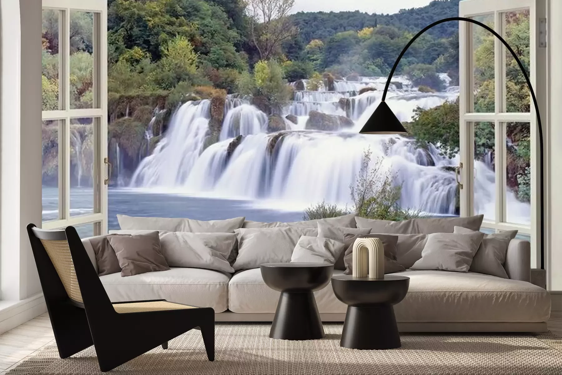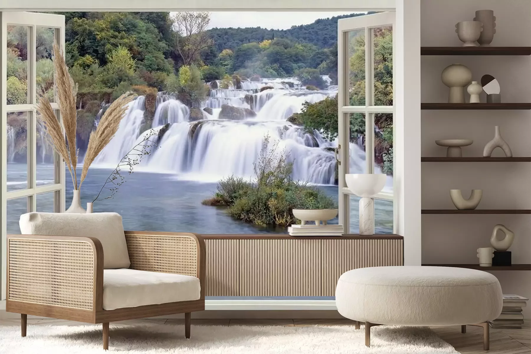 Uitzicht op de waterval vanuit een open raamFotobehang