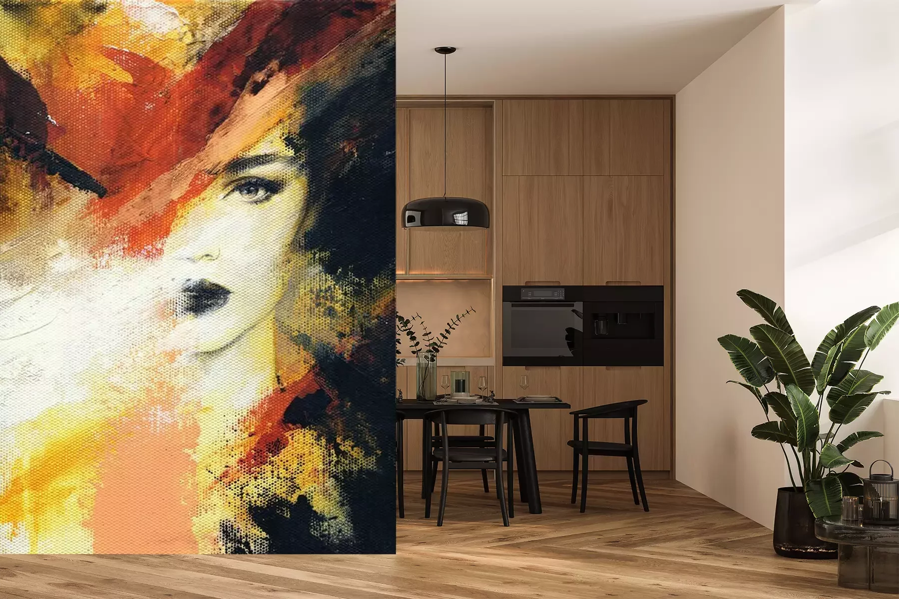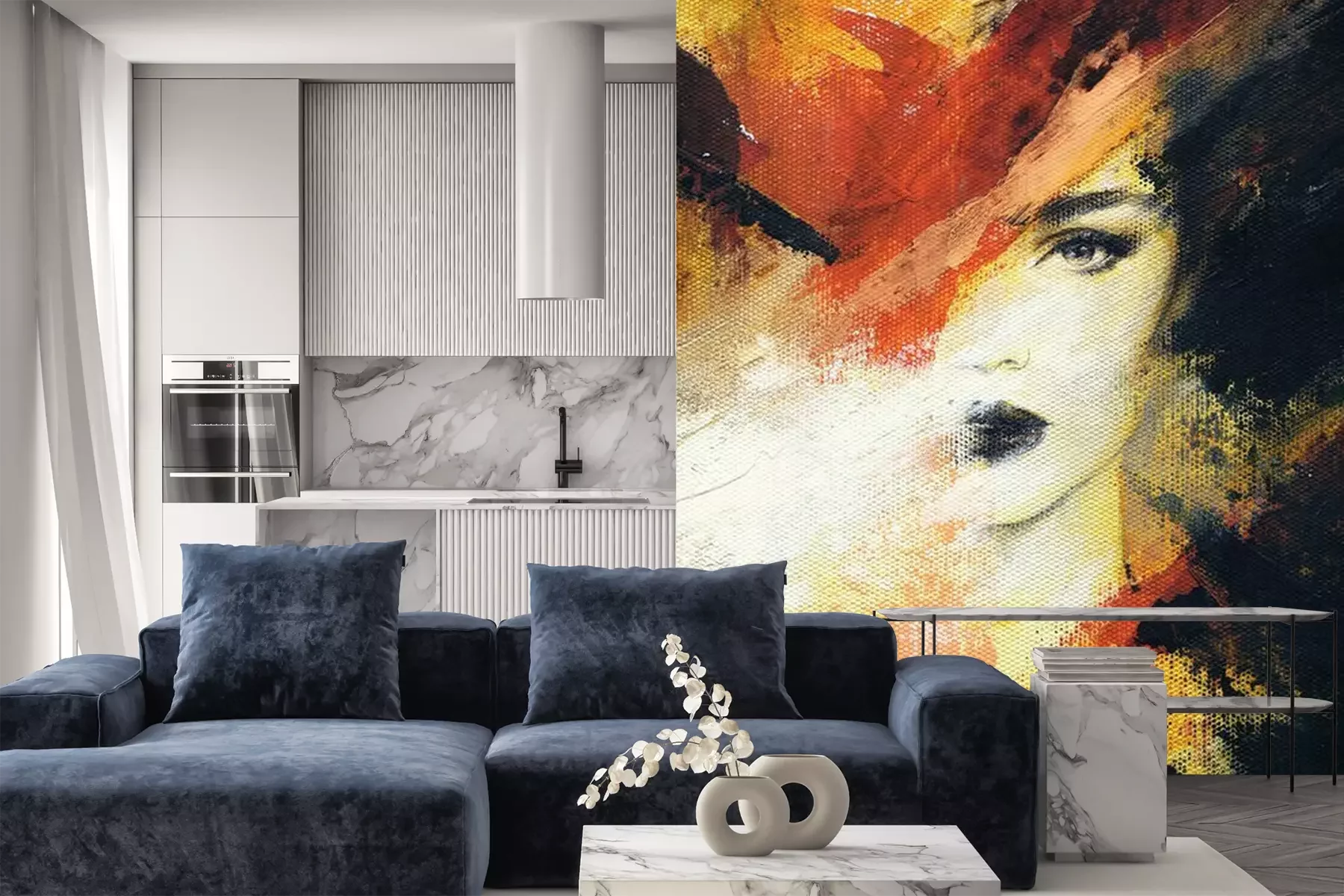 Het materiaal Premium+ is een gestructureerd vinyl op vlies met een gewicht van 255 g/m², dat kleine oneffenheden in de muur effectief camoufleert. De subtiele structuur van fijn zand geeft het oppervlak een exclusieve uitstraling, terwijl de halfmatte afwerking de diepte van de kleuren benadrukt. Het materiaal is dampdoorlatend, waardoor het ook in de keuken en badkamer kan worden gebruikt. De maximale breedte van één baan bedraagt 100 cm – bij grotere afmetingen wordt het fotobehang in meerdere gelijke banen verdeeld. De lijm wordt direct op de muur aangebracht en het behang wordt rand-aan-rand geplakt, wat zorgt voor een esthetisch resultaat zonder zichtbare naden. Het oppervlak kan gemakkelijk worden schoongemaakt door het voorzichtig af te nemen met een vochtige doek.