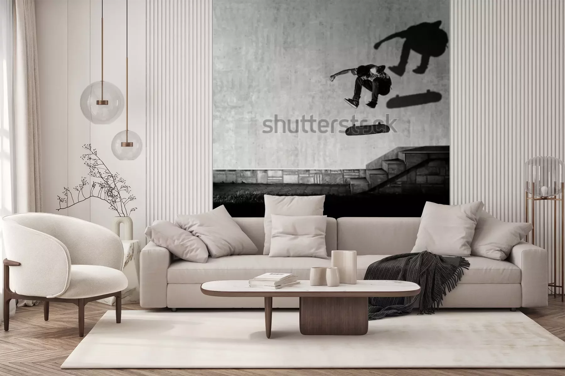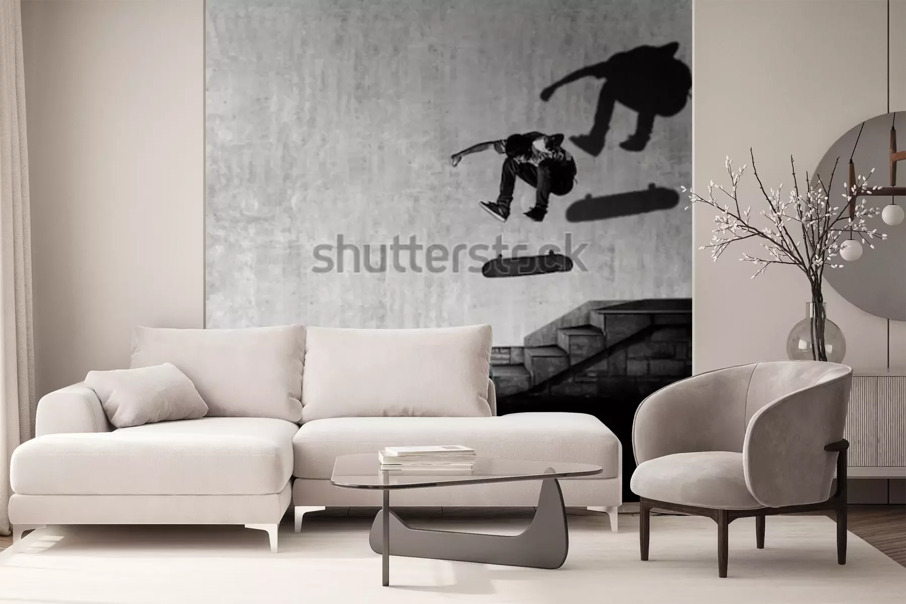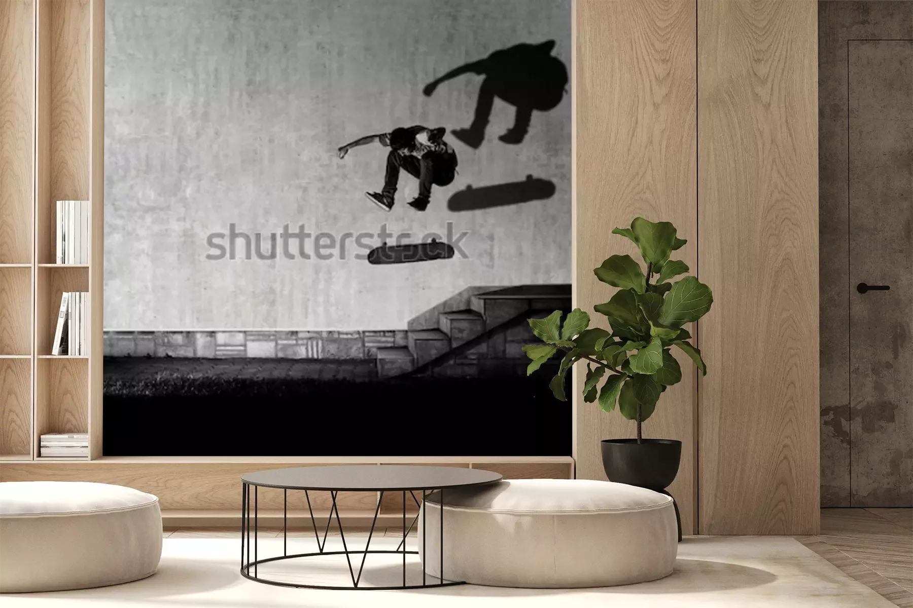 Fotobehang Een skateboarder die een trick over de trap uitvoert