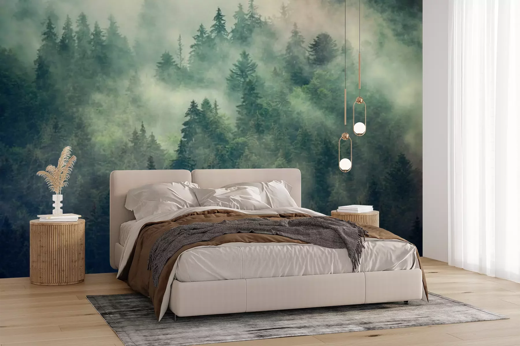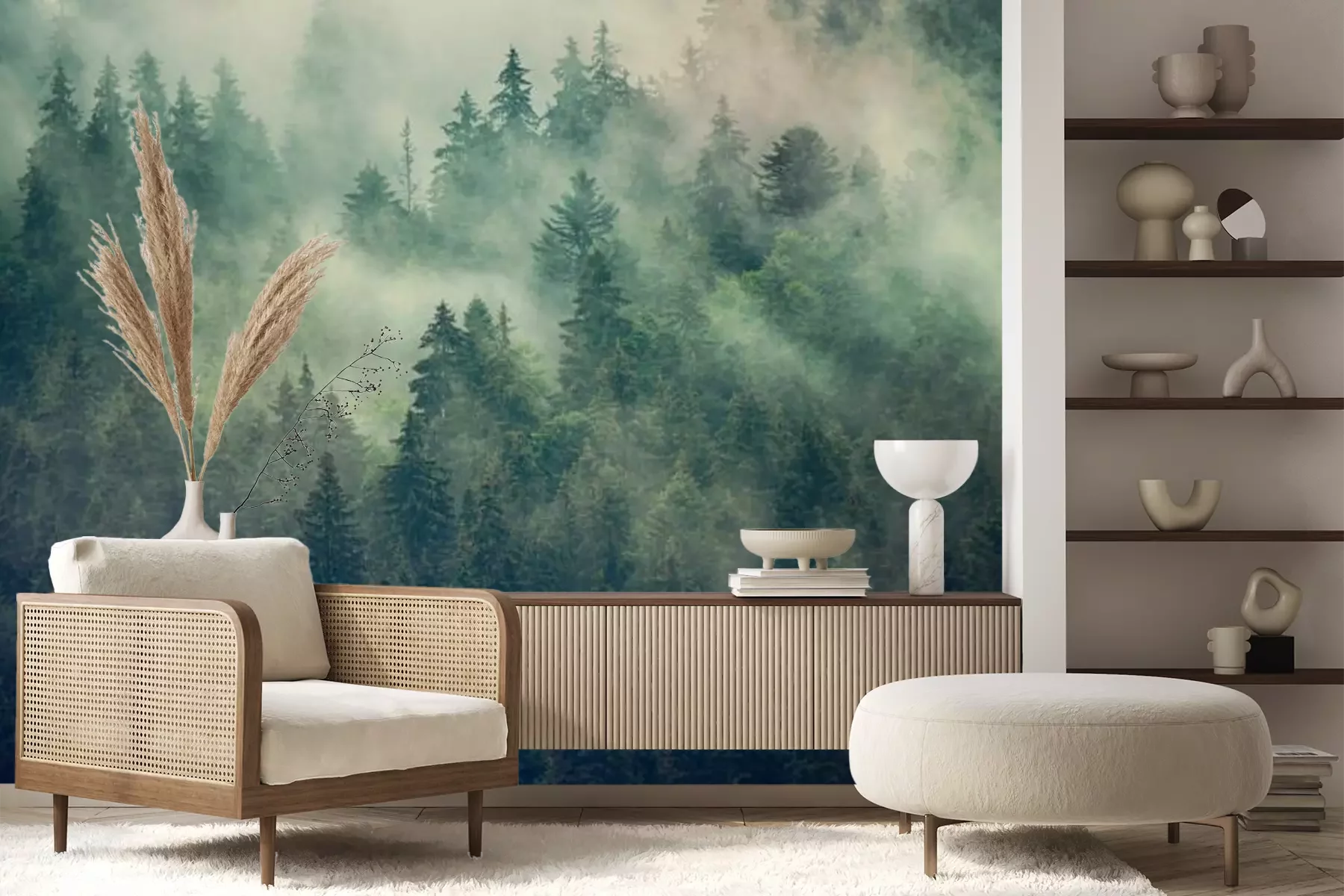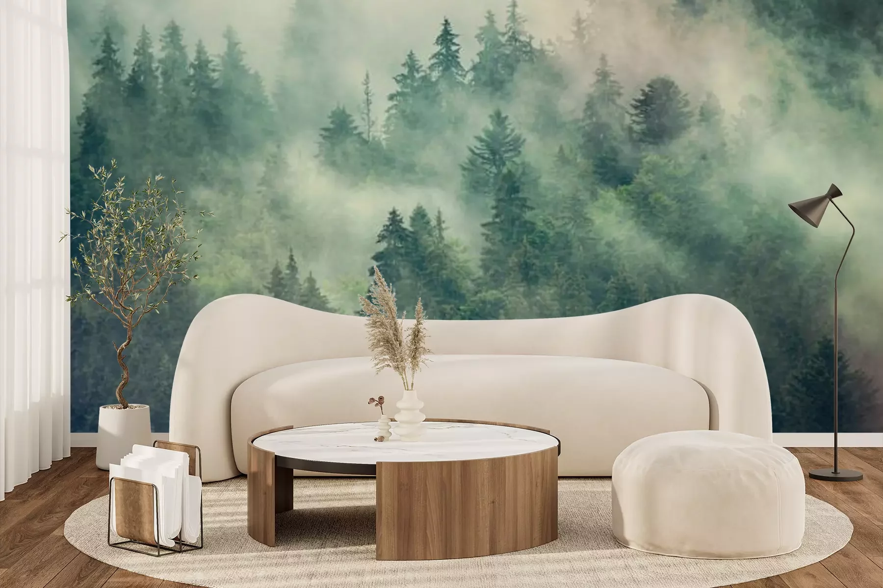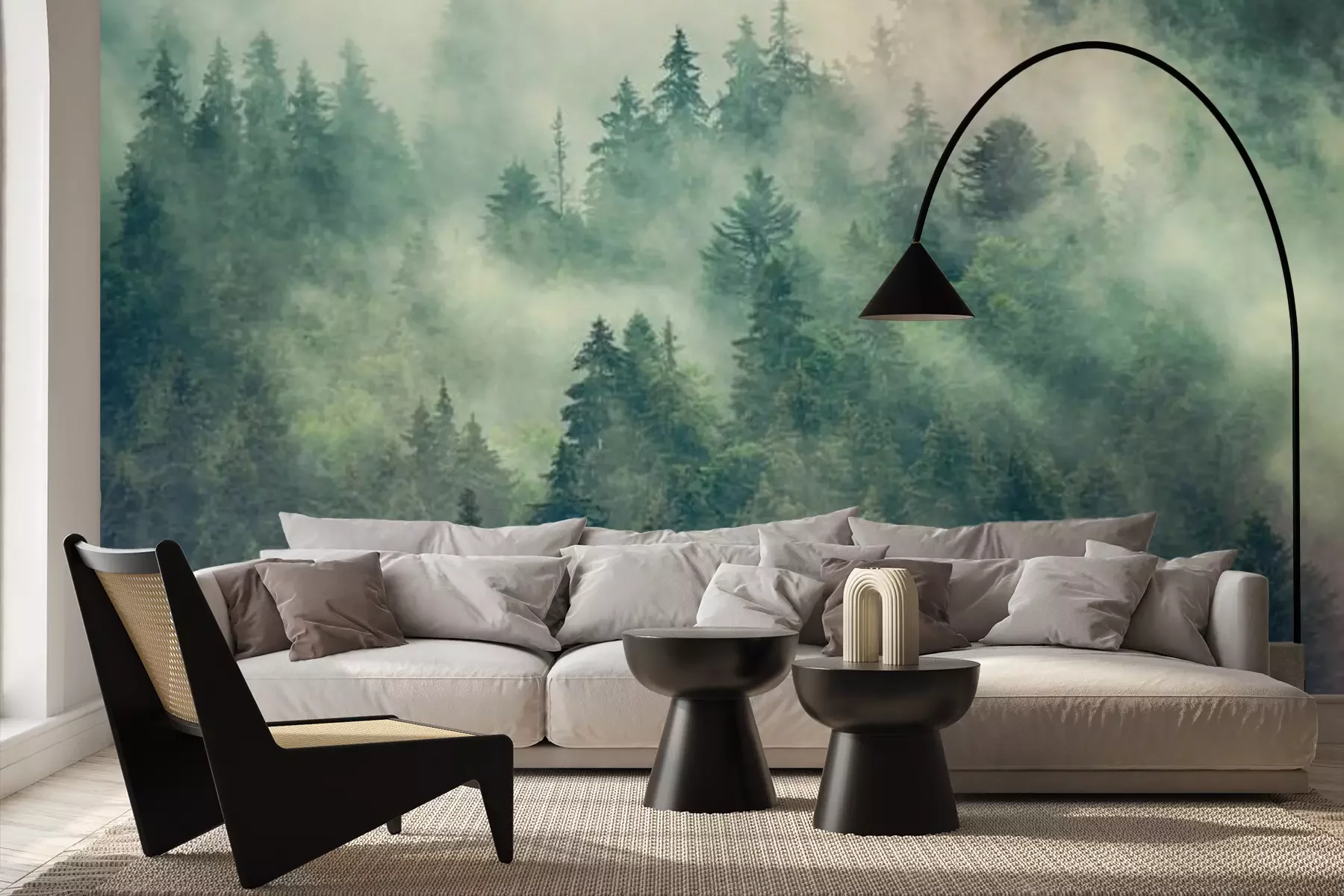 Fotobehang Een sparrenbos gehuld in ochtendmist