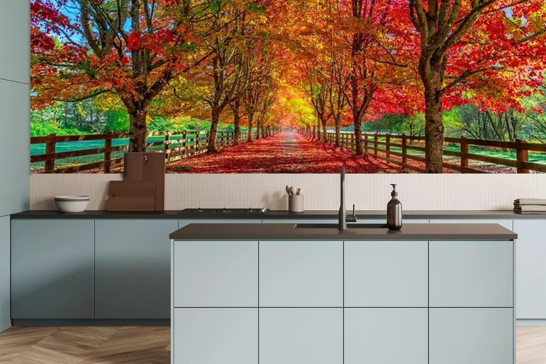 Het materiaal Premium is een glad vinyl op vlies, dat bestand is tegen uitrekken en vervorming. Het is dampdoorlatend – de muren kunnen vrij ademen – waardoor het geschikt is voor gebruik in de keuken en badkamer. Bij vervuiling kan het materiaal worden afgenomen met een vochtige doek. De maximale breedte van één baan bedraagt 95 of 105 cm, afhankelijk van de beschikbaarheid. Montage vindt plaats met de rand-aan-rand methode, wat een esthetisch resultaat zonder zichtbare naden oplevert. Omdat de lijm rechtstreeks op de muur wordt aangebracht, verloopt de installatie van het fotobehang snel en eenvoudig.