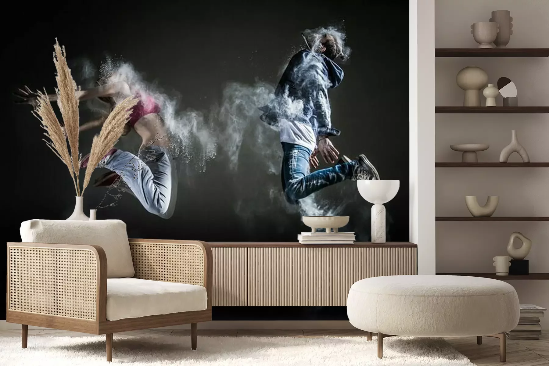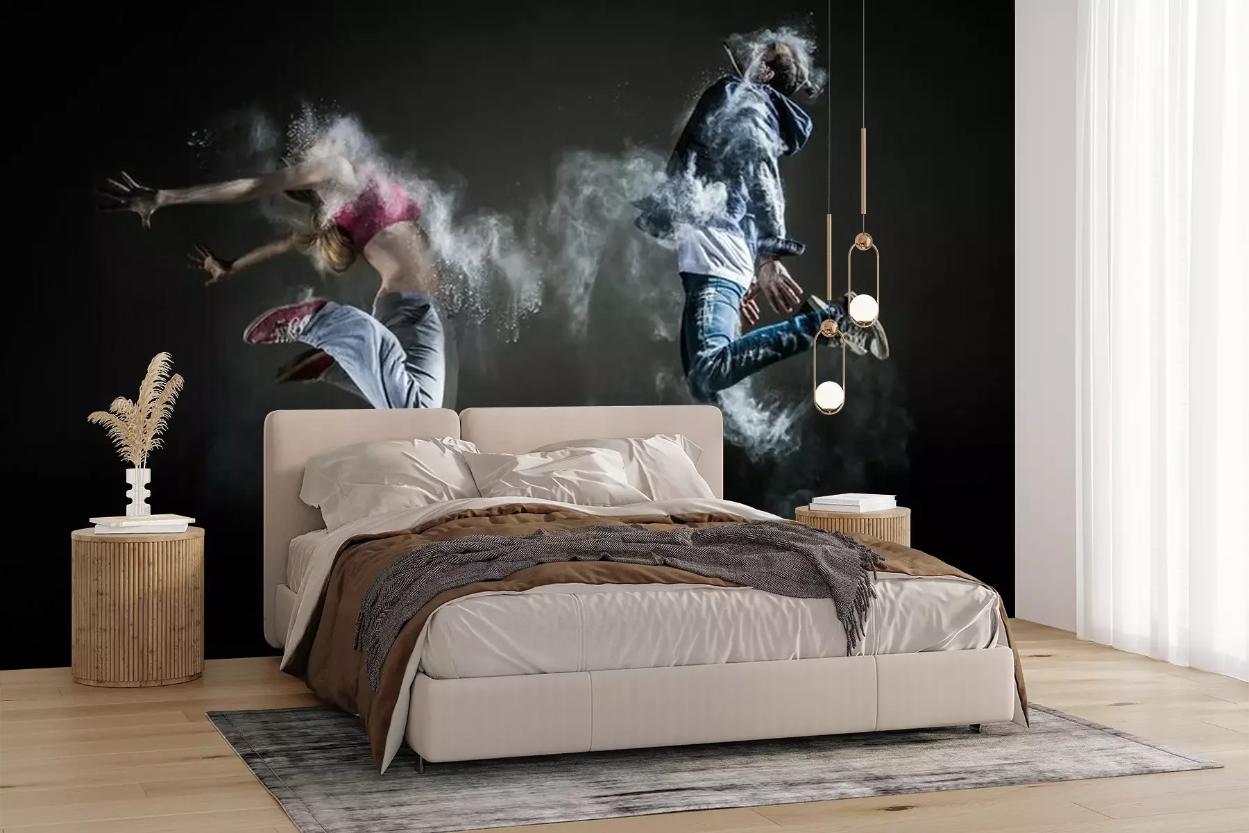 Het materiaal Premium+ is een gestructureerd vinyl op vlies met een gewicht van 255 g/m², dat kleine oneffenheden in de muur effectief camoufleert. De subtiele structuur van fijn zand geeft het oppervlak een exclusieve uitstraling, terwijl de halfmatte afwerking de diepte van de kleuren benadrukt. Het materiaal is dampdoorlatend, waardoor het ook in de keuken en badkamer kan worden gebruikt. De maximale breedte van één baan bedraagt 100 cm – bij grotere afmetingen wordt het fotobehang in meerdere gelijke banen verdeeld. De lijm wordt direct op de muur aangebracht en het behang wordt rand-aan-rand geplakt, wat zorgt voor een esthetisch resultaat zonder zichtbare naden. Het oppervlak kan gemakkelijk worden schoongemaakt door het voorzichtig af te nemen met een vochtige doek.