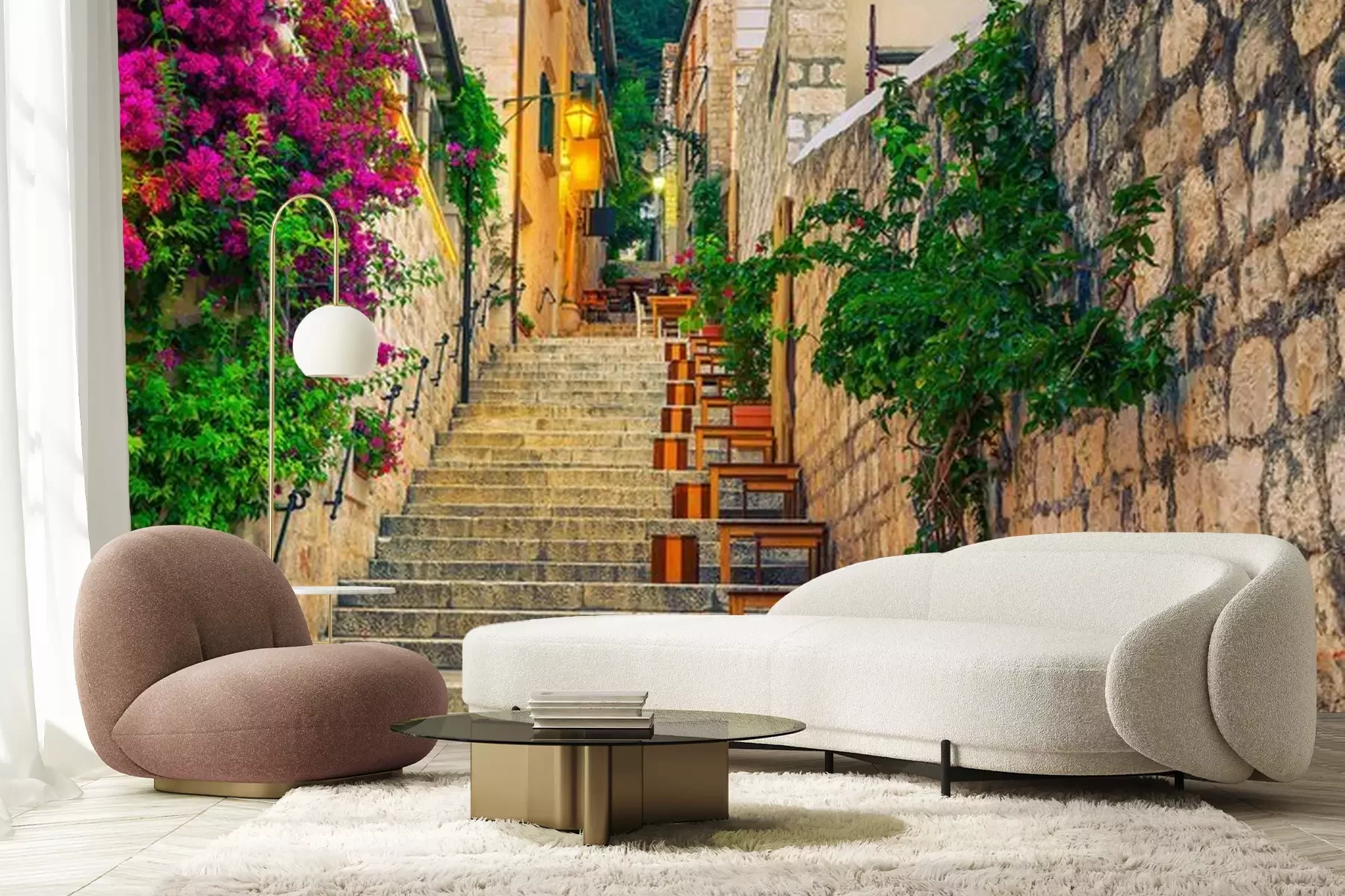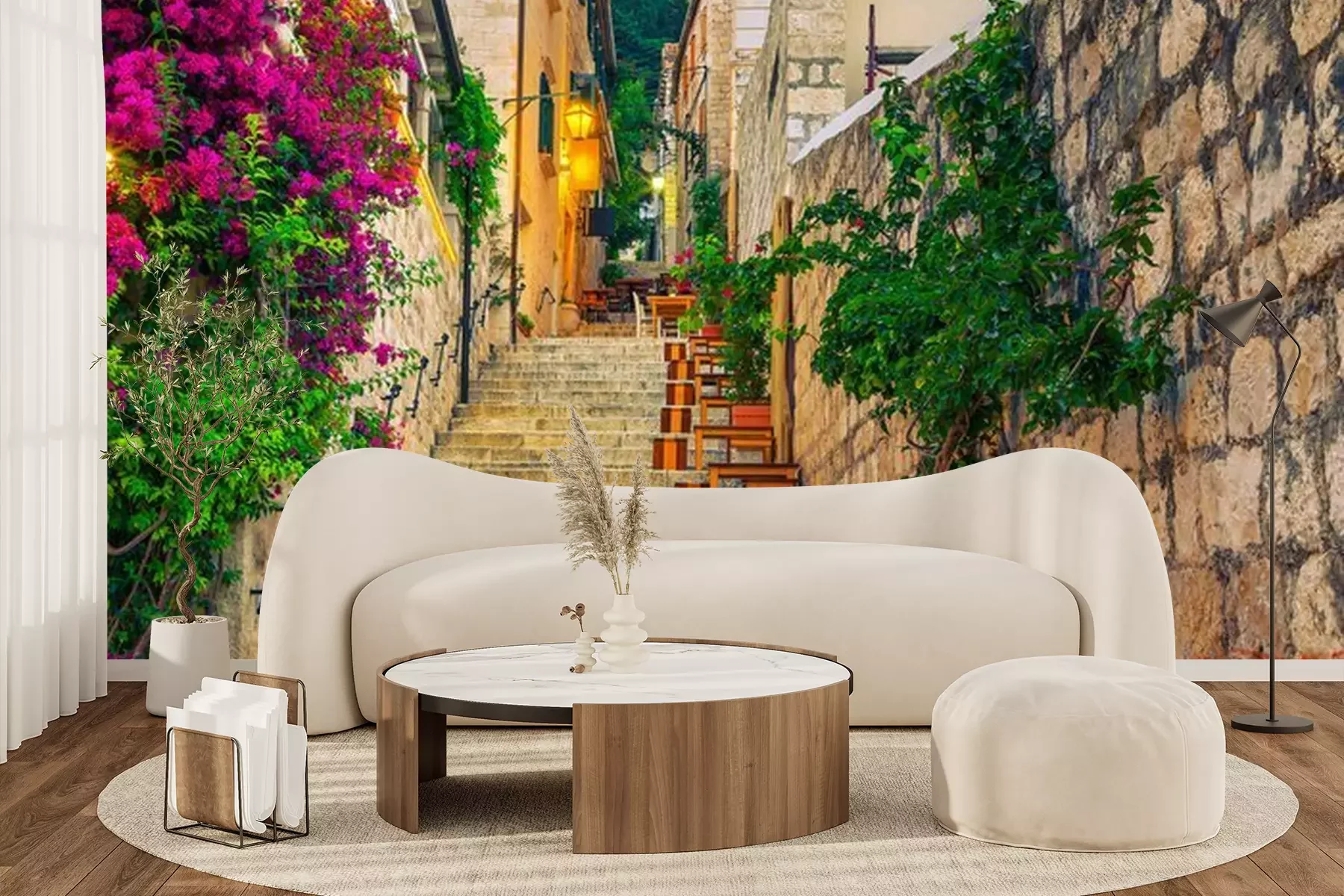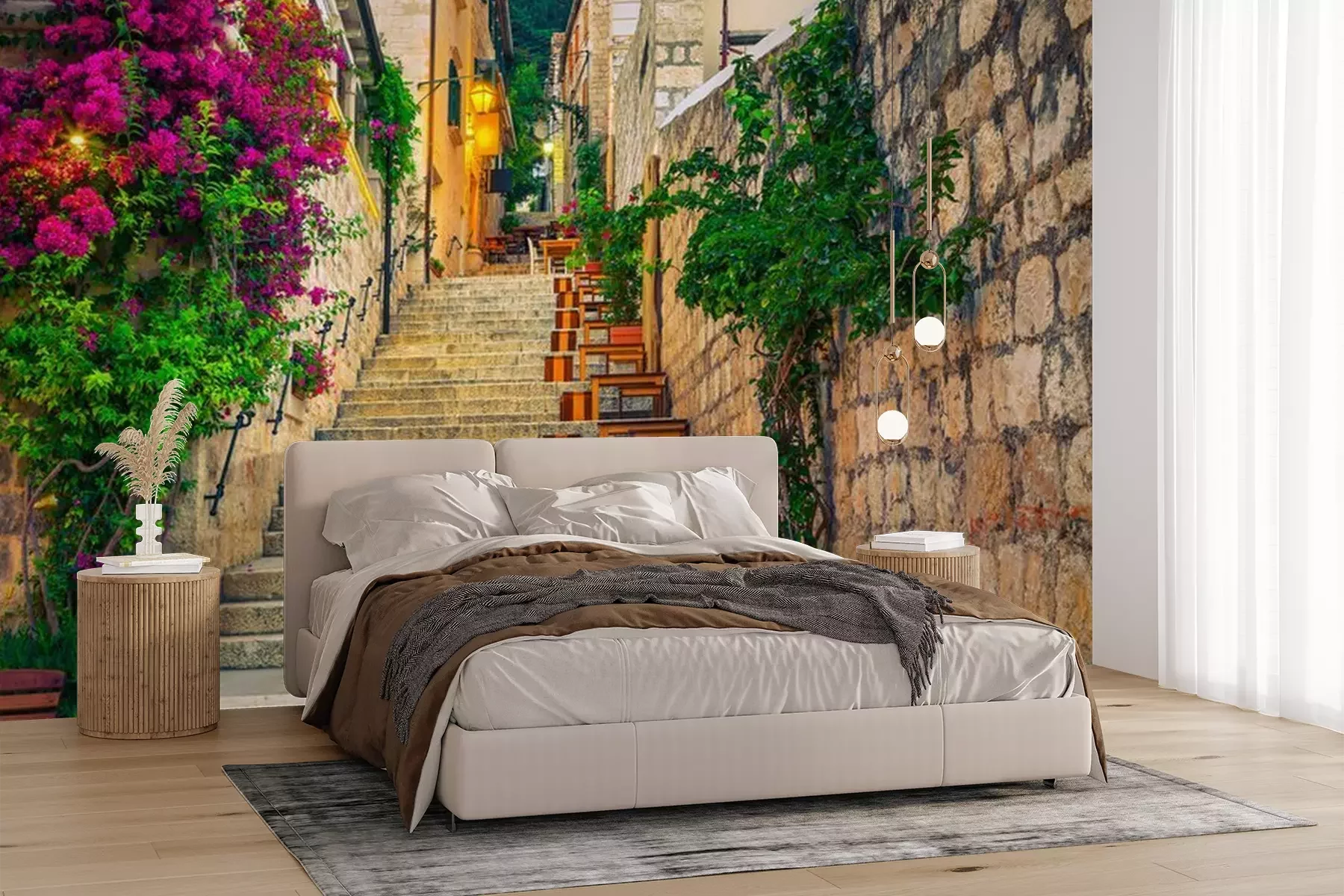 Het materiaal Premium+ is een gestructureerd vinyl op vlies met een gewicht van 255 g/m², dat kleine oneffenheden in de muur effectief camoufleert. De subtiele structuur van fijn zand geeft het oppervlak een exclusieve uitstraling, terwijl de halfmatte afwerking de diepte van de kleuren benadrukt. Het materiaal is dampdoorlatend, waardoor het ook in de keuken en badkamer kan worden gebruikt. De maximale breedte van één baan bedraagt 100 cm – bij grotere afmetingen wordt het fotobehang in meerdere gelijke banen verdeeld. De lijm wordt direct op de muur aangebracht en het behang wordt rand-aan-rand geplakt, wat zorgt voor een esthetisch resultaat zonder zichtbare naden. Het oppervlak kan gemakkelijk worden schoongemaakt door het voorzichtig af te nemen met een vochtige doek.