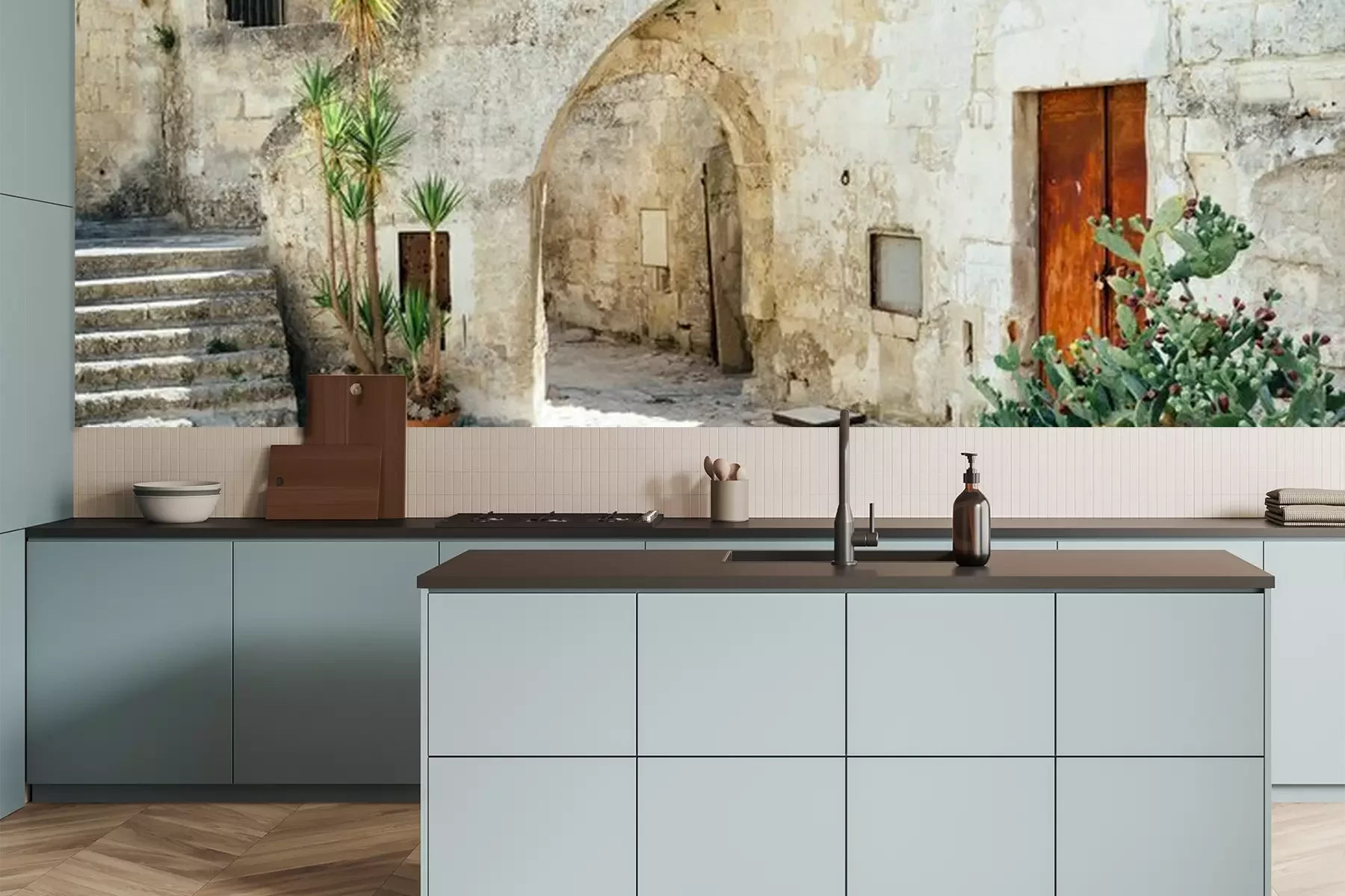 Het materiaal Premium is een glad vinyl op vlies, dat bestand is tegen uitrekken en vervorming. Het is dampdoorlatend – de muren kunnen vrij ademen – waardoor het geschikt is voor gebruik in de keuken en badkamer. Bij vervuiling kan het materiaal worden afgenomen met een vochtige doek. De maximale breedte van één baan bedraagt 95 of 105 cm, afhankelijk van de beschikbaarheid. Montage vindt plaats met de rand-aan-rand methode, wat een esthetisch resultaat zonder zichtbare naden oplevert. Omdat de lijm rechtstreeks op de muur wordt aangebracht, verloopt de installatie van het fotobehang snel en eenvoudig.