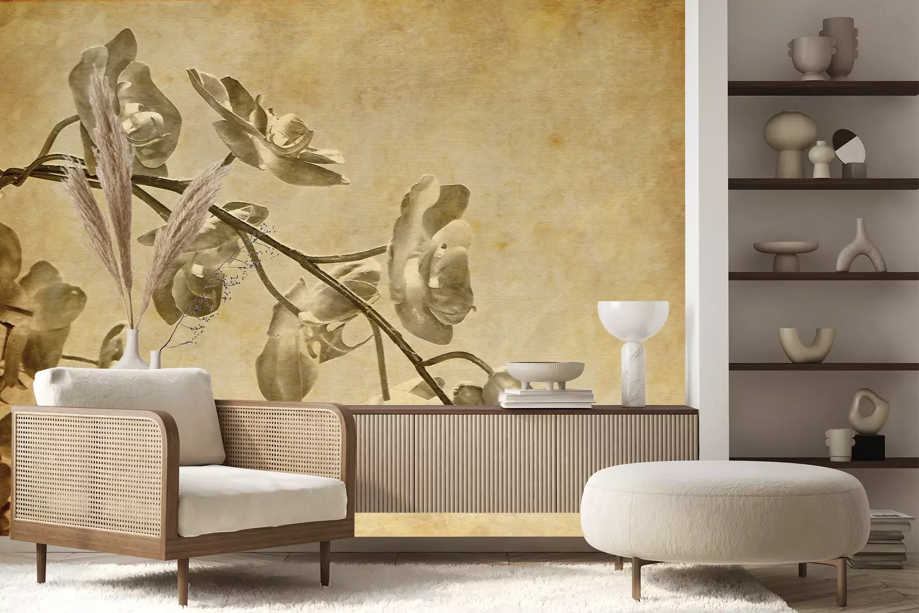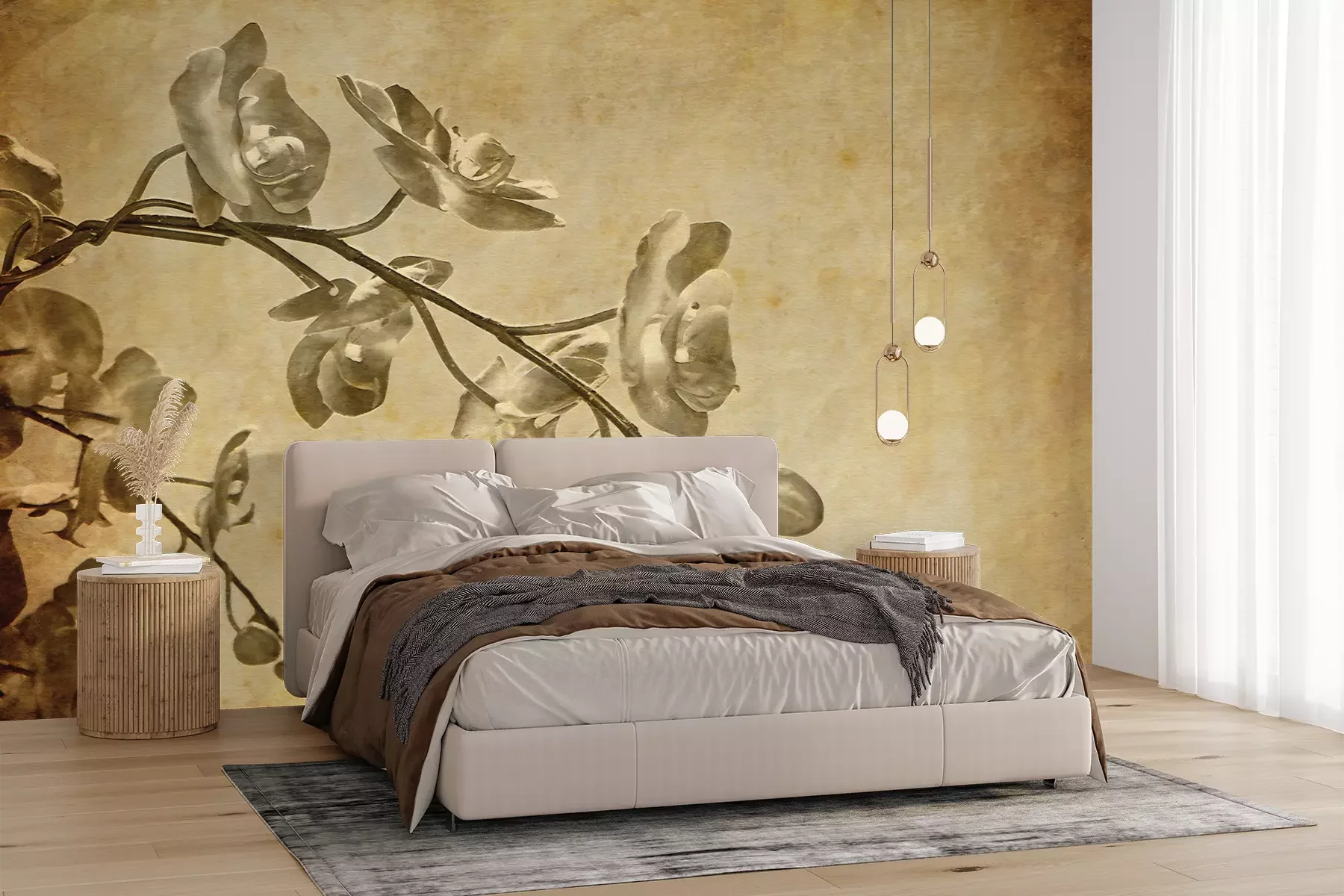 Het materiaal Premium+ is een gestructureerd vinyl op vlies met een gewicht van 255 g/m², dat kleine oneffenheden in de muur effectief camoufleert. De subtiele structuur van fijn zand geeft het oppervlak een exclusieve uitstraling, terwijl de halfmatte afwerking de diepte van de kleuren benadrukt. Het materiaal is dampdoorlatend, waardoor het ook in de keuken en badkamer kan worden gebruikt. De maximale breedte van één baan bedraagt 100 cm – bij grotere afmetingen wordt het fotobehang in meerdere gelijke banen verdeeld. De lijm wordt direct op de muur aangebracht en het behang wordt rand-aan-rand geplakt, wat zorgt voor een esthetisch resultaat zonder zichtbare naden. Het oppervlak kan gemakkelijk worden schoongemaakt door het voorzichtig af te nemen met een vochtige doek.