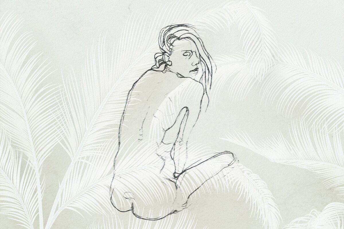 Fotobehang: Een tekening van een vrouwenfiguur omringd door palmbladeren.