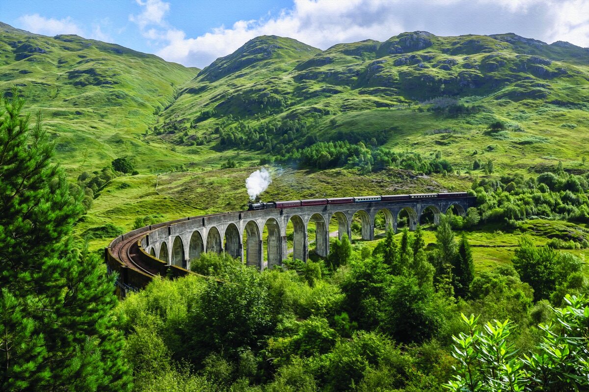 Fotobehang: Een trein rijdt over een brug in een bergachtig landschap