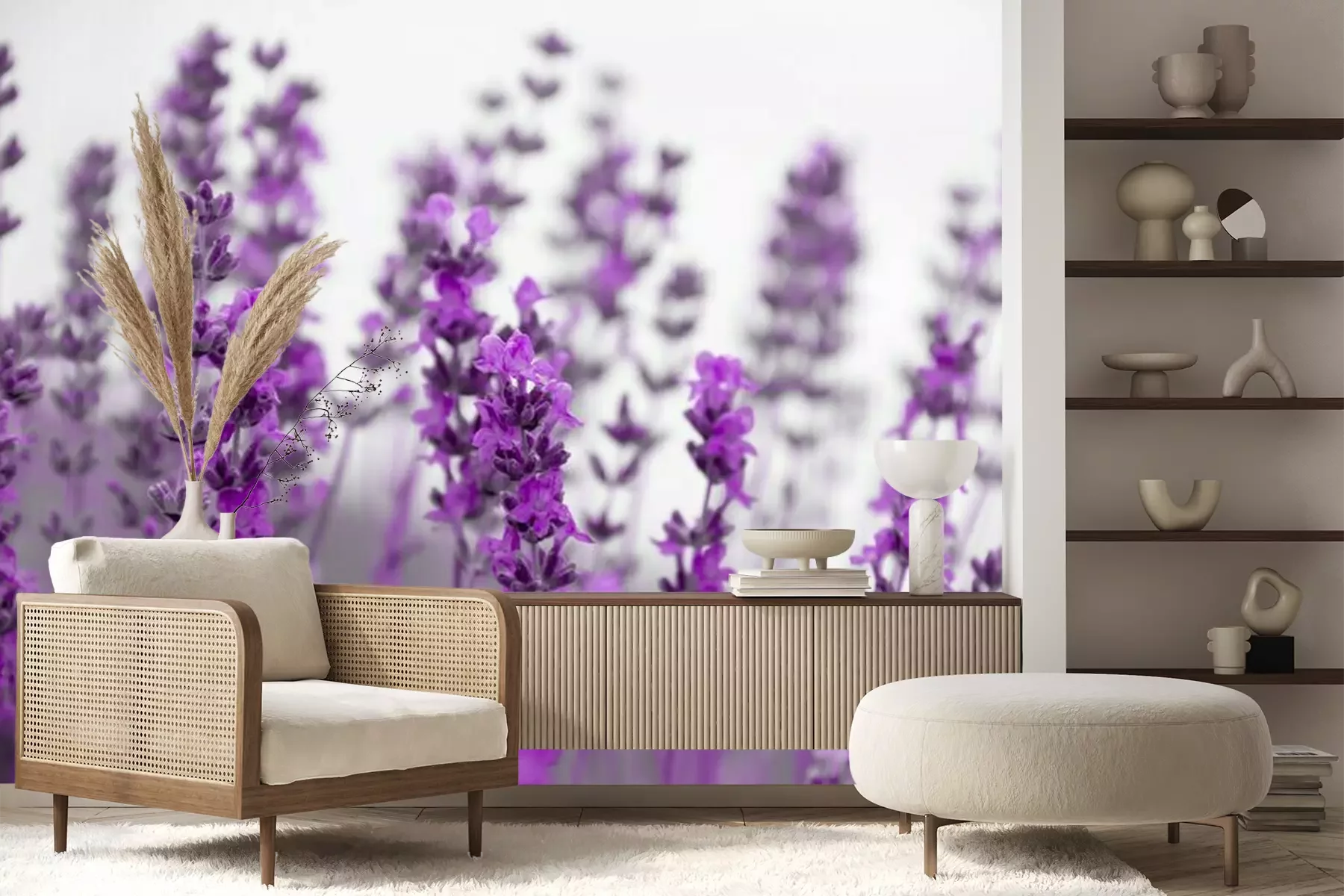 Het materiaal Premium+ is een gestructureerd vinyl op vlies met een gewicht van 255 g/m², dat kleine oneffenheden in de muur effectief camoufleert. De subtiele structuur van fijn zand geeft het oppervlak een exclusieve uitstraling, terwijl de halfmatte afwerking de diepte van de kleuren benadrukt. Het materiaal is dampdoorlatend, waardoor het ook in de keuken en badkamer kan worden gebruikt. De maximale breedte van één baan bedraagt 100 cm – bij grotere afmetingen wordt het fotobehang in meerdere gelijke banen verdeeld. De lijm wordt direct op de muur aangebracht en het behang wordt rand-aan-rand geplakt, wat zorgt voor een esthetisch resultaat zonder zichtbare naden. Het oppervlak kan gemakkelijk worden schoongemaakt door het voorzichtig af te nemen met een vochtige doek.