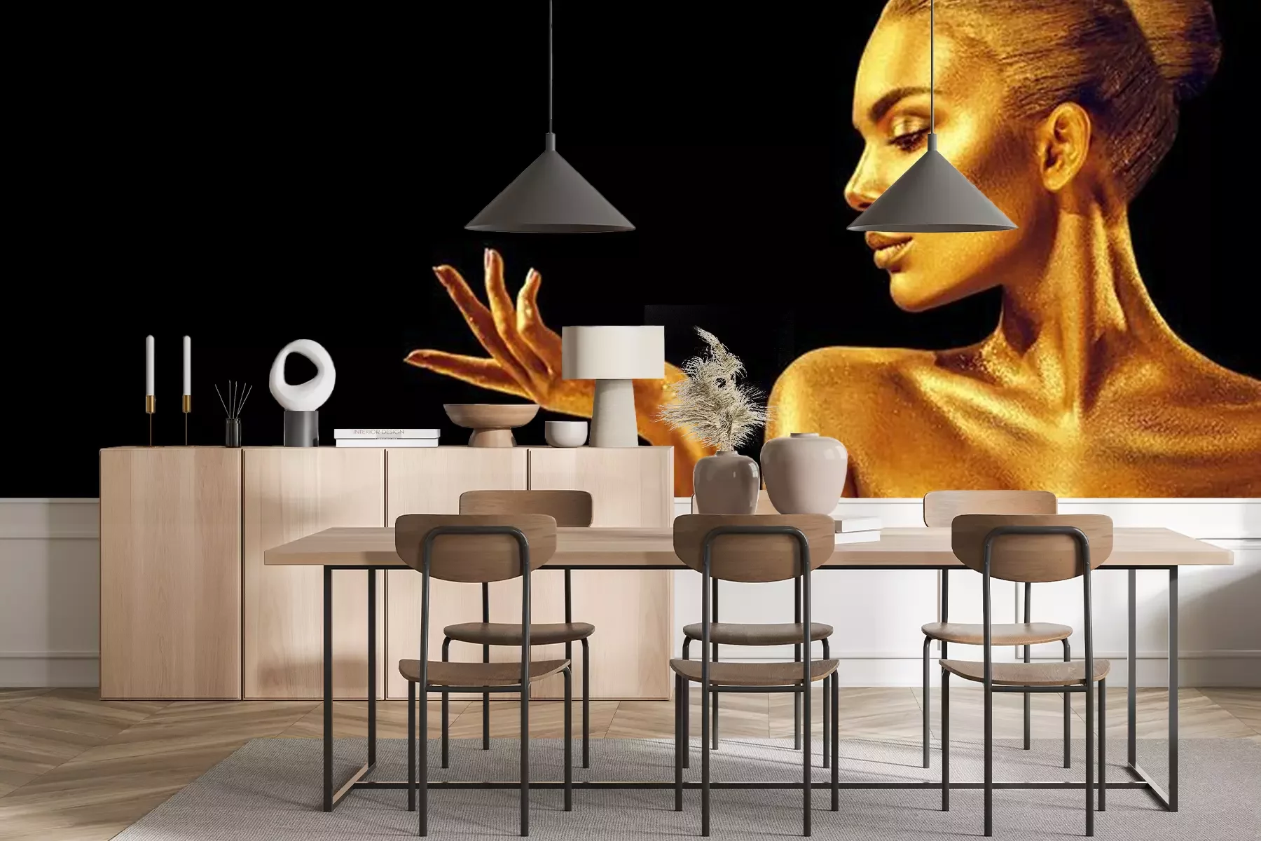 Het materiaal Premium+ is een gestructureerd vinyl op vlies met een gewicht van 255 g/m², dat kleine oneffenheden in de muur effectief camoufleert. De subtiele structuur van fijn zand geeft het oppervlak een exclusieve uitstraling, terwijl de halfmatte afwerking de diepte van de kleuren benadrukt. Het materiaal is dampdoorlatend, waardoor het ook in de keuken en badkamer kan worden gebruikt. De maximale breedte van één baan bedraagt 100 cm – bij grotere afmetingen wordt het fotobehang in meerdere gelijke banen verdeeld. De lijm wordt direct op de muur aangebracht en het behang wordt rand-aan-rand geplakt, wat zorgt voor een esthetisch resultaat zonder zichtbare naden. Het oppervlak kan gemakkelijk worden schoongemaakt door het voorzichtig af te nemen met een vochtige doek.
