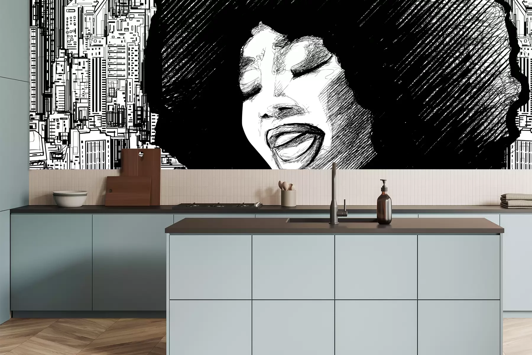 Het materiaal Premium is een glad vinyl op vlies, dat bestand is tegen uitrekken en vervorming. Het is dampdoorlatend – de muren kunnen vrij ademen – waardoor het geschikt is voor gebruik in de keuken en badkamer. Bij vervuiling kan het materiaal worden afgenomen met een vochtige doek. De maximale breedte van één baan bedraagt 95 of 105 cm, afhankelijk van de beschikbaarheid. Montage vindt plaats met de rand-aan-rand methode, wat een esthetisch resultaat zonder zichtbare naden oplevert. Omdat de lijm rechtstreeks op de muur wordt aangebracht, verloopt de installatie van het fotobehang snel en eenvoudig.