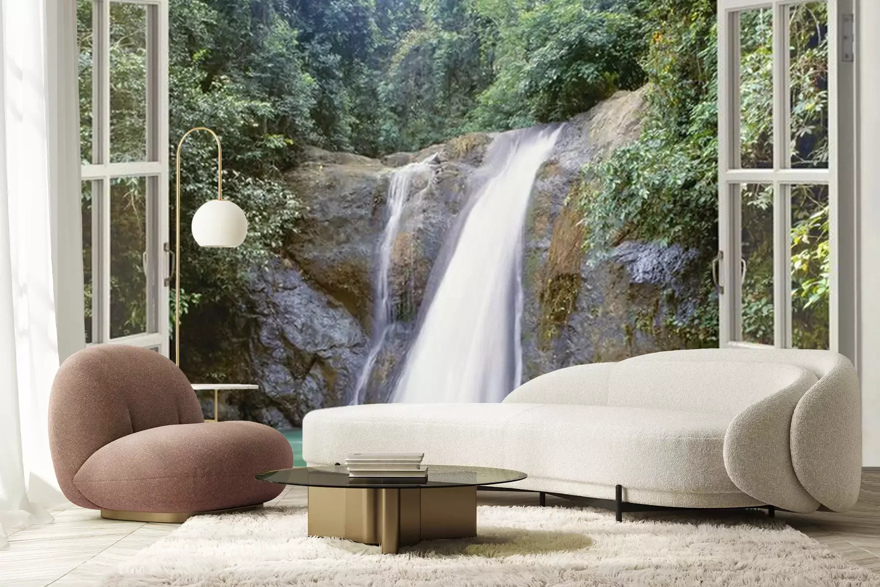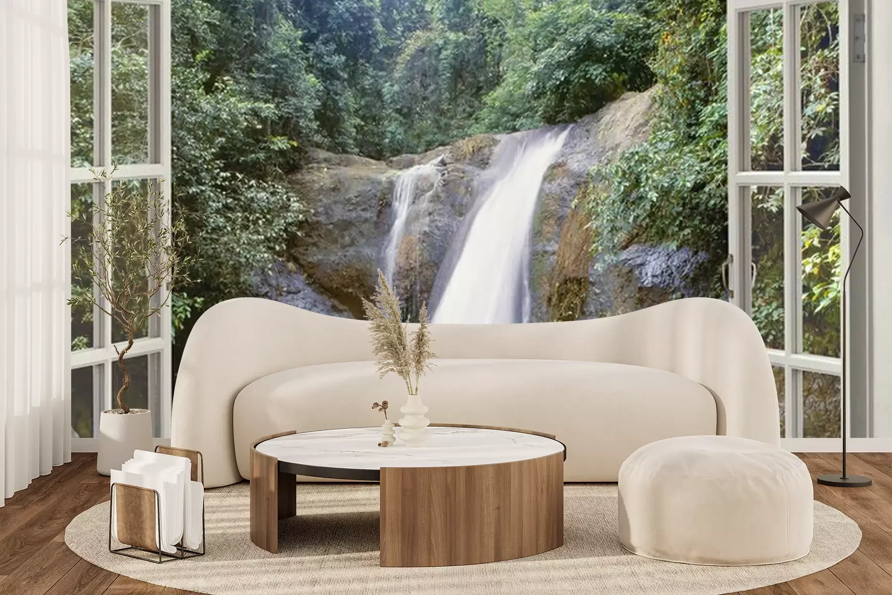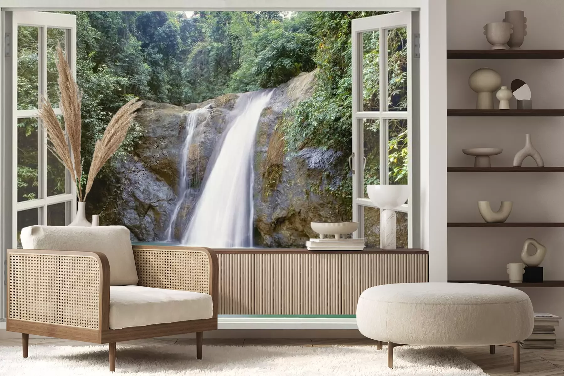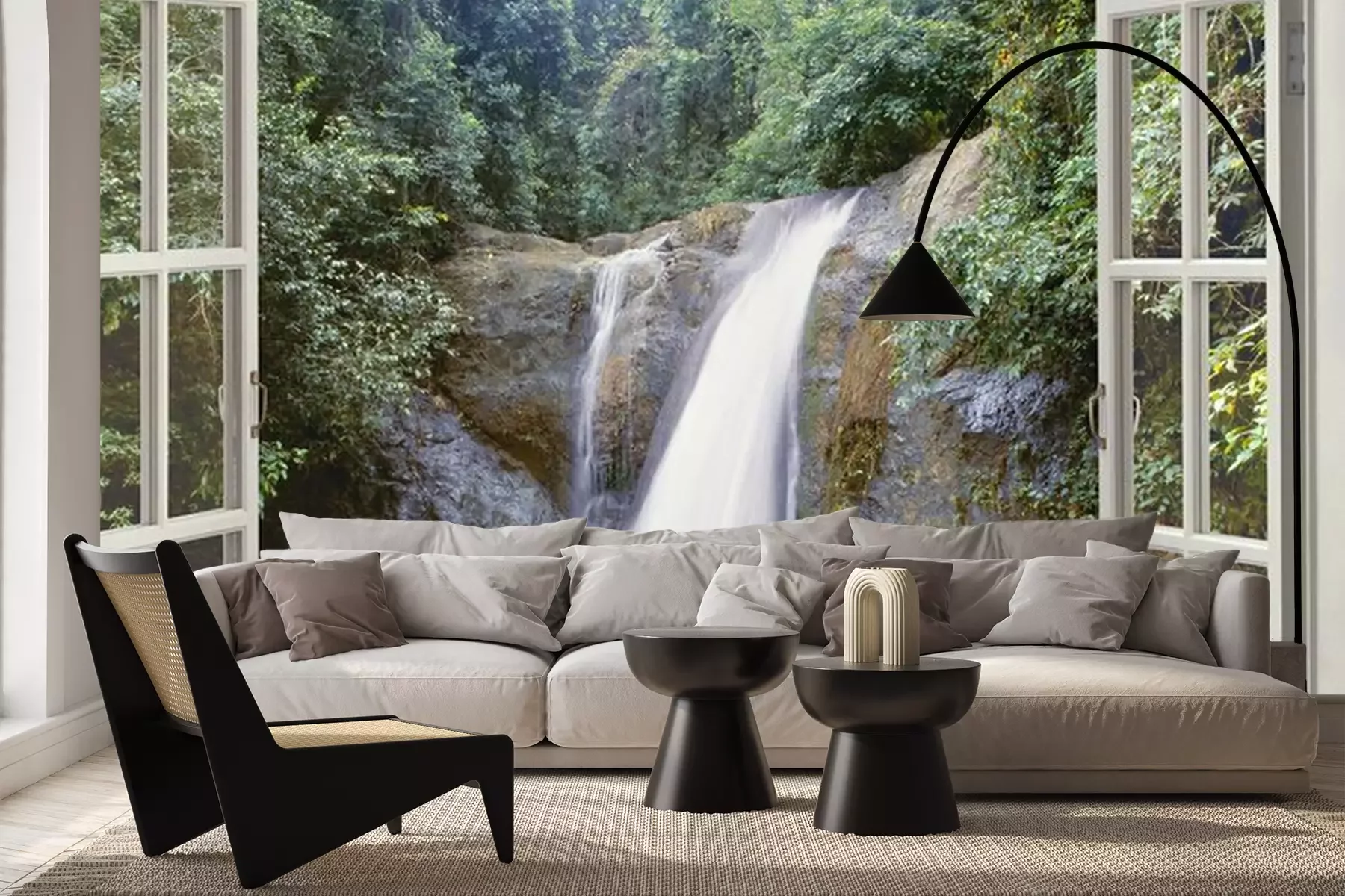 Uitzicht op de waterval vanuit een open raamFotobehang
