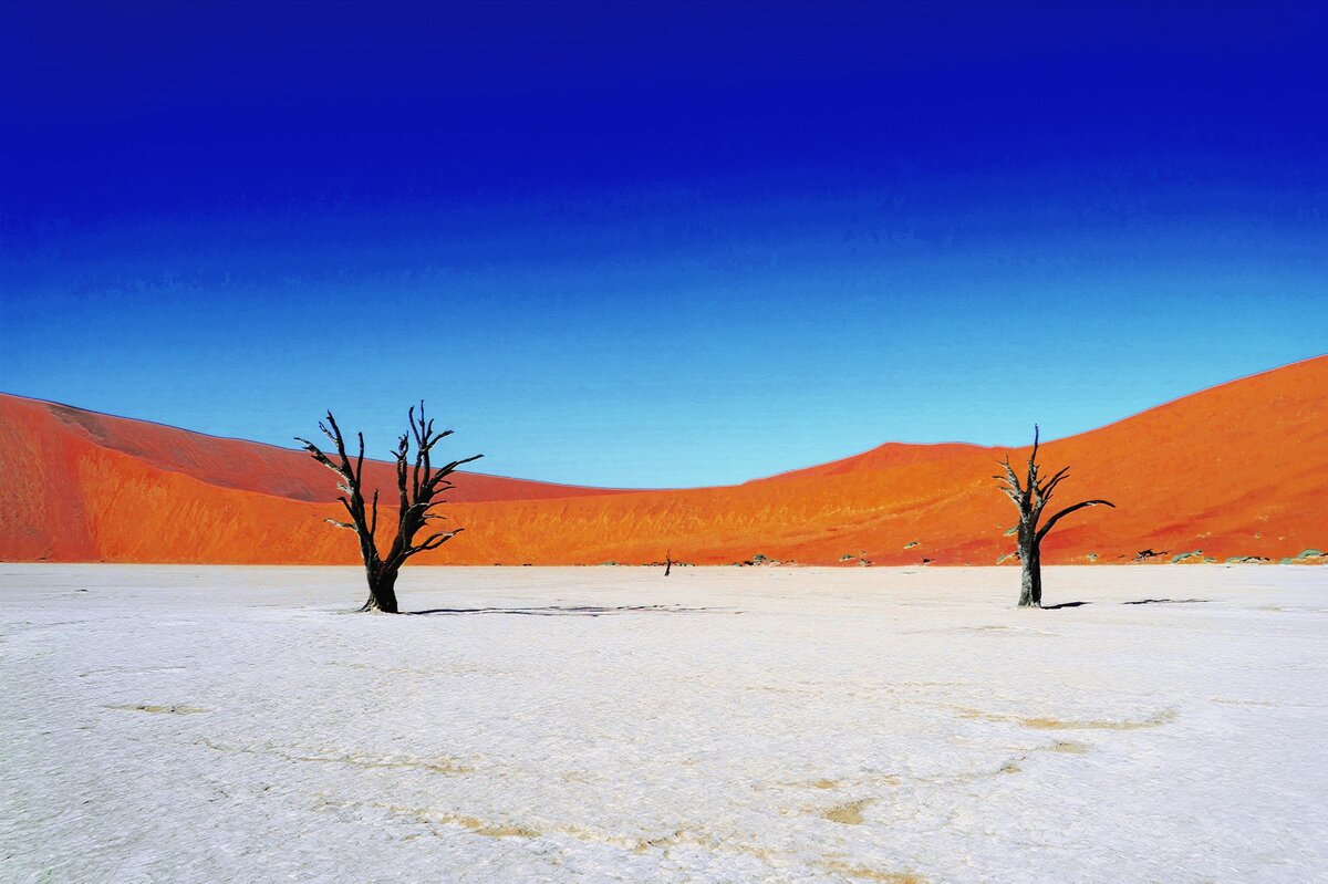 Fotobehang: Een woestijnlandschap met droge bomen en heuvels
